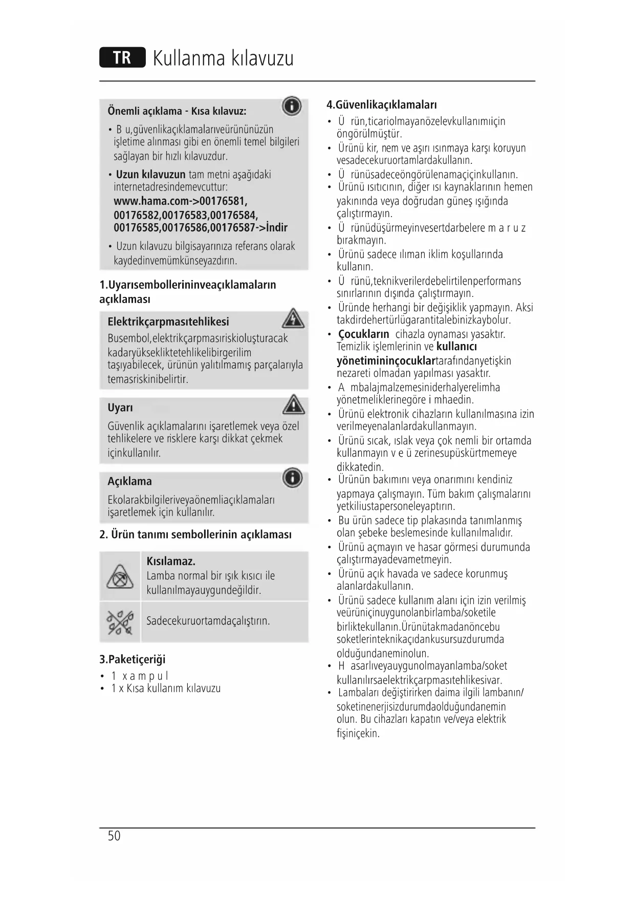 - Uzun kılavuzun tam metni aşağıdaki internet adresinde mevcuttur: www.hama.com -> 00176581, 00176582, 00176583, 00176584, 00176585, 00176586, 00176587 -> İndir