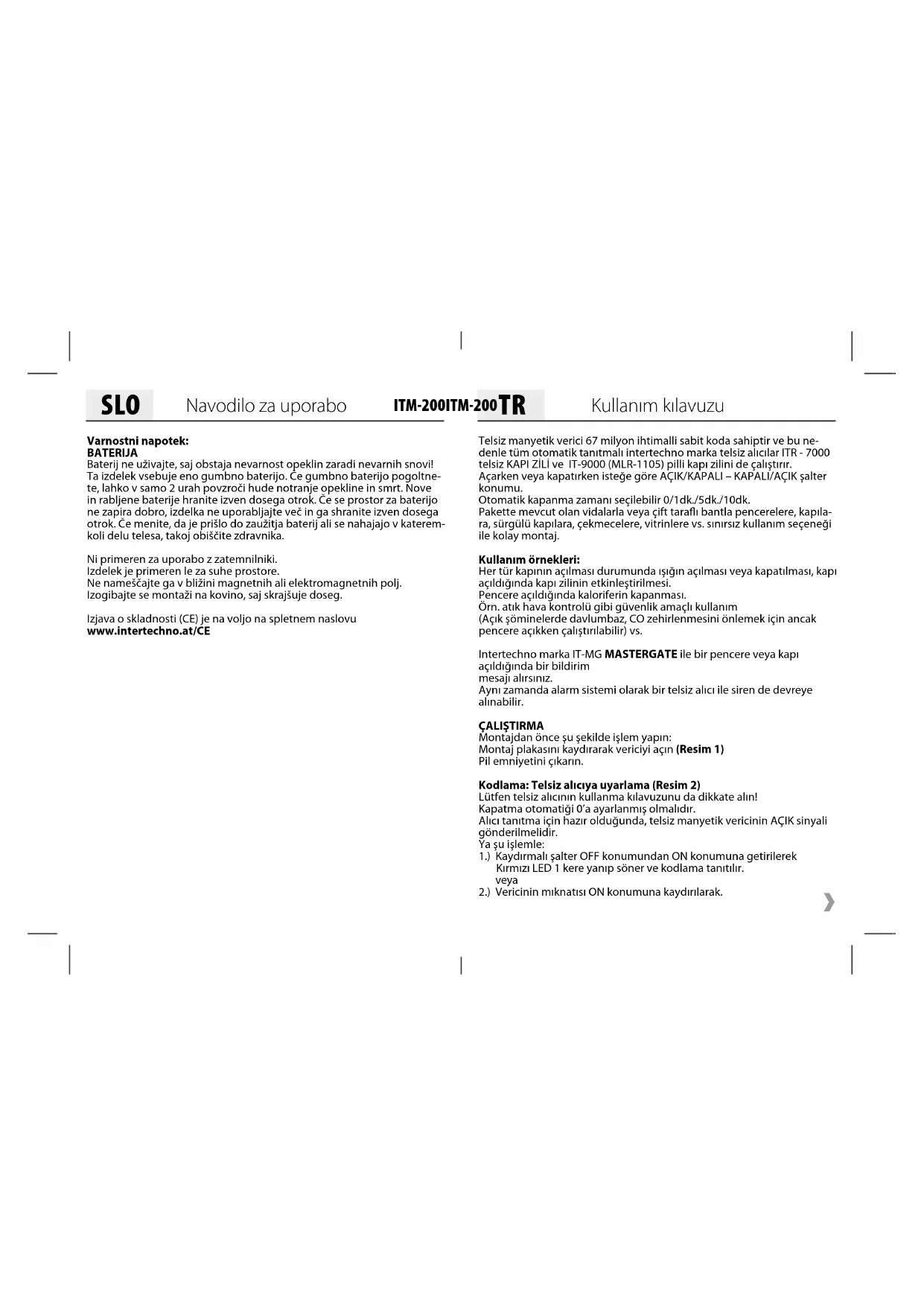 Telsiz manyetik verici 67 milyon ihtimalli sabit koda sahiptir ve bu ne- denle tüm otomatik tanıtmalı intertechno marka telsiz alıcılar ITR - 7000 telsiz KAPI ZİLİ ve IT-9000 (MLR-1105) pilli kapı zilini de çalıştırır. Açarken veya kapatırken isteğe göre AÇIK/KAPALI – KAPALI/AÇIK şalter konumu. Otomatik kapanma zamanı seçilebilir 0/1dk./5dk./10dk. Pakette mevcut olan vidalarla veya çift taraflı bantla pencerelere, kapıla- ra, sürgülü kapılara, çekmecelere, vitrinlere vs. sınırsız kullanım seçeneği ile kolay montaj. Kullanım örnekleri: Her tür kapının açılması durumunda ışığın açılması veya kapatılması, kapı açıldığında kapı zilinin etkinleştirilmesi. Pencere açıldığında kaloriferin kapanması. Örn. atık hava kontrolü gibi güvenlik amaçlı kullanım (Açık şöminelerde davlumbaz, CO zehirlenmesini önlemek için ancak pencere açıkken çalıştırılabilir) vs. Intertechno marka IT-MG MASTERGATE ile bir pencere veya kapı açıldığında bir bildirim mesajı alırsınız. Aynı zamanda alarm sistemi olarak bir telsiz alıcı ile siren de devreye alınabilir. ÇALIŞTIRMA Montajdan önce şu şekilde işlem yapın: Montaj plakasını kaydırarak vericiyi açın (Resim 1) Pil emniyetini çıkarın. Kodlama: Telsiz alıcıya uyarlama (Resim 2) Lütfen telsiz alıcının kullanma kılavuzunu da dikkate alın! Kapatma otomatiği 0’a ayarlanmış olmalıdır. Alıcı tanıtma için hazır olduğunda, telsiz manyetik vericinin AÇIK sinyali gönderilmelidir. Ya şu işlemle: 1.) Kaydırmalı şalter OFF konumundan ON konumuna getirilerek Kırmızı LED 1 kere yanıp söner ve kodlama tanıtılır. veya 2.) Vericinin mıknatısı ON konumuna kaydırılarak.