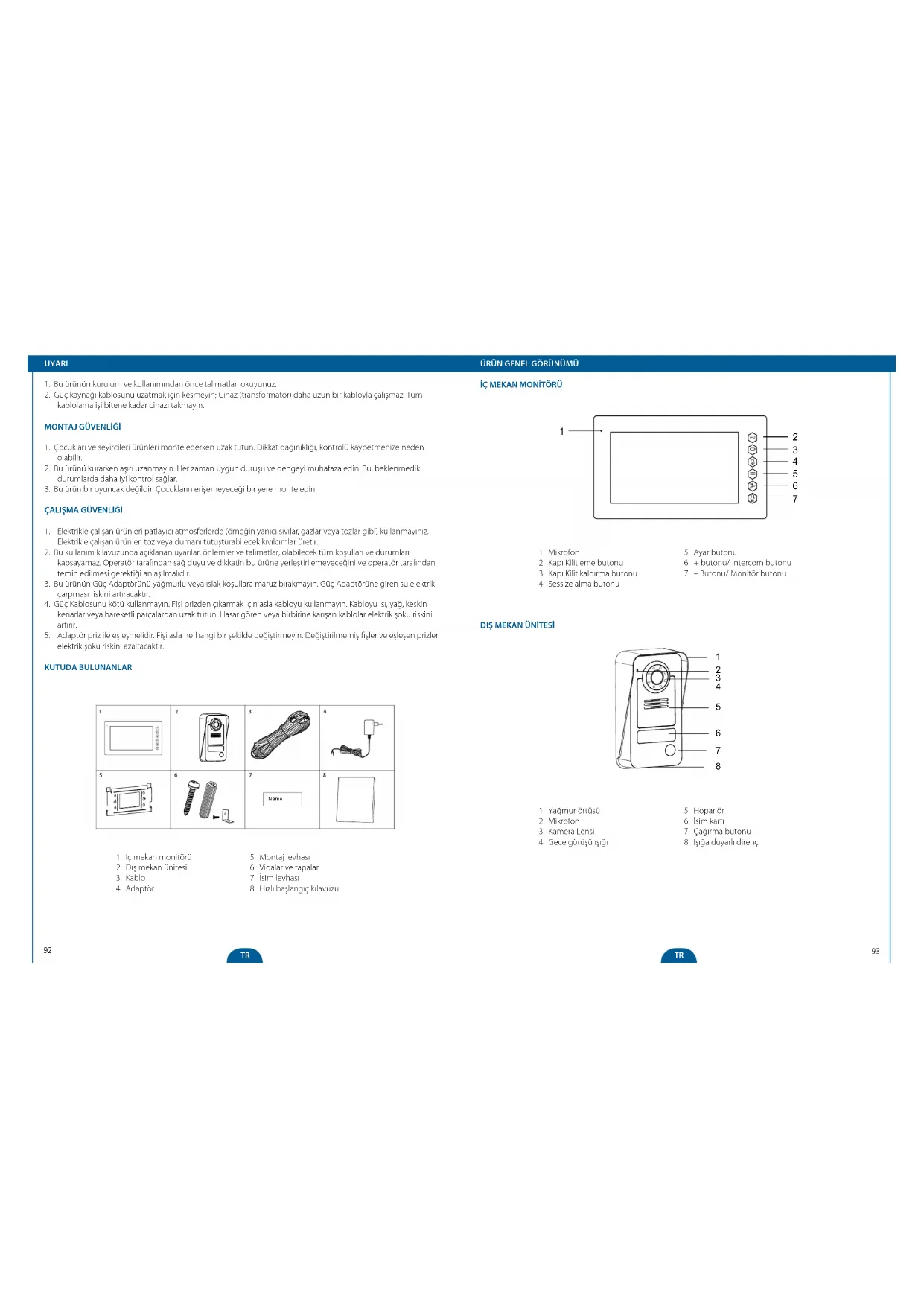 KULLANIM İntercom fonksiyonu: Bekleme modundayken bir ziyaretçi dış mekan ünitesinin çağrı butonuna bastığında iç mekan monitörü çalacak ve ekranda ziyaretçilerin canlı görüntüsünü göreceksiniz. Ziyaretçiyle konuşmak için interkom butonuna basın. Monitör fonksiyonu: Dış mekan ünitesi kamerasının canlı görüntüsünü görmek için iç mekan-monitör ünitesindeki bu butona basın. Kilit açma: Ziyaretçiyi belirledikten sonra ona kapıyı açmak için kilit açma butonuna basın. Sessize alma anahtarı: Rahatsız edilmek istemediğinizde zil sessize alınabilir. Sessize alma fonksiyonunu açmak veya kapamak için butona basın. Sessiz alma etkinleştirildiğinde sessize alma LED’i yanar. AYARLAR Ana menüde ilerlemek için Ayar butonu ile + ve – butonlarını kullanın. + ve – butonlarıyla değişiklik yapın ve Ayar butonuyla onaylayın. Aşağıdaki ayarları yapabilirsiniz: Parlaklık Zıtlık Renk Zil seviyesi Zil tonu TRTR99