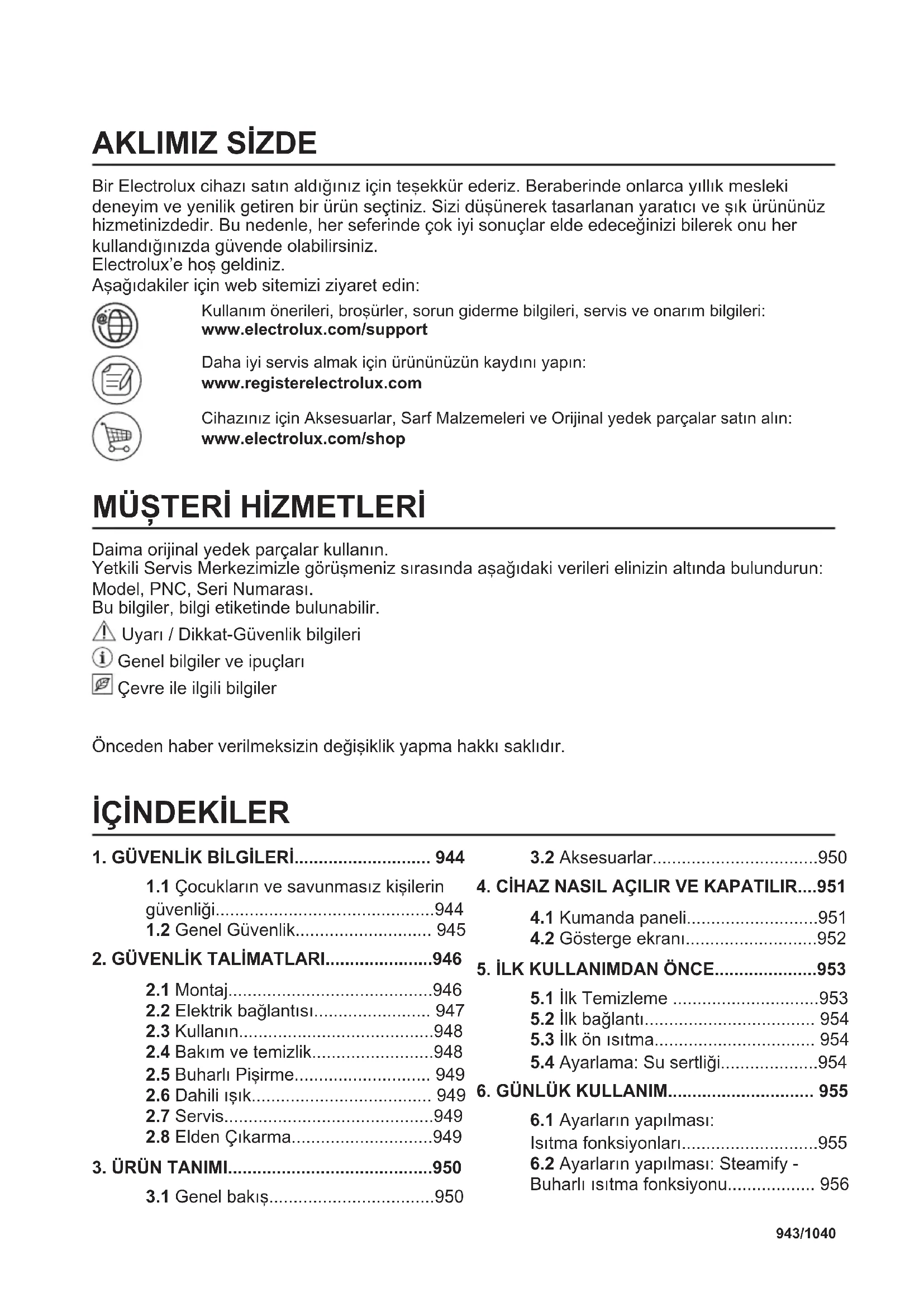 Bir Electrolux cihazı satın aldığınız için teşekkür ederiz. Beraberinde onlarca yıllık mesleki deneyim ve yenilik getiren bir ürün seçtiniz. Sizi düşünerek tasarlanan yaratıcı ve şık ürününüz hizmetinizdedir. Bu nedenle, her seferinde çok iyi sonuçlar elde edeceğinizi bilerek onu her kullandığınızda güvende olabilirsiniz. Electrolux’e hoş geldiniz. Aşağıdakiler için web sitemizi ziyaret edin: Kullanım önerileri, broşürler, sorun giderme bilgileri, servis ve onarım bilgileri: www.electrolux.com/support Daha iyi servis almak için ürününüzün kaydını yapın: www.registerelectrolux.com Cihazınız için Aksesuarlar, Sarf Malzemeleri ve Orijinal yedek parçalar satın alın: www.electrolux.com/shop