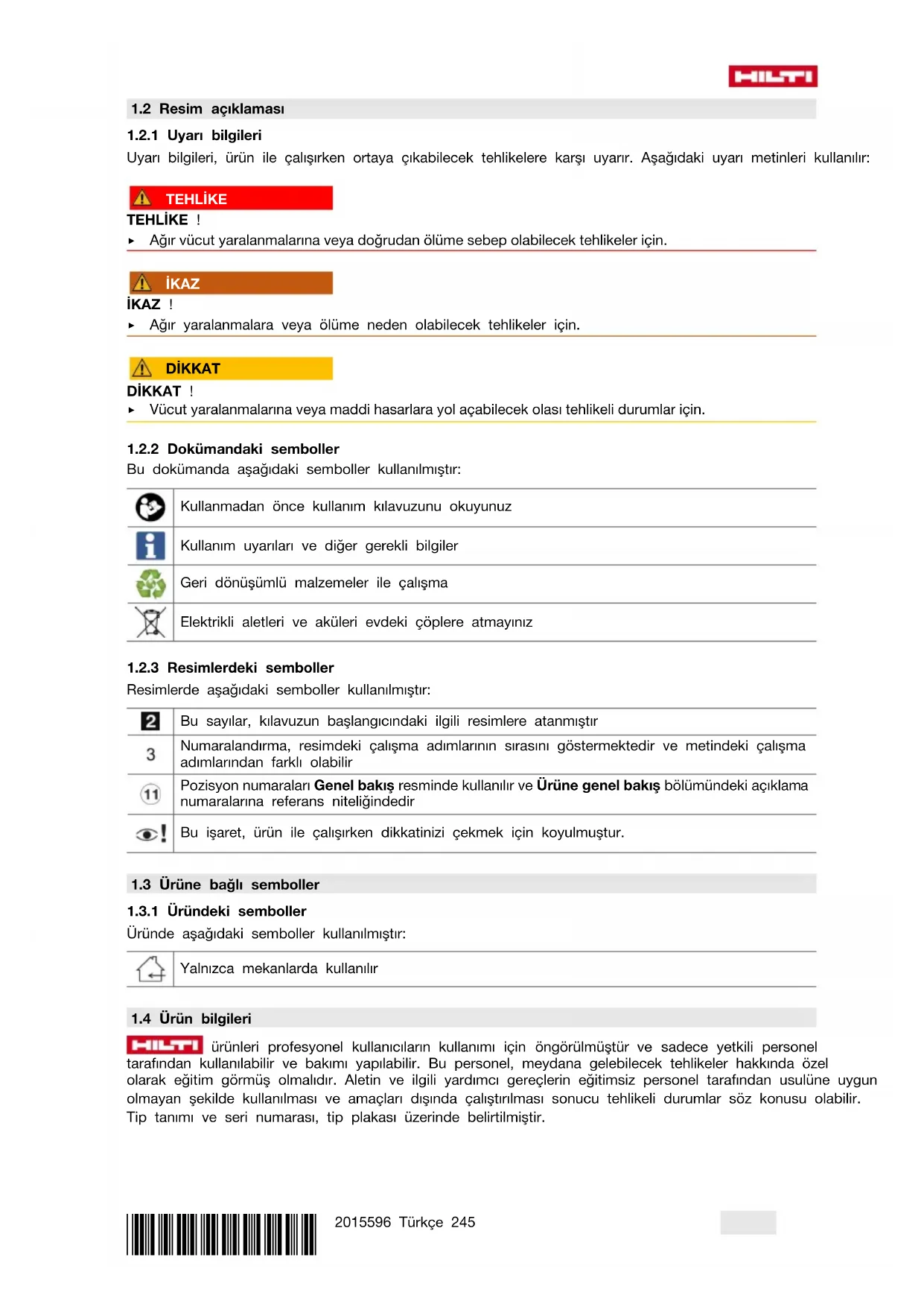 Burada tanımlanan ürünün, geçerli yönetmeliklere ve normlara uygun olduğunu kendi sorumluluğumuzda beyan ederiz. Bu dokümantasyonun sonunda uygunluk beyanının bir kopyasını bulabilirsiniz. Teknik dokümantasyonlar eklidir: Hilti Entwicklungsgesellschaft mbH | Zulassung Geräte | Hiltistraße 6 | 86916 Kaufering, DE 2 Güvenlik