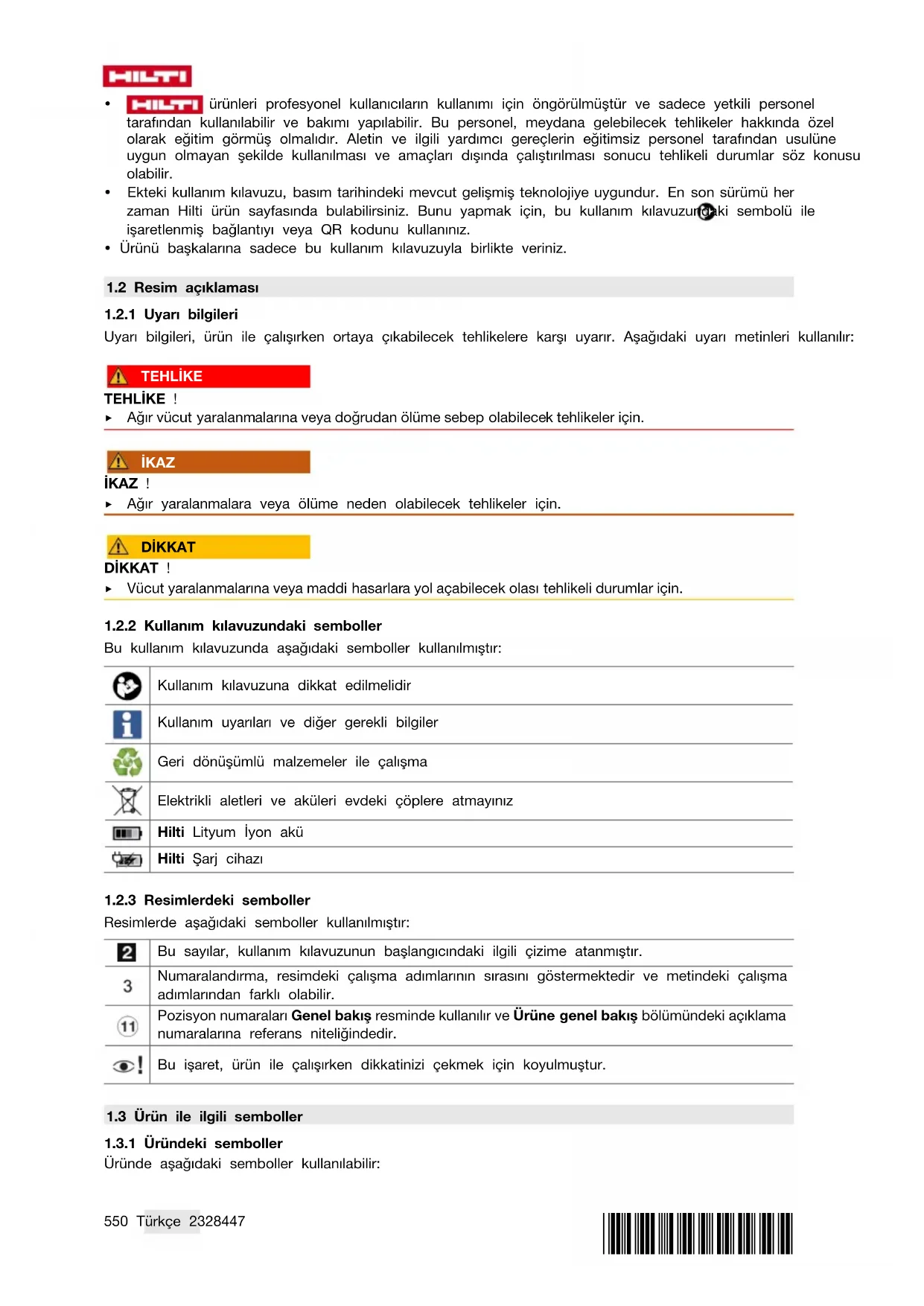 - Sayfa 566 Bu kullanım kılavuzunun sonundaki QR kodu tarayarak ulaşabileceğiniz, Hilti Lityum İyon aküler için güvenlik ve kullanım uyarılarını okuyunuz.554 Türkçe 2328447 *2328447*