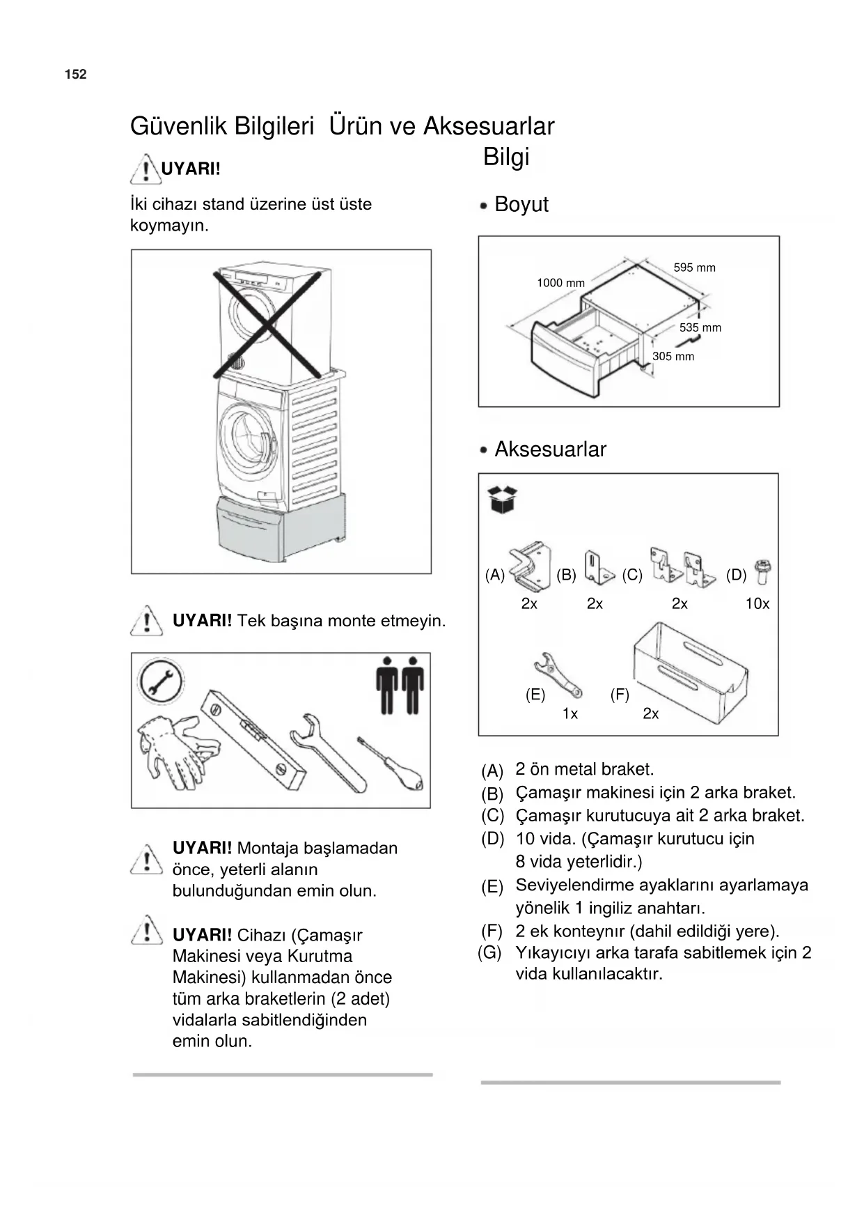 UYARI! Montaja başlamadan önce, yeterli alanın bulunduğundan emin olun. UYARI! Cihazı (Çamaşır Makinesi veya Kurutma Makinesi) kullanmadan önce tüm arka braketlerin (2 adet) vidalarla sabitlendiğinden emin olun.