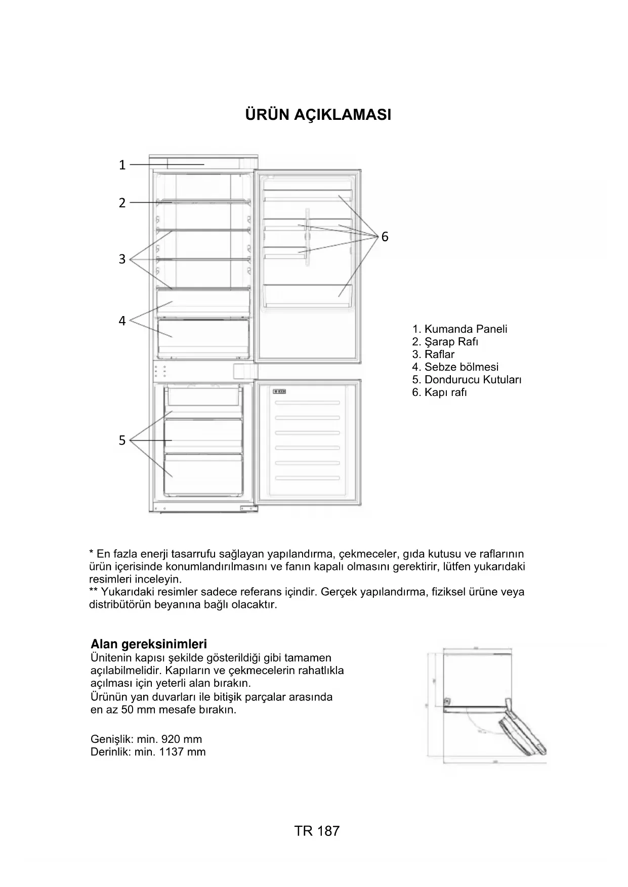 - En fazla enerji tasarrufu sağlayan yapılandırma, çekmeceler, gıda kutusu ve raflarınınürün içerisinde konumlandırılmasını ve fanın kapalı olmasını gerektirir, lütfen yukarıdakiresimleri inceleyin.** Yukarıdaki resimler sadece referans içindir. Gerçek yapılandırma, fiziksel ürüne veyadistribütörün beyanına bağlı olacaktır. Alan gereksinimleri Ünitenin kapısı şekilde gösterildiği gibi tamamen açılabilmelidir. Kapıların ve çekmecelerin rahatlıkla açılması için yeterli alan bırakın. Ürünün yan duvarları ile bitişik parçalar arasında en az 50 mm mesafe bırakın. Genişlik: min. 920 mm Derinlik: min. 1137 mm