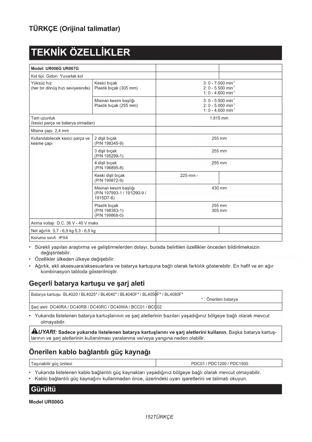 Misinaçapı 2,4 mm Kullanılabilecekkesiciparçave kesmeçapı 2dişlibıçak (P/N 198345-9) 255 mm 3dişlibıçak (P/N 195299-1) 255 mm 4dişlibıçak (P/N 196895-8) 255 mm Keskidişlibıçak (P/N 199872-9) 225 mm - Misinalıkesimbaşlığı (P/N 197993-1 / 191D90-9 / 1915D7-6) 430 mm Plastikbıçak (P/N 198383-1) (P/N 199868-0) 255 mm 305 mm Anmavoltajı D.C. 36 V - 40 V maks Netağırlık 5,7 - 6,9 kg 5,3 - 6,5 kg Korumasınıfı IPX4