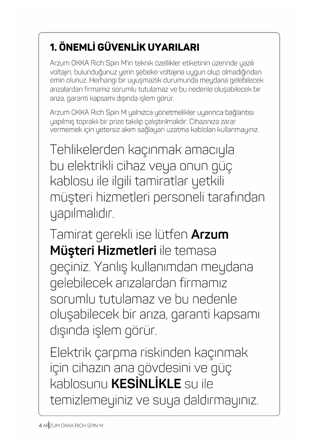 Arzum OKKA Rich Spin M'in teknik özellikler etiketinin üzerinde yazılı voltajın, bulunduğunuz yerin şebeke voltajına uygun olup olmadığından emin olunuz. Herhangi bir uyuşmazlık durumunda meydana gelebilecek arızalardan firmamız sorumlu tutulamaz ve bu nedenle oluşabilecek bir arıza, garanti kapsamı dışında işlem görür. Arzum OKKA Rich Spin M yalnızca yönetmelikler uyarınca bağlantısı yapılmış topraklı bir prize takılıp çalıştırılmalıdır. Cihazınıza zarar vermemek için yetersiz akım sağlayan uzatma kabloları kullanmayınız. Tehlikelerden kaçınmak amacıyla bu elektrikli cihaz veya onun güç kablosu ile ilgili tamiratlar yetkili müşteri hizmetleri personeli tarafından yapılmalıdır. Tamirat gerekli ise lütfen Arzum Müşteri Hizmetleri ile temasa geçiniz. Yanlış kullanımdan meydana gelebilecek arızalardan firmamız sorumlu tutulamaz ve bu nedenle oluşabilecek bir arıza, garanti kapsamı dışında işlem görür. Elektrik çarpma riskinden kaçınmak için cihazın ana gövdesini ve güç kablosunu KESİNLİKLE su ile temizlemeyiniz ve suya daldırmayınız.TR