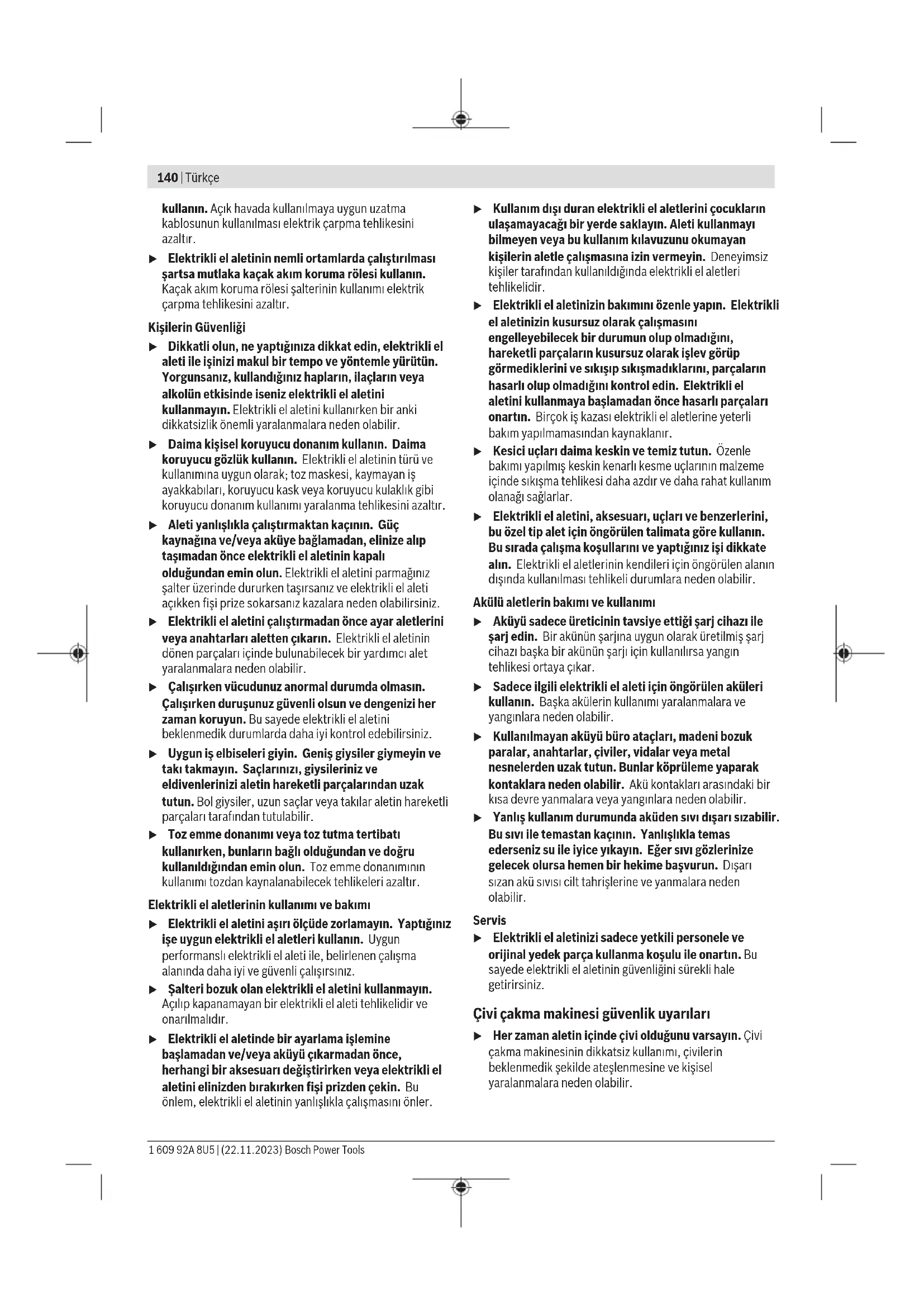 Τα ηλεκτρικά εργαλεία, οι μπαταρίες, τα εξαρτή- ματα και οι συσκευασίες πρέπει να ανακυκλώνο- νται με τρόπο φιλικό προς το περιβάλλον. Μην ρίχνετε τα ηλεκτρικά εργαλεία και τις μπατα- ρίες στα απορρίμματα του σπιτιού σας! Μόνο για χώρες τηςΕΕ: Σύμφωνα με την Ευρωπαϊκή οδηγία 2012/19/ΕΕ σχετικά με τις παλιές ηλεκτρικές και ηλεκτρονικές συσκευές και τη μετα- φορά της οδηγίας αυτής σε εθνικό δίκαιο τα άχρηστα ηλεκτρι- κά εργαλεία και σύμφωνα με την Ευρωπαϊκή οδηγία 2006/66/ΕΚ οι χαλασμένες ή χρησιμοποιημένες μπαταρίες πρέπει να συλλέγονται ξεχωριστά, για να ανακυκλωθούν με τρόπο φιλικό προς το περιβάλλον. Σε περίπτωση μη ενδεδειγμένης απόσυρσης οι ηλεκτρικές και ηλεκτρονικές συσκευές λόγω ενδεχομένης παρουσίας επικίν- δυνων ουσιών μπορούν να έχουν επιβλαβείς επιπτώσεις στο περιβάλλον και στην ανθρώπινη υγεία. Μπαταρίες/Επαναφορτιζόμενες μπαταρίες: Li-Ion: Προσέξτε παρακαλώ τις υποδείξεις στην ενότητα Μεταφορά (βλέπε «Μεταφορά», Σελίδα139). Türkçe Güvenlik talimatı Elektrikli El Aletleri İçin Genel Güvenlik Uyarıları UYARI Bütün güvenlik uyarılarını ve talimatları okuyun. Açıklanan uyarılara ve talimatlara uyulmadığı takdirde elektrik çarpmalarına, yangınlara ve/veya ağır yaralanmalara neden olunabilir. Bütün uyarıları ve talimatları ileride kullanmak üzere saklayın. Uyarı ve talimatlarda kullanılan "elektrikli el aleti" terimi, akım şebekesine bağlı (elektrikli) aletlerle akü ile çalışan aletleri (akülü) kapsamaktadır. Çalışma yeri güvenliği u Çalıştığınız yeri temiz tutun ve iyi aydınlatın. Dağınık veya karanlık alanlar kazalara davetiye çıkarır. u Yakınında patlayıcı maddeler, yanıcı sıvı, gaz veya tozların bulunduğu yerlerde elektrikli el aleti ile çalışmayın. Elektrikli el aletleri, toz veya buharların tutuşmasına neden olabilecek kıvılcımlar çıkarırlar. u Elektrikli el aleti ile çalışırken çocukları ve etraftaki kişileri uzakta tutun. Dikkatiniz dağılacak olursa aletin kontrolünü kaybedebilirsiniz. Elektrik Güvenliği u Elektrikli el aletinin fişi prize uymalıdır. Fişi hiçbir zaman değiştirmeyin. Korumalı (topraklanmış) elektrikli el aletleri ile birlikte adaptör fiş kullanmayın. Değiştirilmemiş fiş ve uygun priz elektrik çarpma tehlikesini azaltır. u Borular, kalorifer petekleri, ısıtıcılar ve buzdolapları gibi topraklanmış yüzeylerle vücudunuzun temas etmesinden kaçının. Vücudunuz topraklandığı anda büyük bir elektrik çarpma tehlikesi ortaya çıkar. u Elektrikli el aletlerini yağmur altında veya nemli ortamlarda bırakmayın. Suyun elektrikli el aleti içine sızması elektrik çarpma tehlikesini artırır. u Kabloya zarar vermeyin. Elektrikli el aletini kablosundan tutarak taşımayın, kabloyu kullanarak çekmeyin veya kablodan çekerek fişi çıkarmayın. Kabloyu ateş, yanıcı ve/veya keskin ve hareket eden maddelerden uzak tutun. Hasarlı veya dolaşmış kablo elektrik çarpma tehlikesini artırır. u Bir elektrikli el aleti ile açık havada çalışırken mutlaka açık havada kullanılmaya uygun uzatma kablosu Bosch Power Tools 1 609 92A 8U5 | (22.11.2023)140 | Türkçe kullanın. Açık havada kullanılmaya uygun uzatma kablosunun kullanılması elektrik çarpma tehlikesini azaltır. u Elektrikli el aletinin nemli ortamlarda çalıştırılması şartsa mutlaka kaçak akım koruma rölesi kullanın. Kaçak akım koruma rölesi şalterinin kullanımı elektrik çarpma tehlikesini azaltır. Kişilerin Güvenliği u Dikkatli olun, ne yaptığınıza dikkat edin, elektrikli el aleti ile işinizi makul bir tempo ve yöntemle yürütün. Yorgunsanız, kullandığınız hapların, ilaçların veya alkolün etkisinde iseniz elektrikli el aletini kullanmayın. Elektrikli el aletini kullanırken bir anki dikkatsizlik önemli yaralanmalara neden olabilir. u Daima kişisel koruyucu donanım kullanın. Daima koruyucu gözlük kullanın. Elektrikli el aletinin türü ve kullanımına uygun olarak; toz maskesi, kaymayan iş ayakkabıları, koruyucu kask veya koruyucu kulaklık gibi koruyucu donanım kullanımı yaralanma tehlikesini azaltır. u Aleti yanlışlıkla çalıştırmaktan kaçının. Güç kaynağına ve/veya aküye bağlamadan, elinize alıp taşımadan önce elektrikli el aletinin kapalı olduğundan emin olun. Elektrikli el aletini parmağınız şalter üzerinde dururken taşırsanız ve elektrikli el aleti açıkken fişi prize sokarsanız kazalara neden olabilirsiniz. u Elektrikli el aletini çalıştırmadan önce ayar aletlerini veya anahtarları aletten çıkarın. Elektrikli el aletinin dönen parçaları içinde bulunabilecek bir yardımcı alet yaralanmalara neden olabilir. u Çalışırken vücudunuz anormal durumda olmasın. Çalışırken duruşunuz güvenli olsun ve dengenizi her zaman koruyun. Bu sayede elektrikli el aletini beklenmedik durumlarda daha iyi kontrol edebilirsiniz. u Uygun iş elbiseleri giyin. Geniş giysiler giymeyin ve takı takmayın. Saçlarınızı, giysileriniz ve eldivenlerinizi aletin hareketli parçalarından uzak tutun. Bol giysiler, uzun saçlar veya takılar aletin hareketli parçaları tarafından tutulabilir. u Toz emme donanımı 