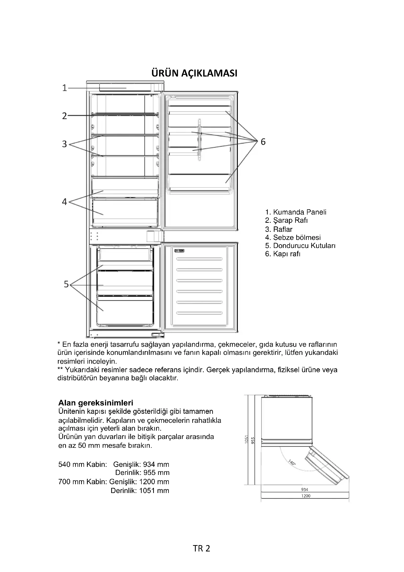 1. Kumanda Paneli2. Şarap Rafı3. Raflar4. Sebze bölmesi5. Dondurucu Kutuları6. Kapı rafı* En fazla enerji tasarrufu sağlayan yapılandırma, çekmeceler, gıda kutusu ve raflarınınürün içerisinde konumlandırılmasını ve fanın kapalı olmasını gerektirir, lütfen yukarıdakiresimleri inceleyin.** Yukarıdaki resimler sadece referans içindir. Gerçek yapılandırma, fiziksel ürüne veyadistribütörün beyanına bağlı olacaktır.Alan gereksinimleri Ünitenin kapısı şekilde gösterildiği gibi tamamen açılabilmelidir. Kapıların ve çekmecelerin rahatlıkla açılması için yeterli alan bırakın. Ürünün yan duvarları ile bitişik parçalar arasında en az 50 mm mesafe bırakın. 540 mm Kabin: Genişlik: 934 mmDerinlik: 955 mm 700 mm Kabin: Genişlik: 1200 mm Derinlik: 1051 mm
