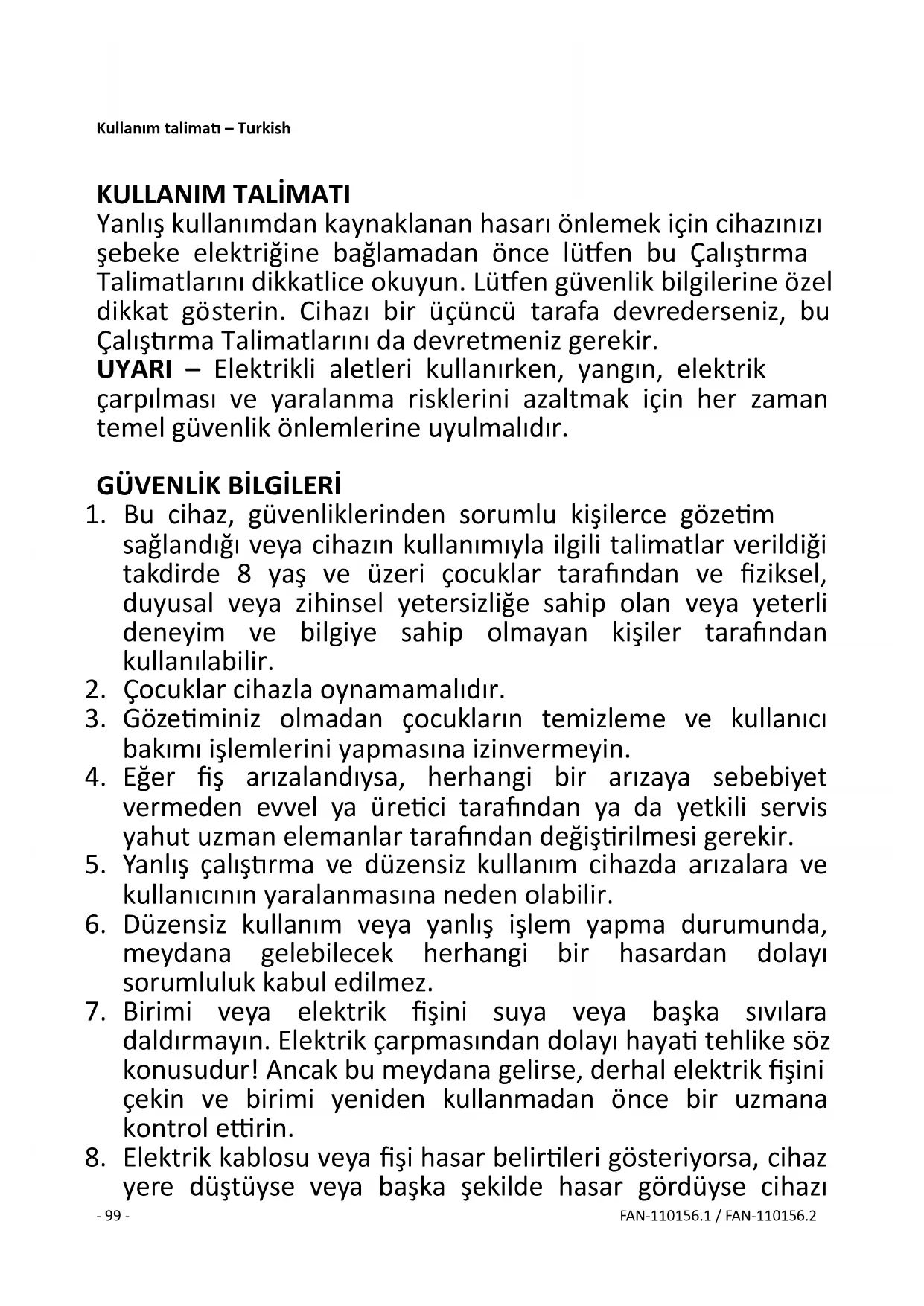 yere düştüyse veya başka şekilde hasar gördüyse cihazı- 100 - FAN-110156.1 / FAN-110156.2 çalıştırmayın. Böyle durumlarda cihazı gerekirse kontrol ve onarım için bir uzmana götürün.