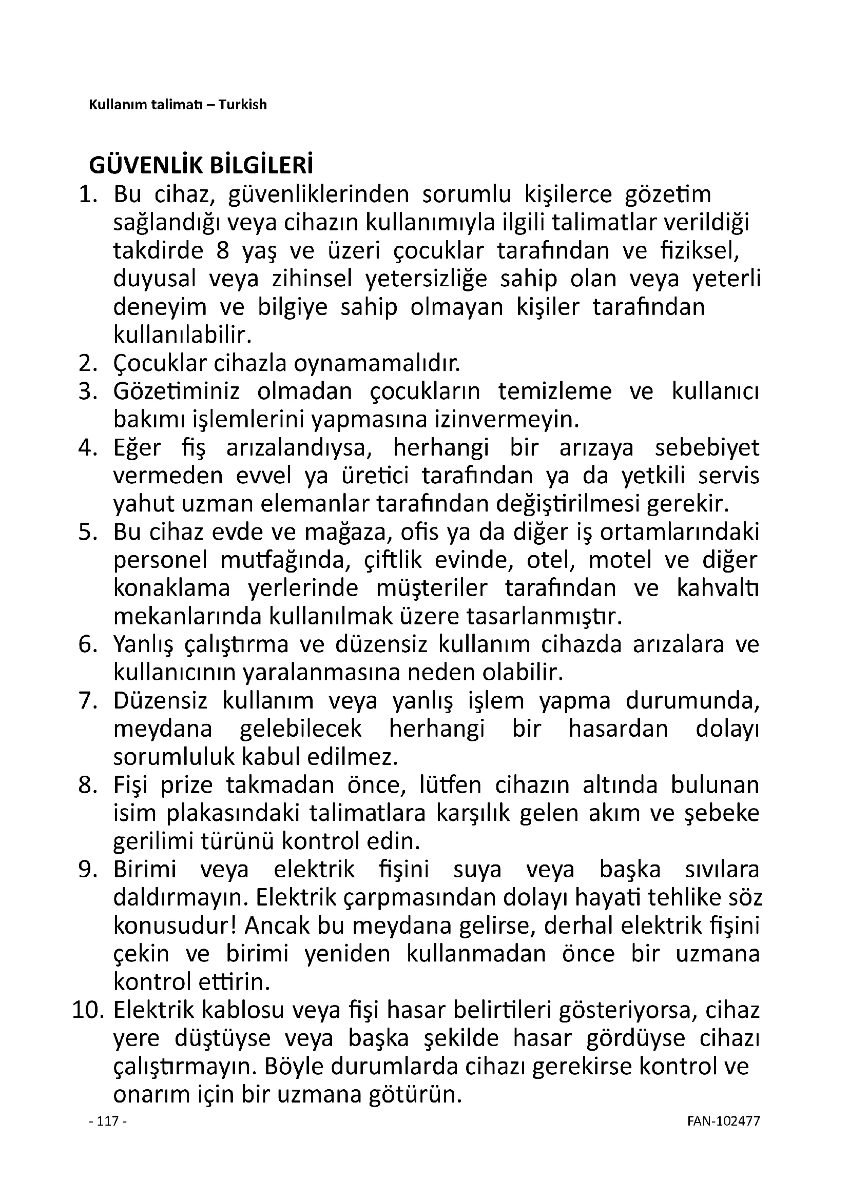 yere düştüyse veya başka şekilde hasar gördüyse cihazı çalıştırmayın. Böyle durumlarda cihazı gerekirse kontrol ve onarım için bir uzmana götürün.- 118 - FAN-102477