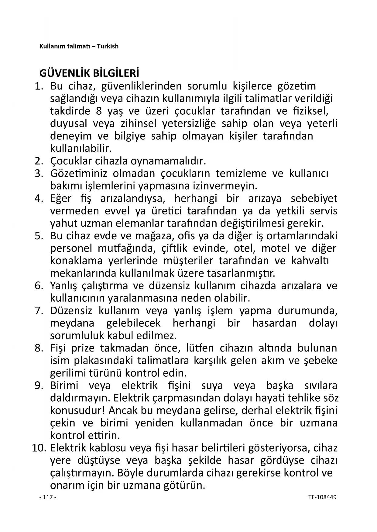 10. Elektrik kablosu veya fişi hasar belirtileri gösteriyorsa, cihaz