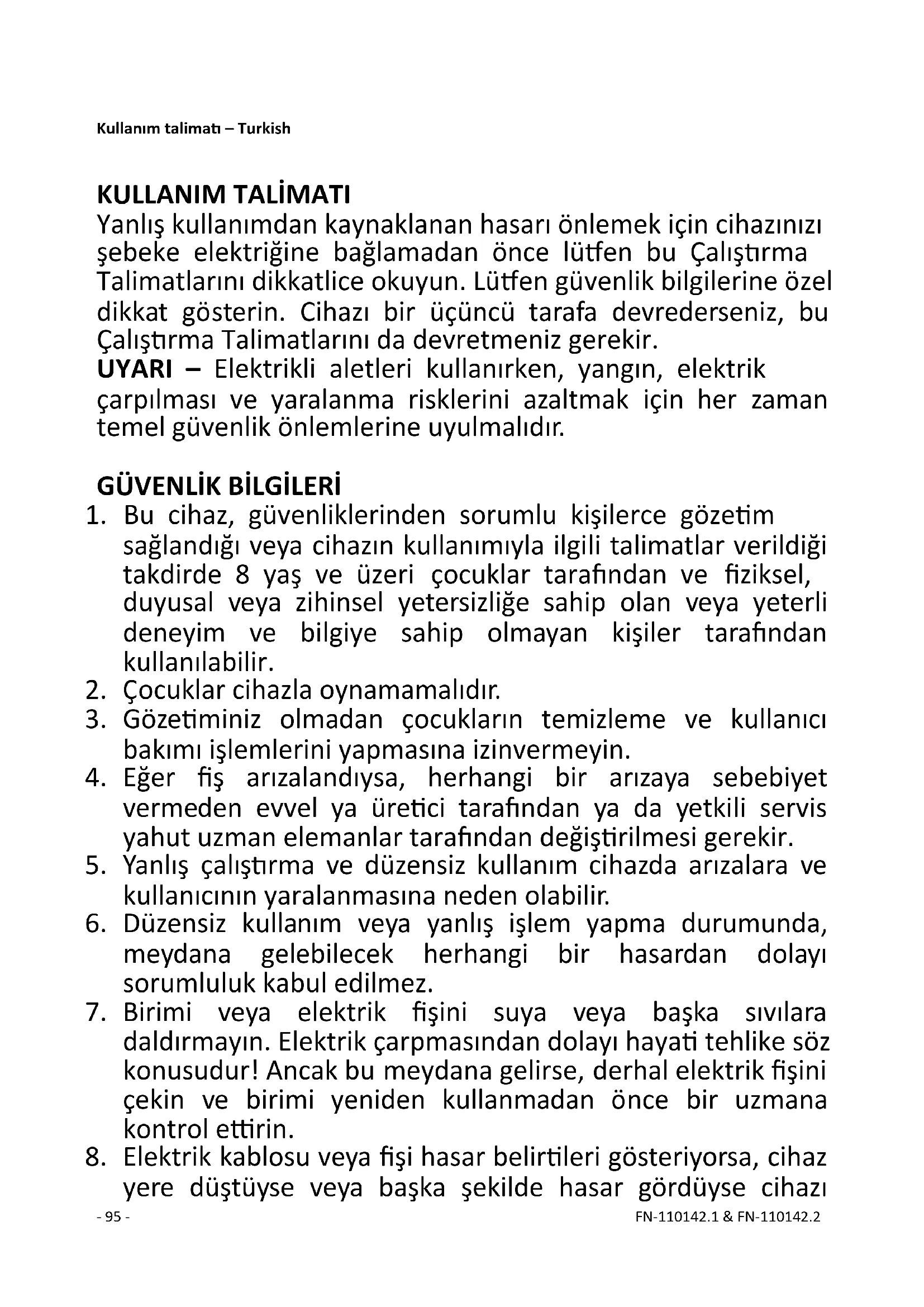 Yanlış kullanımdan kaynaklanan hasarı önlemek için cihazınızı şebeke elektriğine bağlamadan önce lütfen bu Çalıştırma Talimatlarını dikkatlice okuyun. Lütfen güvenlik bilgilerine özel dikkat gösterin. Cihazı bir üçüncü tarafa devrederseniz, bu Çalıştırma Talimatlarını da devretmeniz gerekir. UYARI – Elektrikli aletleri kullanırken, yangın, elektrik çarpılması ve yaralanma risklerini azaltmak için her zaman temel güvenlik önlemlerine uyulmalıdır.