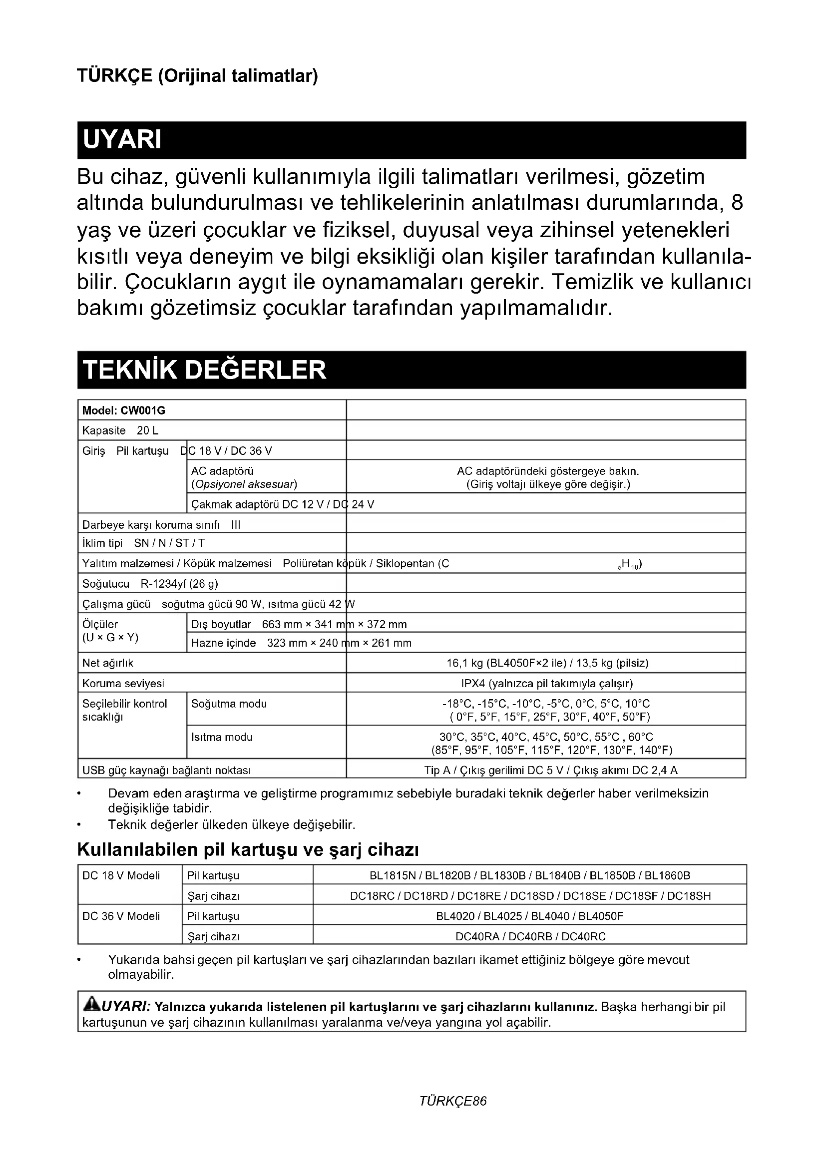Model: CW001GKapasite 20 LGiriş Pilkartuşu DC 18 V / DC 36 VAC adaptörü (Opsiyonel aksesuar)ACadaptöründekigöstergeyebakın.(Girişvoltajıülkeyegöredeğişir.)Çakmak adaptörü DC 12 V / DC 24 VDarbeyekarşıkorumasınıfı IIIİklimtipi SN / N / ST / TYalıtımmalzemesi/Köpükmalzemesi Poliüretanköpük/Siklopentan(C