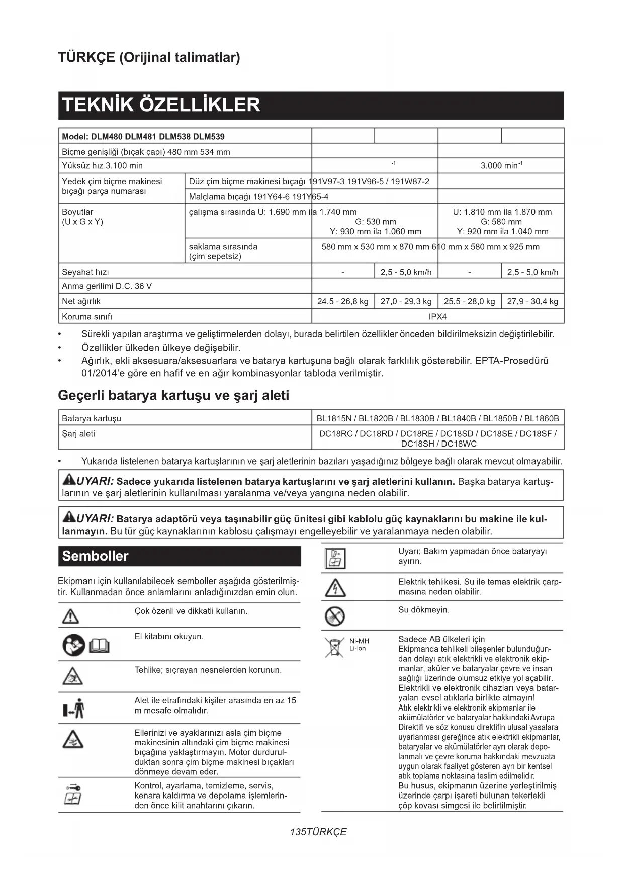 Yukarıda listelenen batarya kartuşlarının ve şarj aletlerinin bazıları yaşadığınız bölgeye bağlı olarak mevcut olmayabilir. UYARI: Sadece yukarıda listelenen batarya kartuşlarını ve şarj aletlerini kullanın. Başka batarya kartuş- larının ve şarj aletlerinin kullanılması yaralanma ve/veya yangına neden olabilir. UYARI: Batarya adaptörü veya taşınabilir güç ünitesi gibi kablolu güç kaynaklarını bu makine ile kul- lanmayın. Bu tür güç kaynaklarının kablosu çalışmayı engelleyebilir ve yaralanmaya neden olabilir. Semboller Ekipmanı için kullanılabilecek semboller aşağıda gösterilmiş- tir. Kullanmadan önce anlamlarını anladığınızdan emin olun. Çok özenli ve dikkatli kullanın. El kitabını okuyun. Tehlike; sıçrayan nesnelerden korunun. Alet ile etrafındaki kişiler arasında en az 15 m mesafe olmalıdır. Ellerinizi ve ayaklarınızı asla çim biçme makinesinin altındaki çim biçme makinesi bıçağına yaklaştırmayın. Motor durdurul- duktan sonra çim biçme makinesi bıçakları dönmeye devam eder. Kontrol, ayarlama, temizleme, servis, kenara kaldırma ve depolama işlemlerin- den önce kilit anahtarını çıkarın. Uyarı; Bakım yapmadan önce bataryayı ayırın. Elektrik tehlikesi. Su ile temas elektrik çarp- masına neden olabilir. Su dökmeyin. Ni-MH Li-ion Sadece AB ülkeleri için Ekipmanda tehlikeli bileşenler bulunduğun- dan dolayı atık elektrikli ve elektronik ekip- manlar, aküler ve bataryalar çevre ve insan sağlığı üzerinde olumsuz etkiye yol açabilir. Elektrikli ve elektronik cihazları veya batar- yaları evsel atıklarla birlikte atmayın! Atık elektrikli ve elektronik ekipmanlar ile akümülatörler ve bataryalar hakkındaki Avrupa Direktifi ve söz konusu direktifin ulusal yasalara uyarlanması gereğince atık elektrikli ekipmanlar, bataryalar ve akümülatörler ayrı olarak depo- lanmalı ve çevre koruma hakkındaki mevzuata uygun olarak faaliyet gösteren ayrı bir kentsel atık toplama noktasına teslim edilmelidir. Bu husus, ekipmanın üzerine yerleştirilmiş üzerinde çarpı işareti bulunan tekerlekli çöp kovası simgesi ile belirtilmiştir.136 TÜRKÇE AB Dış Mekan Gürültü Direktifi uyarınca garanti edilen ses gücü seviyesi.Avustralya NSW Gürültü Kontrol Mevzuatı uyarınca ses gücü seviyesi Kullanım amacı Bu makine çim biçmek için tasarlanmıştır. Gürültü Tipik A-ağırlıklı gürültü düzeyi (EN60335-2-77 standar- dına göre belirlenen): Model DLM480 Ses basınç seviyesi (L