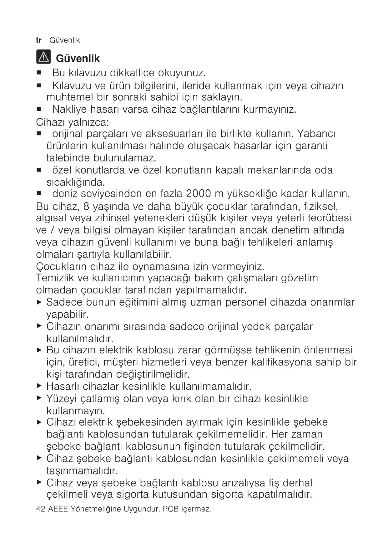 Όροι εγγύησης Όροι εγγύησης Όροι εγγύησης Έχετε για τη συσκευή σας δικαίωμα εγγύησης σύμφωνα με τους ακόλουθους όρους.Όροι εγγύησης el 41tr Güvenlik 42 AEEE Yönetmeliǧine Uygundur. PCB içermez. Güvenlik ¡ Bu kılavuzu dikkatlice okuyunuz. ¡ Kılavuzu ve ürün bilgilerini, ileride kullanmak için veya cihazın muhtemel bir sonraki sahibi için saklayın. ¡ Nakliye hasarı varsa cihaz bağlantılarını kurmayınız. Cihazı yalnızca: ¡ orijinal parçaları ve aksesuarları ile birlikte kullanın. Yabancı ürünlerin kullanılması halinde oluşacak hasarlar için garanti talebinde bulunulamaz. ¡ özel konutlarda ve özel konutların kapalı mekanlarında oda sıcaklığında. ¡ deniz seviyesinden en fazla 2000m yüksekliğe kadar kullanın. Bu cihaz, 8 yaşında ve daha büyük çocuklar tarafından, fiziksel, algısal veya zihinsel yetenekleri düşük kişiler veya yeterli tecrübesi ve / veya bilgisi olmayan kişiler tarafından ancak denetim altında veya cihazın güvenli kullanımı ve buna bağlı tehlikeleri anlamış olmaları şartıyla kullanılabilir. Çocukların cihaz ile oynamasına izin vermeyiniz. Temizlik ve kullanıcının yapacağı bakım çalışmaları gözetim olmadan çocuklar tarafından yapılmamalıdır.