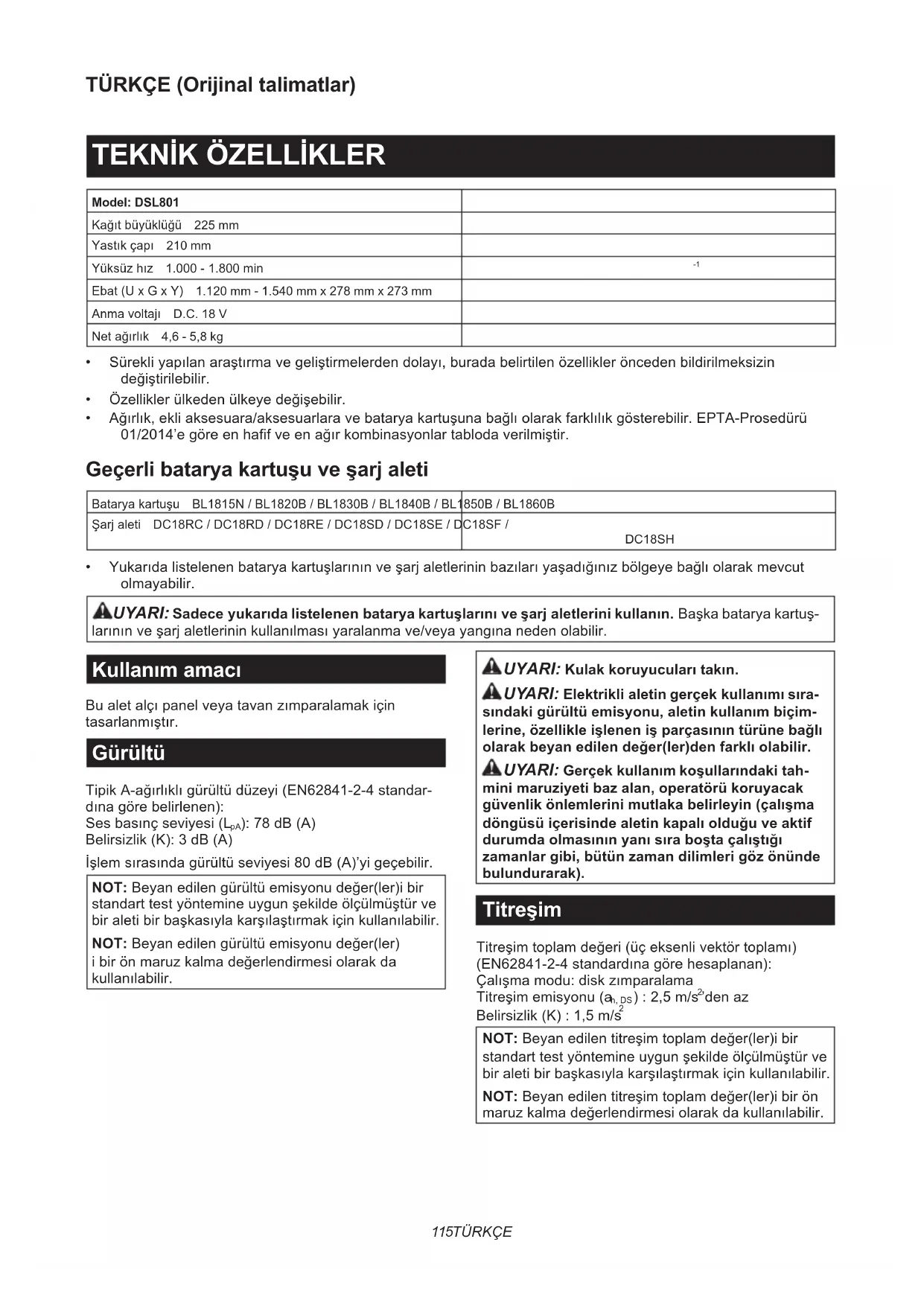 - Yukarıdalistelenenbataryakartuşlarınınveşarjaletlerininbazılarıyaşadığınızbölgeyebağlıolarakmevcut olmayabilir. UYARI: Sadece yukarıda listelenen batarya kartuşlarını ve şarj aletlerini kullanın.Başkabataryakartuş- larınınveşarjaletlerininkullanılmasıyaralanmave/veyayangınanedenolabilir. Kullanım amacı Bualetalçıpanelveyatavanzımparalamakiçin tasarlanmıştır. Gürültü TipikA-ağırlıklıgürültüdüzeyi(EN62841-2-4standar- dınagörebelirlenen): Sesbasınçseviyesi(L