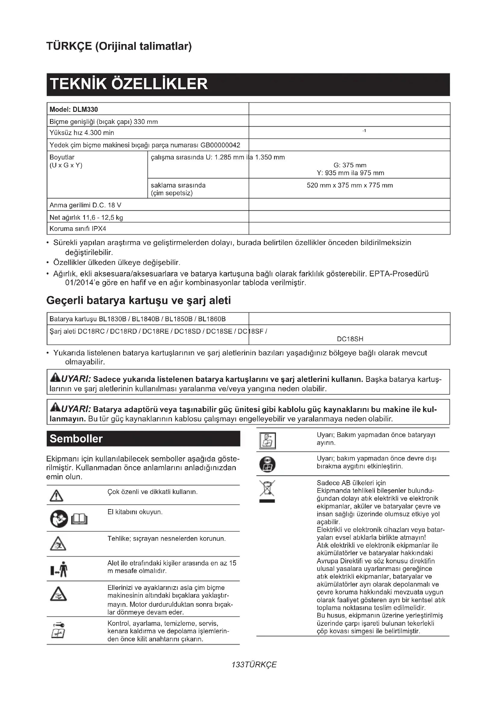 - Yukarıda listelenen batarya kartuşlarının ve şarj aletlerinin bazıları yaşadığınız bölgeye bağlı olarak mevcut olmayabilir. UYARI: Sadece yukarıda listelenen batarya kartuşlarını ve şarj aletlerini kullanın. Başka batarya kartuş- larının ve şarj aletlerinin kullanılması yaralanma ve/veya yangına neden olabilir. UYARI: Batarya adaptörü veya taşınabilir güç ünitesi gibi kablolu güç kaynaklarını bu makine ile kul- lanmayın. Bu tür güç kaynaklarının kablosu çalışmayı engelleyebilir ve yaralanmaya neden olabilir. Semboller Ekipmanı için kullanılabilecek semboller aşağıda göste- rilmiştir. Kullanmadan önce anlamlarını anladığınızdan emin olun. Çok özenli ve dikkatli kullanın. El kitabını okuyun. Tehlike; sıçrayan nesnelerden korunun. Alet ile etrafındaki kişiler arasında en az 15 m mesafe olmalıdır. Ellerinizi ve ayaklarınızı asla çim biçme makinesinin altındaki bıçaklara yaklaştır- mayın. Motor durdurulduktan sonra bıçak- lar dönmeye devam eder. Kontrol, ayarlama, temizleme, servis, kenara kaldırma ve depolama işlemlerin- den önce kilit anahtarını çıkarın. Uyarı; Bakım yapmadan önce bataryayı ayırın. Uyarı; bakım yapmadan önce devre dışı bırakma aygıtını etkinleştirin. Sadece AB ülkeleri için Ekipmanda tehlikeli bileşenler bulundu- ğundan dolayı atık elektrikli ve elektronik ekipmanlar, aküler ve bataryalar çevre ve insan sağlığı üzerinde olumsuz etkiye yol açabilir. Elektrikli ve elektronik cihazları veya batar- yaları evsel atıklarla birlikte atmayın! Atık elektrikli ve elektronik ekipmanlar ile akümülatörler ve bataryalar hakkındaki Avrupa Direktifi ve söz konusu direktifin ulusal yasalara uyarlanması gereğince atık elektrikli ekipmanlar, bataryalar ve akümülatörler ayrı olarak depolanmalı ve çevre koruma hakkındaki mevzuata uygun olarak faaliyet gösteren ayrı bir kentsel atık toplama noktasına teslim edilmelidir. Bu husus, ekipmanın üzerine yerleştirilmiş üzerinde çarpı işareti bulunan tekerlekli çöp kovası simgesi ile belirtilmiştir.134 TÜRKÇE