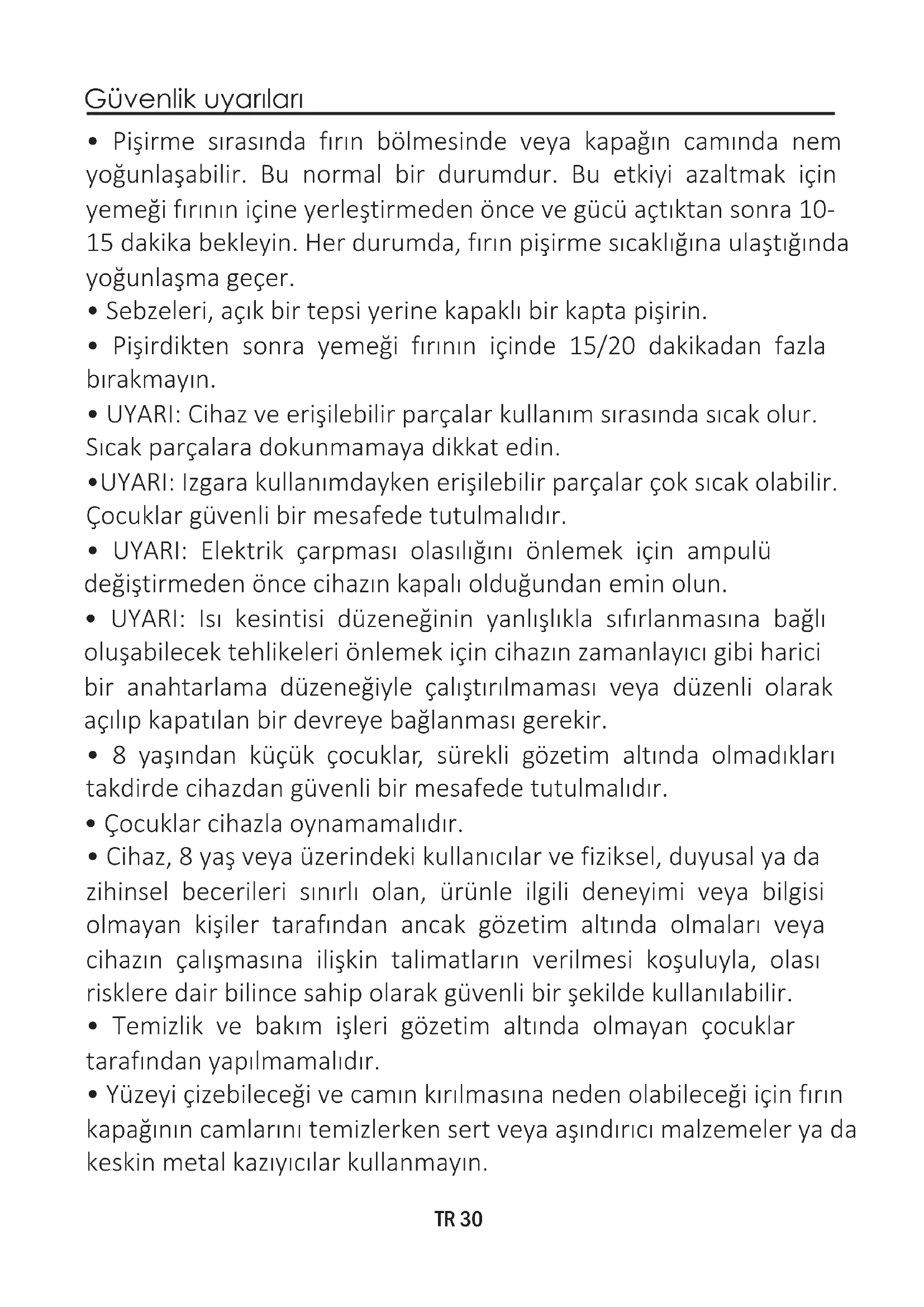 Bu cihaz, 2012/19/EU Atık Elektrikli ve Elektronik Cihazlar (WEEE) hakkında Avrupa Yönergesine göre etiketlenmiştir. WEEE hem kirletici maddeleri (çevreye olumsuz bir etkisi olabilecek), hem de baz elemanları (yeniden kullanılabilir olan) içermektedir. Kirletici maddelerin bertaraf edilmesi ve tüm malzemelerin geri dönüştürülebilmesi için WEEE'lerin doğru bir şekilde tasnif edilmesi önemlidir. WEEE'lerin çevre açısından bir sorun oluşturmaması için bireyler önemli bir rol oynayabilir; birkaç temel kurala uyulması son derece önemlidir: TR 35 Bu cihaz ev standartlarında kullanılmak üzere üretilmiştir. Profesyonel kullanım veya ticare kullanım için kurulmuş olması durumunda, ilgili ticari hususta uygulanan standartlar dikkate alınmalıdır. Fırın kapalıyken ana düğmenin etrafında hafif bir ışık olabilir. Bu davranış normaldir. Bu durum, prizin baş aşağı çevrilerek takılması veya besleme terminallerinin değiştirilmesiyle giderilebilir.TR 36 ENERJİ TASARRUFU VE ÇEVREYE SAYGI - WEEE evsel atık olarak işlem görmemelidir; - WEEE belediyeler veya tescilli bir firma tarafından yönetilen belirlenmiş toplama alanlarına götürülmelidir. Birçok ülkede, büyük WEEE'ler için şehir içinde toplama noktaları bulunmaktadır. Yeni bir cihaz satın aldığınızda, eski cihazın satın alınan cihazla aynı tipte olması ve aynı işlevlere sahip olması durumunda eski cihazı ücretsiz olarak bire bir kabul etmesi gereken satıcıya iade edebilirsiniz. Mümkün olduğunda, fırını önceden ısıtmaktan kaçının ve her zaman doldurmaya çalışın. Fırın kapağını olabildiğince az açın çünkü her açılışında ısı kaybı oluşur. Önemli oranda enerji tasarrufu için, fırını planlanan pişirme süresinden 5 ile 10 dakika daha önce kapatın ve fırının üretmeye devam edeceği artakalan ısıyı kullanın. Isının hazne dışına kaçmaması için contaları temiz ve düzgün tutun. Eğer saatlik bir tarife ile ücretlendirilen bir elektrik sözleşmeniz varsa, pişirmeye başlama saatini indirimli fiyat tarifesinin saatine taşıyan "gecikmeli pişirme" programı ile daha basit bir şekilde enerji tasarrufu yapılabilir.