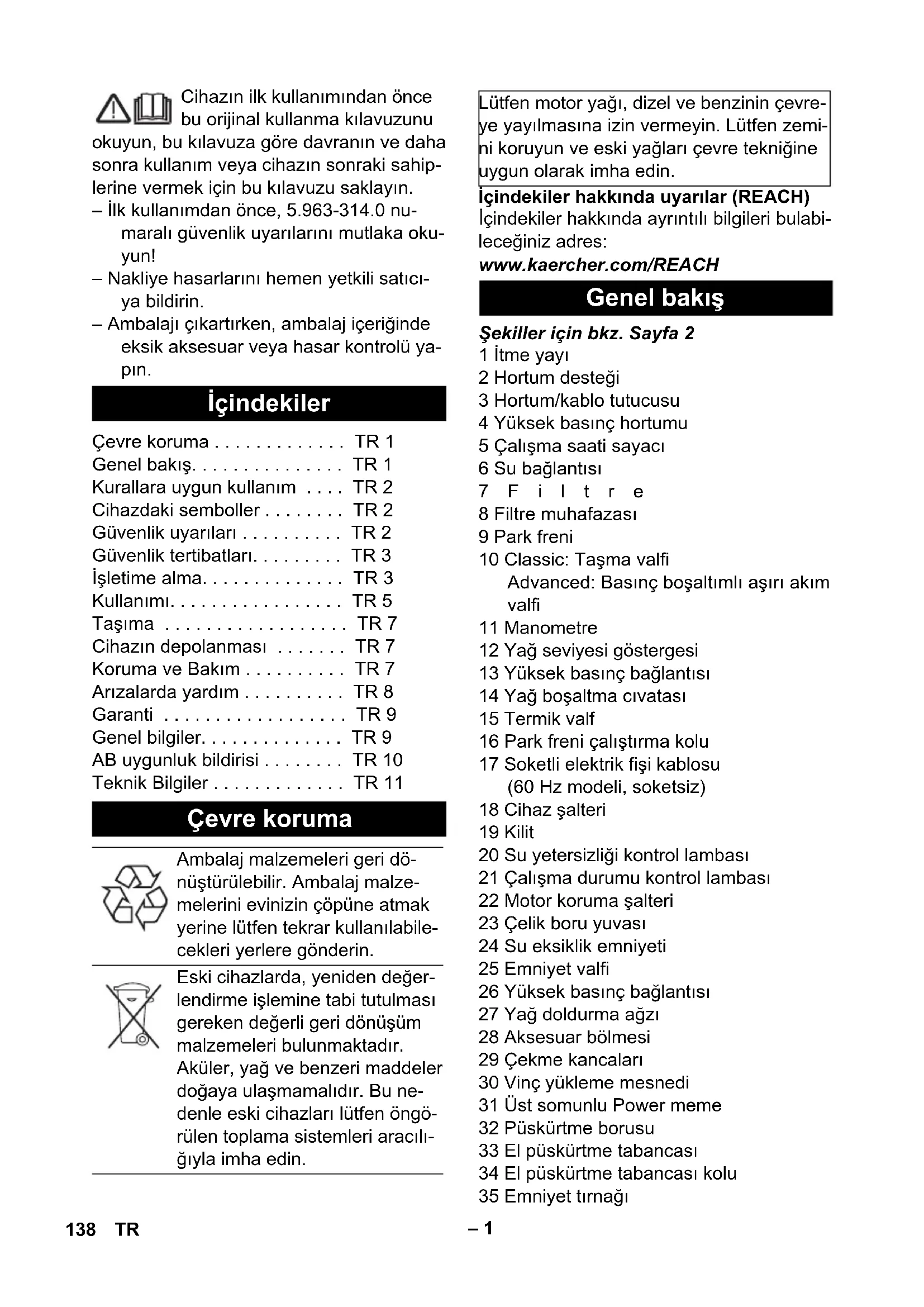 dB (A) 101 Λόγος εξαίρεσης σύμφωνα με τον κανονισμό (ΕΕ) 2019/1781 Παράρτημα Ι Τμήμα 2 (12): j) 137EL– 1 Cihazın ilk kullanımından önce bu orijinal kullanma kılavuzunu okuyun, bu kılavuza göre davranın ve daha sonra kullanım veya cihazın sonraki sahip- lerine vermek için bu kılavuzu saklayın. – İlk kullanımdan önce, 5.963-314.0 nu- maralı güvenlik uyarılarını mutlaka oku- yun! – Nakliye hasarlarını hemen yetkili satıcı- ya bildirin. – Ambalajı çıkartırken, ambalaj içeriğinde eksik aksesuar veya hasar kontrolü ya- pın. İçindekiler hakkında uyarılar (REACH) İçindekiler hakkında ayrıntılı bilgileri bulabi- leceğiniz adres: www.kaercher.com/REACH Şekiller için bkz. Sayfa 2 1 İtme yayı 2 Hortum desteği 3 Hortum/kablo tutucusu 4 Yüksek basınç hortumu 5 Çalışma saati sayacı 6 Su bağlantısı 7Filtre 8 Filtre muhafazası 9 Park freni 10 Classic: Taşma valfi Advanced: Basınç boşaltımlı aşırı akım valfi 11 Manometre 12 Yağ seviyesi göstergesi 13 Yüksek basınç bağlantısı 14 Yağ boşaltma cıvatası 15 Termik valf 16 Park freni çalıştırma kolu 17 Soketli elektrik fişi kablosu (60 Hz modeli, soketsiz) 18 Cihaz şalteri 19 Kilit 20 Su yetersizliği kontrol lambası 21 Çalışma durumu kontrol lambası 22 Motor koruma şalteri 23 Çelik boru yuvası 24 Su eksiklik emniyeti 25 Emniyet valfi 26 Yüksek basınç bağlantısı 27 Yağ doldurma ağzı 28 Aksesuar bölmesi 29 Çekme kancaları 30 Vinç yükleme mesnedi 31 Üst somunlu Power meme 32 Püskürtme borusu 33 El püskürtme tabancası 34 El püskürtme tabancası kolu 35 Emniyet tırnağı İçindekiler Çevre koruma . . . . . . . . . . . . . TR 1 Genel bakış. . . . . . . . . . . . . . . TR 1 Kurallara uygun kullanım . . . . TR 2 Cihazdaki semboller . . . . . . . . TR 2 Güvenlik uyarıları . . . . . . . . . . TR 2 Güvenlik tertibatları. . . . . . . . . TR 3 İşletime alma. . . . . . . . . . . . . . TR 3 Kullanımı. . . . . . . . . . . . . . . . . TR 5 Taşıma . . . . . . . . . . . . . . . . . . TR 7 Cihazın depolanması . . . . . . . TR 7 Koruma ve Bakım . . . . . . . . . . TR 7 Arızalarda yardım . . . . . . . . . . TR 8 Garanti . . . . . . . . . . . . . . . . . . TR 9 Genel bilgiler. . . . . . . . . . . . . . TR 9 AB uygunluk bildirisi . . . . . . . . TR 10 Teknik Bilgiler . . . . . . . . . . . . . TR 11 Çevre koruma Ambalaj malzemeleri geri dö- nüştürülebilir. Ambalaj malze- melerini evinizin çöpüne atmak yerine lütfen tekrar kullanılabile- cekleri yerlere gönderin. Eski cihazlarda, yeniden değer- lendirme işlemine tabi tutulması gereken değerli geri dönüşüm malzemeleri bulunmaktadır. Aküler, yağ ve benzeri maddeler doğaya ulaşmamalıdır. Bu ne- denle eski cihazları lütfen öngö- rülen toplama sistemleri aracılı- ğıyla imha edin. Lütfen motor yağı, dizel ve benzinin çevre- ye yayılmasına izin vermeyin. Lütfen zemi- ni koruyun ve eski yağları çevre tekniğine uygun olarak imha edin. Genel bakış 138 TR– 2 – Temizlik prosesinin kullanım elemanları sarıdır. – Bakım ve servis kullanım elemanları açık gridir. Bu yüksek basınçlı temizleyici aşağıdaki amaçlarla kullanın: – Makineler, araçlar, inşaat makineleri, aletler. – Kärcher tarafından onaylanmış aksesu- ar ve yedek parçalarla birlikte. 몇 UYARI Su besleme işletmesinin talimatlarını dikka- te alın. Geçerli yönetmeliklere göre, ci- haz, içme suyu şebekesinde sis- tem ayırıcısı olmadan çalıştırılma- malıdır. KÄRCHER firmasının uy- gun bir sistem ayırıcısı veya alternatif ola- rak EN 12729 Tip B uyarınca bir sistem ayırıcısı kullanılmalıdır. Bir sistem ayırıcısından akan su, içilemez olarak sınıflandırılmıştır.