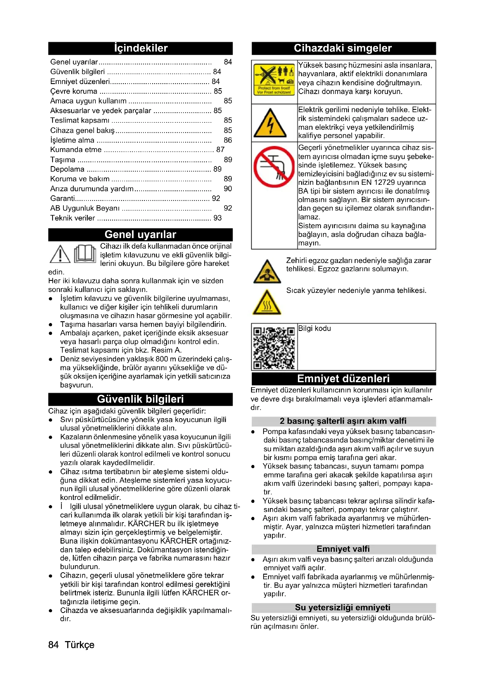0,9 0,8 0,9 1 184 Türkçe İçindekiler Genel uyarılar Cihazı ilk defa kullanmadan önce orijinal işletim kılavuzunu ve ekli güvenlik bilgi- lerini okuyun. Bu bilgilere göre hareket edin. Her iki kılavuzu daha sonra kullanmak için ve sizden sonraki kullanıcı için saklayın. ●İşletim kılavuzu ve güvenlik bilgilerine uyulmaması, kullanıcı ve diğer kişiler için tehlikeli durumların oluşmasına ve cihazın hasar görmesine yol açabilir. ● Taşıma hasarları varsa hemen bayiyi bilgilendirin. ● Ambalajı açarken, paket içeriğinde eksik aksesuar veya hasarlı parça olup olmadığını kontrol edin. Teslimat kapsamı için bkz. Resim A. ● Deniz seviyesinden yaklaşık 800 m üzerindeki çalış- ma yüksekliğinde, brülör ayarını yüksekliğe ve dü- şük oksijen içeriğine ayarlamak için yetkili satıcınıza başvurun. Güvenlik bilgileri Cihaz için aşağıdaki güvenlik bilgileri geçerlidir: ● Sıvı püskürtücüsüne yönelik yasa koyucunun ilgili ulusal yönetmeliklerini dikkate alın. ● Kazaların önlenmesine yönelik yasa koyucunun ilgili ulusal yönetmeliklerini dikkate alın. Sıvı püskürtücü- leri düzenli olarak kontrol edilmeli ve kontrol sonucu yazılı olarak kaydedilmelidir. ● Cihaz ısıtma tertibatının bir ateşleme sistemi oldu- ğuna dikkat edin. Ateşleme sistemleri yasa koyucu- nun ilgili ulusal yönetmeliklerine göre düzenli olarak kontrol edilmelidir. ●İlgili ulusal yönetmeliklere uygun olarak, bu cihaz ti- cari kullanımda ilk olarak yetkili bir kişi tarafından iş- letmeye alınmalıdır. KÄRCHER bu ilk işletmeye almayı sizin için gerçekleştirmiş ve belgelemiştir. Buna ilişkin dokümantasyonu KÄRCHER ortağınız- dan talep edebilirsiniz. Dokümantasyon istendiğin- de, lütfen cihazın parça ve fabrika numarasını hazır bulundurun.
