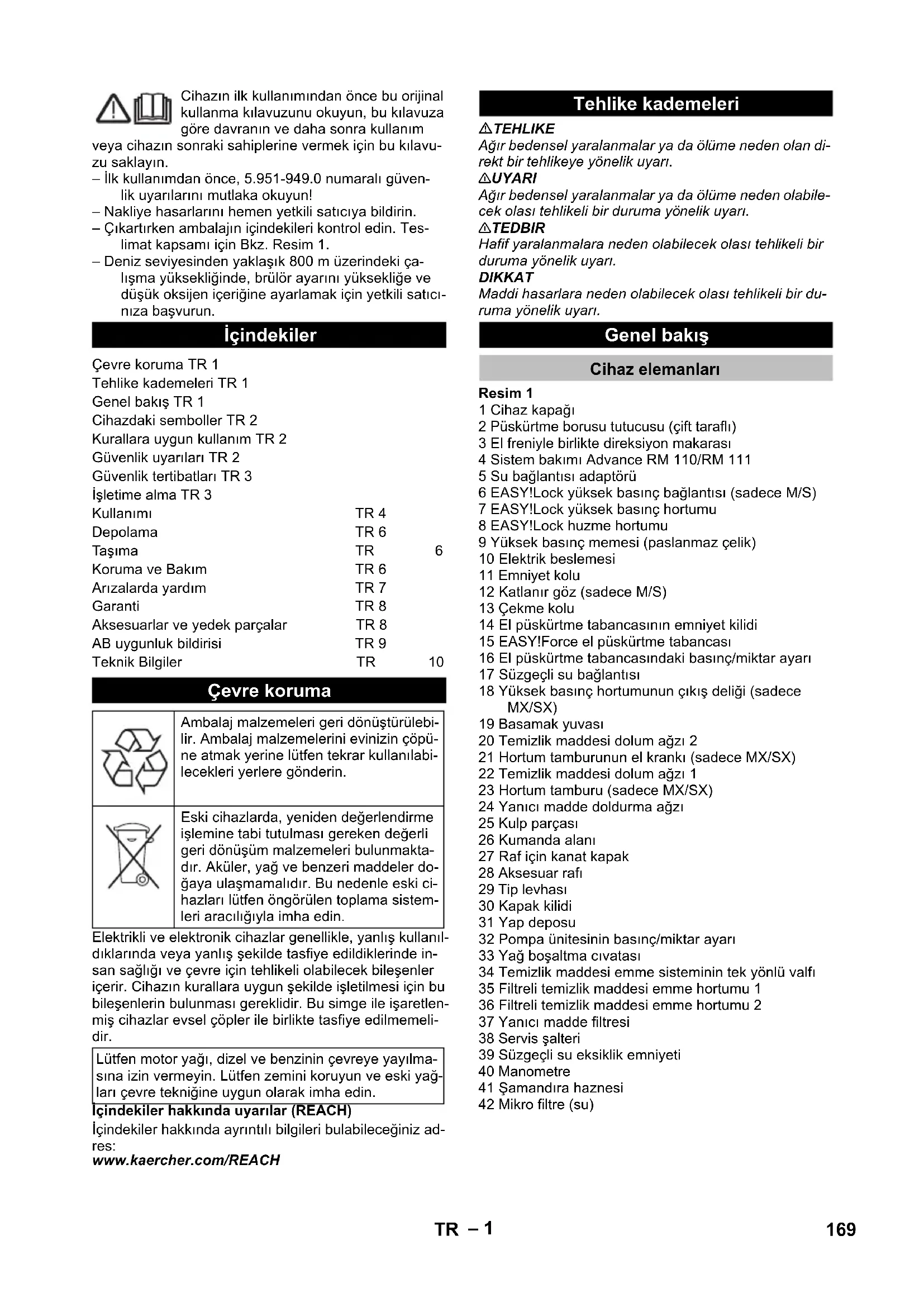 1,0 1,0 Υλικά λειτουργίας Καύσιμο -- Πετρέλαιο θέρμανσης EL ή ντίζελ Πετρέλαιο θέρμανσης EL ή ντίζελ Ποσότητα λαδιού l 1,0 1,0 Τύπος λαδιού -- SAE 90 SAE 90 Διαστάσεις και βάρη Μήκος x Πλάτος x Ύψος mm 1330 x 750 x 1060 1330 x 750 x 1060 Τυπικό βάρος λειτουργίας, S kg 200 200 Τυπικό βάρος λειτουργίας, SX kg 205 205 Δεξαμενή καυσίμου l 25 25 Δοχείο απορρυπαντικού l 10+20 10+20 168 EL– 1 Cihazın ilk kullanımından önce bu orijinal kullanma kılavuzunu okuyun, bu kılavuza göre davranın ve daha sonra kullanım veya cihazın sonraki sahiplerine vermek için bu kılavu- zu saklayın. – İlk kullanımdan önce, 5.951-949.0 numaralı güven- lik uyarılarını mutlaka okuyun! – Nakliye hasarlarını hemen yetkili satıcıya bildirin. – Çıkartırken ambalajın içindekileri kontrol edin. Tes- limat kapsamı için Bkz. Resim 1. – Deniz seviyesinden yaklaşık 800 m üzerindeki ça- lışma yüksekliğinde, brülör ayarını yüksekliğe ve düşük oksijen içeriğine ayarlamak için yetkili satıcı- nıza başvurun. Elektrikli ve elektronik cihazlar genellikle, yanlış kullanıl- dıklarında veya yanlış şekilde tasfiye edildiklerinde in- san sağlığı ve çevre için tehlikeli olabilecek bileşenler içerir. Cihazın kurallara uygun şekilde işletilmesi için bu bileşenlerin bulunması gereklidir. Bu simge ile işaretlen- miş cihazlar evsel çöpler ile birlikte tasfiye edilmemeli- dir. İçindekiler hakkında uyarılar (REACH) İçindekiler hakkında ayrıntılı bilgileri bulabileceğiniz ad- res: www.kaercher.com/REACH TEHLIKE Ağır bedensel yaralanmalar ya da ölüme neden olan di- rekt bir tehlikeye yönelik uyarı. 몇 UYARI Ağır bedensel yaralanmalar ya da ölüme neden olabile- cek olası tehlikeli bir duruma yönelik uyarı. 몇 TEDBIR Hafif yaralanmalara neden olabilecek olası tehlikeli bir duruma yönelik uyarı. DIKKAT Maddi hasarlara neden olabilecek olası tehlikeli bir du- ruma yönelik uyarı. Resim 1 1 Cihaz kapağı 2 Püskürtme borusu tutucusu (çift taraflı) 3 El freniyle birlikte direksiyon makarası 4 Sistem bakımı Advance RM 110/RM 111 5 Su bağlantısı adaptörü 6 EASY!Lock yüksek basınç bağlantısı (sadece M/S) 7 EASY!Lock yüksek basınç hortumu 8 EASY!Lock huzme hortumu 9 Yüksek basınç memesi (paslanmaz çelik) 10 Elektrik beslemesi 11 Emniyet kolu 12 Katlanır göz (sadece M/S) 13 Çekme kolu 14 El püskürtme tabancasının emniyet kilidi 15 EASY!Force el püskürtme tabancası 16 El püskürtme tabancasındaki basınç/miktar ayarı 17 Süzgeçli su bağlantısı 18 Yüksek basınç hortumunun çıkış deliği (sadece MX/SX) 19 Basamak yuvası 20 Temizlik maddesi dolum ağzı 2 21 Hortum tamburunun el krankı (sadece MX/SX) 22 Temizlik maddesi dolum ağzı 1 23 Hortum tamburu (sadece MX/SX) 24 Yanıcı madde doldurma ağzı 25 Kulp parçası 26 Kumanda alanı 27 Raf için kanat kapak 28 Aksesuar rafı 29 Tip levhası 30 Kapak kilidi 31 Yap deposu 32 Pompa ünitesinin basınç/miktar ayarı 33 Yağ boşaltma cıvatası 34 Temizlik maddesi emme sisteminin tek yönlü valfı 35 Filtreli temizlik maddesi emme hortumu 1 36 Filtreli temizlik maddesi emme hortumu 2 37 Yanıcı madde filtresi 38 Servis şalteri 39 Süzgeçli su eksiklik emniyeti 40 Manometre 41 Şamandıra haznesi 42 Mikro filtre (su) İçindekiler Çevre koruma TR 1 Tehlike kademeleri TR 1 Genel bakış TR 1 Cihazdaki semboller TR 2 Kurallara uygun kullanım TR 2 Güvenlik uyarıları TR 2 Güvenlik tertibatları TR 3 İşletime alma TR 3 Kullanımı TR 4 Depolama TR 6 Taşıma TR 6 Koruma ve Bakım TR 6 Arızalarda yardım TR 7 Garanti TR 8 Aksesuarlar ve yedek parçalar TR 8 AB uygunluk bildirisi TR 9 Teknik Bilgiler TR 10 Çevre koruma Ambalaj malzemeleri geri dönüştürülebi- lir. Ambalaj malzemelerini evinizin çöpü- ne atmak yerine lütfen tekrar kullanılabi- lecekleri yerlere gönderin. Eski cihazlarda, yeniden değerlendirme işlemine tabi tutulması gereken değerli geri dönüşüm malzemeleri bulunmakta- dır. Aküler, yağ ve benzeri maddeler do- ğaya ulaşmamalıdır. Bu nedenle eski ci- hazları lütfen öngörülen toplama sistem- leri aracılığıyla imha edin. Lütfen motor yağı, dizel ve benzinin çevreye yayılma- sına izin vermeyin. Lütfen zemini koruyun ve eski yağ- ları çevre tekniğine uygun olarak imha edin. Tehlike kademeleri Genel bakış Cihaz elemanları 169TR– 2 Resim 2 A Cihaz şalteri B Sıcaklık ayarı düğmesi C Temizlik maddesi dozaj valfı 1 İşletim türü: Soğuk su ile işletim 2 İşletim türü: Eco işletmesi (sıcak su maks. 60 °C) 3 İşletim türü: Sıcak su/Buhar ile işletim 4 Kontrol lambası Pompa 5 Dönüş yönü kontrol ışığı (HDS 7/9, HDS 7/10, HDS 7/12 için geçerli değil) 6 Kullanıma hazır kontrol lambası 7 Yanıcı madde kontrol lambası 8 Temizleme maddesi 1 kontrol ışığı (yalnızca HDS 12/18, HDS 13/20 için) 9 Motor kontrol lambası 10 Kontrol lambası Brülör arızası 11 Kontrol lambası Servis 12 Kontrol lambası Sistem bakımı 13 Temizleme maddesi 2 kontrol ışığı (yalnızca HDS 12/18, HDS 13/20 için) – Temizlik prosesinin kullanım elemanları sarıdır. – Bakım ve servis kullanım elemanları açık gridir. Yüksek basınçlı tazyik, düzgün kullanıl- madığı zaman tehlikeli olabilir. Tazyik kişi- lere, hayvanlara, etkin elektrik donanıma veya cihazın kendisine doğru tutulmalıdır. Temizlenebilenler: Makineler, motorlu taşıtlar, inşaat maki- neleri, aletler, cepheler, teraslar, bahçe makineleri, vb. TEHLIKE Yaralanma tehlikesi! Benzin istasyonları ya da diğer tehlikeli bölgelerde kullanım sırasında ilgili güvenlik ku- rallarına uyun. Su kalitesiyle ilgili beklentiler: DIKKAT Yüksek basınç maddesi olarak sadece temiz 