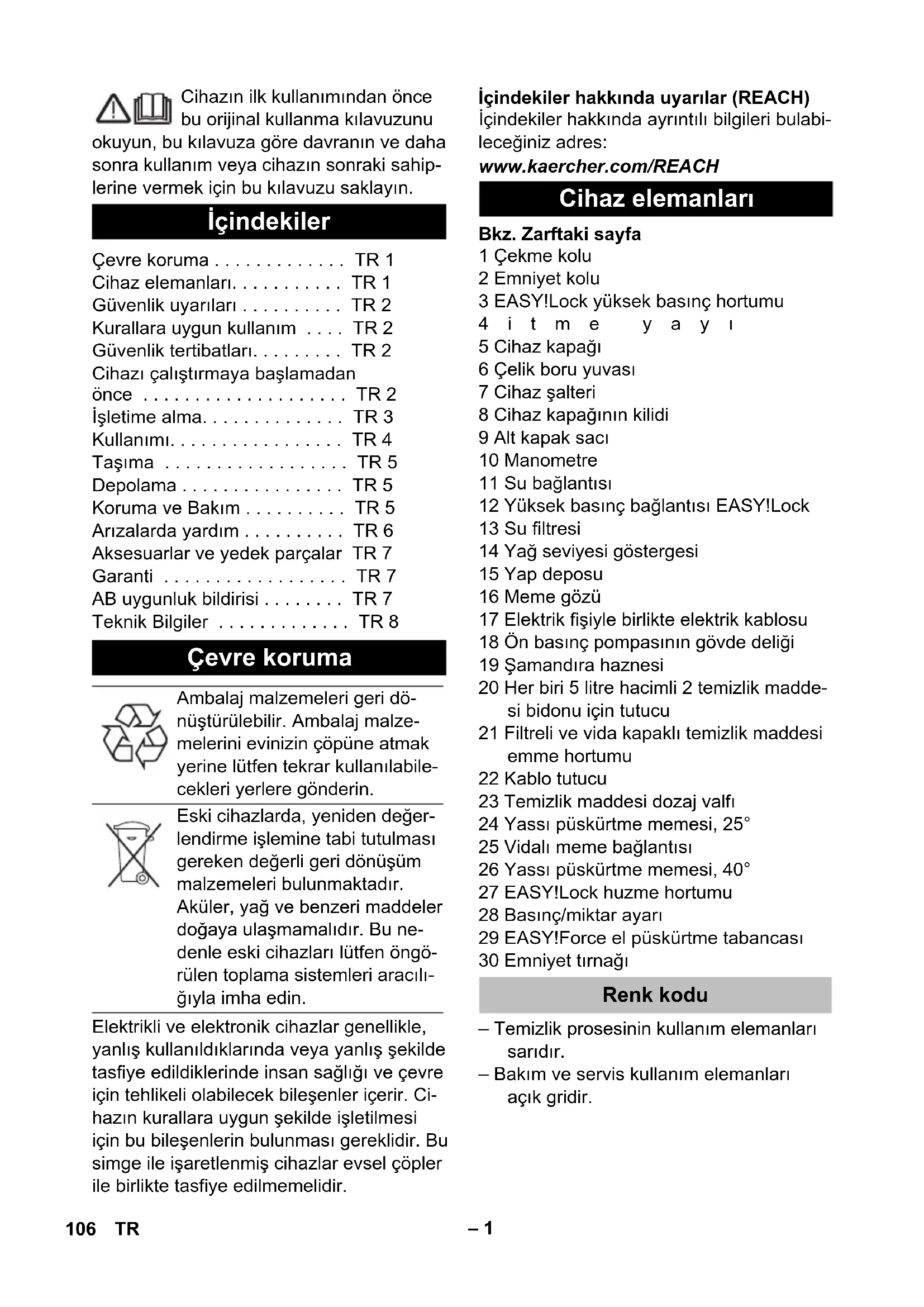 dB (A) 86 Υλικά λειτουργίας Ποσότητα λαδιού l 0,75 Τύπος λαδιού -- Hypoid SAE 90 Διαστάσεις και βάρη Μήκος mm 524 Πλάτος mm 650 Ύψος mm 1100 Τυπικό βάρος λειτουργίας kg 77 105EL– 1 Cihazın ilk kullanımından önce bu orijinal kullanma kılavuzunu okuyun, bu kılavuza göre davranın ve daha sonra kullanım veya cihazın sonraki sahip- lerine vermek için bu kılavuzu saklayın. Elektrikli ve elektronik cihazlar genellikle, yanlış kullanıldıklarında veya yanlış şekilde tasfiye edildiklerinde insan sağlığı ve çevre için tehlikeli olabilecek bileşenler içerir. Ci- hazın kurallara uygun şekilde işletilmesi için bu bileşenlerin bulunması gereklidir. Bu simge ile işaretlenmiş cihazlar evsel çöpler ile birlikte tasfiye edilmemelidir. İçindekiler hakkında uyarılar (REACH) İçindekiler hakkında ayrıntılı bilgileri bulabi- leceğiniz adres: www.kaercher.com/REACH Bkz. Zarftaki sayfa 1 Çekme kolu 2 Emniyet kolu 3 EASY!Lock yüksek basınç hortumu 4itme yayı 5 Cihaz kapağı 6 Çelik boru yuvası 7 Cihaz şalteri 8 Cihaz kapağının kilidi 9 Alt kapak sacı 10 Manometre 11 Su bağlantısı 12 Yüksek basınç bağlantısı EASY!Lock 13 Su filtresi 14 Yağ seviyesi göstergesi 15 Yap deposu 16 Meme gözü 17 Elektrik fişiyle birlikte elektrik kablosu 18 Ön basınç pompasının gövde deliği 19 Şamandıra haznesi 20 Her biri 5 litre hacimli 2 temizlik madde- si bidonu için tutucu 21 Filtreli ve vida kapaklı temizlik maddesi emme hortumu 22 Kablo tutucu 23 Temizlik maddesi dozaj valfı 24 Yassı püskürtme memesi, 25° 25 Vidalı meme bağlantısı 26 Yassı püskürtme memesi, 40° 27 EASY!Lock huzme hortumu 28 Basınç/miktar ayarı 29 EASY!Force el püskürtme tabancası 30 Emniyet tırnağı – Temizlik prosesinin kullanım elemanları sarıdır. – Bakım ve servis kullanım elemanları açık gridir. İçindekiler Çevre koruma . . . . . . . . . . . . . TR 1 Cihaz elemanları. . . . . . . . . . . TR 1 Güvenlik uyarıları . . . . . . . . . . TR 2 Kurallara uygun kullanım . . . . TR 2 Güvenlik tertibatları. . . . . . . . . TR 2 Cihazı çalıştırmaya başlamadan önce . . . . . . . . . . . . . . . . . . . . TR 2 İşletime alma. . . . . . . . . . . . . . TR 3 Kullanımı. . . . . . . . . . . . . . . . . TR 4 Taşıma . . . . . . . . . . . . . . . . . . TR 5 Depolama . . . . . . . . . . . . . . . . TR 5 Koruma ve Bakım . . . . . . . . . . TR 5 Arızalarda yardım . . . . . . . . . . TR 6 Aksesuarlar ve yedek parçalar TR 7 Garanti . . . . . . . . . . . . . . . . . . TR 7 AB uygunluk bildirisi . . . . . . . . TR 7 Teknik Bilgiler . . . . . . . . . . . . . TR 8 Çevre koruma Ambalaj malzemeleri geri dö- nüştürülebilir. Ambalaj malze- melerini evinizin çöpüne atmak yerine lütfen tekrar kullanılabile- cekleri yerlere gönderin. Eski cihazlarda, yeniden değer- lendirme işlemine tabi tutulması gereken değerli geri dönüşüm malzemeleri bulunmaktadır. Aküler, yağ ve benzeri maddeler doğaya ulaşmamalıdır. Bu ne- denle eski cihazları lütfen öngö- rülen toplama sistemleri aracılı- ğıyla imha edin. Cihaz elemanları Renk kodu 106 TR– 2 – İlk kullanımdan önce, 5.951-949.0 nu- maralı güvenlik uyarılarını mutlaka oku- yun! – Sıvı püskürtücülere dair kanunlardaki il- gili ulusal talimatlara dikkat edin. – Kaza önlemeye dair kanunlardaki ilgili ulusal talimatlara dikkat edin. Sıvı püs- kürtücüler düzenli olarak kontrol edil- meli ve kontrol sonucu yazılı olarak bel- gelenmelidir. – Cihazda/Aksesuarda değişiklikler yapıl- mamalıdır. TEHLIKE Ağır bedensel yaralanmalar ya da ölüme ne- den olan direkt bir tehlikeye yönelik uyarı. 몇 UYARI Ağır bedensel yaralanmalar ya da ölüme neden olabilecek olası tehlikeli bir duruma yönelik uyarı. 몇 TEDBIR Hafif yaralanmalara neden olabilecek olası tehlikeli bir duruma yönelik uyarı. DIKKAT Maddi hasarlara neden olabilecek olası tehlikeli bir duruma yönelik uyarı. Yüksek basınçlı tazyik, düzgün kullanılmadığı zaman tehlikeli olabilir. Tazyik kişilere, hayvanlara, etkin elektrik donanıma veya cihazın kendisine doğru tutulmalıdır. Geçerli yönetmeliklere göre, ci- haz, içme suyu şebekesinde sis- tem ayırıcısı olmadan çalıştırılma- malıd ır. KÄRCHER firmasının uy- gun bir sistem ayırıcısı veya alternatif ola- rak EN 12729 Tip B uyarınca bir sistem ayırıcısı kullanılmalıdır. Bir sistem ayırıcısından akan su, içilemez olarak sınıflandırılmıştır. 몇 TEDBIR Sistem ayırıcısını her zaman su beslemesi- ne bağlayın, cihaza kesinlikle bağlamayın. Bu cihaz, sadece temizlik maddesi ile/te- mizlik maddesiz yüksek basınç püskürterek (Örn; gıda sanayi, parçalama işletmeleri ...) temizleme için kullanılmalıdır. Basınç/miktar ayarlama ünitesi kullanılarak su miktarının azaltılması sırasında, taşma valfı açılır ve suyun bir bölümü pompanın emme tarafına geri akar. El püskürtme tabancasının tetiği bırakılırsa bir basınç şalteri pompayı kapatır, yüksek basınç huzmesi durdurulur. Tetik çekilirse pompa tekrar açılır. Emniyet valfı, izin verilen çalışma basıncı- nın aşılması durumunda açılır, su pompa gövdesine geri akar. Taşma valfı, basınç şalteri ve emniyet valfı fabrikada ayarlanmış ve mühürlenmiştir. Ayarlamalar sadece müşteri hizmetleri ta- rafından yapılabilir. Şamandıra haznesindeki su eksikliği emni- yeti, yetersiz su beslemesi durumunda (su basıncı çok düşükken) motoru kapatır. Pompa, kuru çalışmaya karşı korunur. – Çıkartırken ambalajın içindekileri kon- trol edin. – Nakliye hasarlarını hemen yetkili satıcı- ya bildirin. Güvenlik uyarıları Tehlike kademeleri Cihazdaki semboller Kurallara uygun kullanım Güvenlik tertibatları Basınç şalterli taşma valfı Emniyet valfı