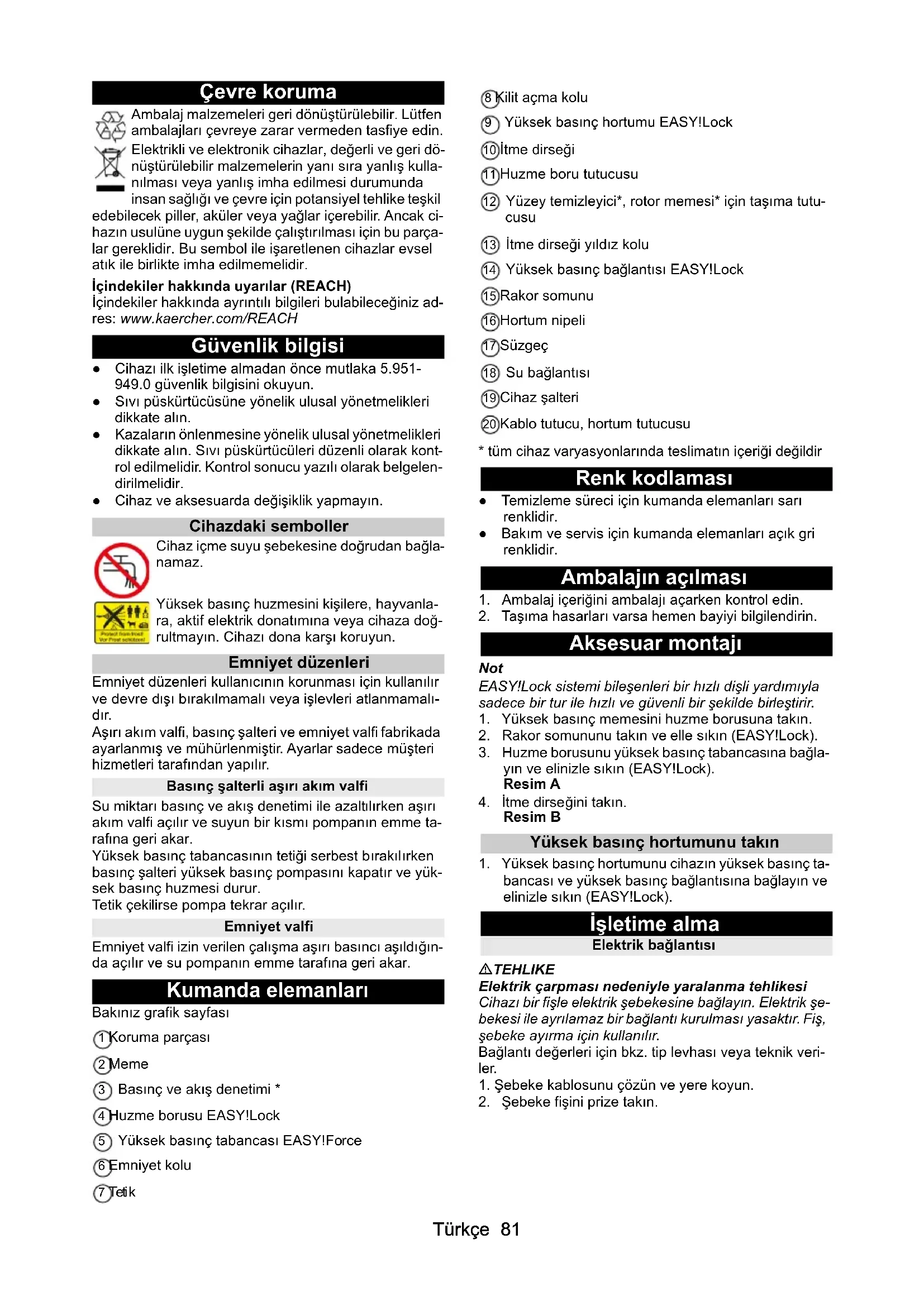 ● Sıvı püskürtücüsüne yönelik ulusal yönetmelikleri dikkate alın. ● Kazaların önlenmesine yönelik ulusal yönetmelikleri dikkate alın. Sıvı püskürtücüleri düzenli olarak kont- rol edilmelidir. Kontrol sonucu yazılı olarak belgelen- dirilmelidir. ● Cihaz ve aksesuarda değişiklik yapmayın. Cihazdaki semboller Cihaz içme suyu şebekesine doğrudan bağla- namaz. Yüksek basınç huzmesini kişilere, hayvanla- ra, aktif elektrik donatımına veya cihaza doğ- rultmayın. Cihazı dona karşı koruyun. Emniyet düzenleri Emniyet düzenleri kullanıcının korunması için kullanılır ve devre dışı bırakılmamalı veya işlevleri atlanmamalı- dır. Aşırı akım valfi, basınç şalteri ve emniyet valfi fabrikada ayarlanmış ve mühürlenmiştir. Ayarlar sadece müşteri hizmetleri tarafından yapılır. Basınç şalterli aşırı akım valfi Su miktarı basınç ve akış denetimi ile azaltılırken aşırı akım valfi açılır ve suyun bir kısmı pompanın emme ta- raf ına geri akar. Yüksek basınç tabancasının tetiği serbest bırakılırken basınç şalteri yüksek basınç pompasını kapatır ve yük- sek basınç huzmesi durur. Tetik çekilirse pompa tekrar açılır. Emniyet valfi Emniyet valfi izin verilen çalışma aşırı basıncı aşıldığın- da açılır ve su pompanın emme tarafına geri akar. Kumanda elemanları Bakınız grafik sayfası 1 Koruma parçası 2 Meme 3 Basınç ve akış denetimi * 4 Huzme borusu EASY!Lock 5 Yüksek basınç tabancası EASY!Force 6 Emniyet kolu 7 Teti k 8 Kilit açma kolu 9 Yüksek basınç hortumu EASY!Lock 10 İtme dirseği 11 Huzme boru tutucusu 12 Yüzey temizleyici*, rotor memesi* için taşıma tutu- cusu 13 İtme dirseği yıldız kolu 14 Yüksek basınç bağlantısı EASY!Lock 15 Rakor somunu 16 Hortum nipeli 17 Süzgeç 18 Su bağlantısı 19 Cihaz şalteri 20 Kablo tutucu, hortum tutucusu