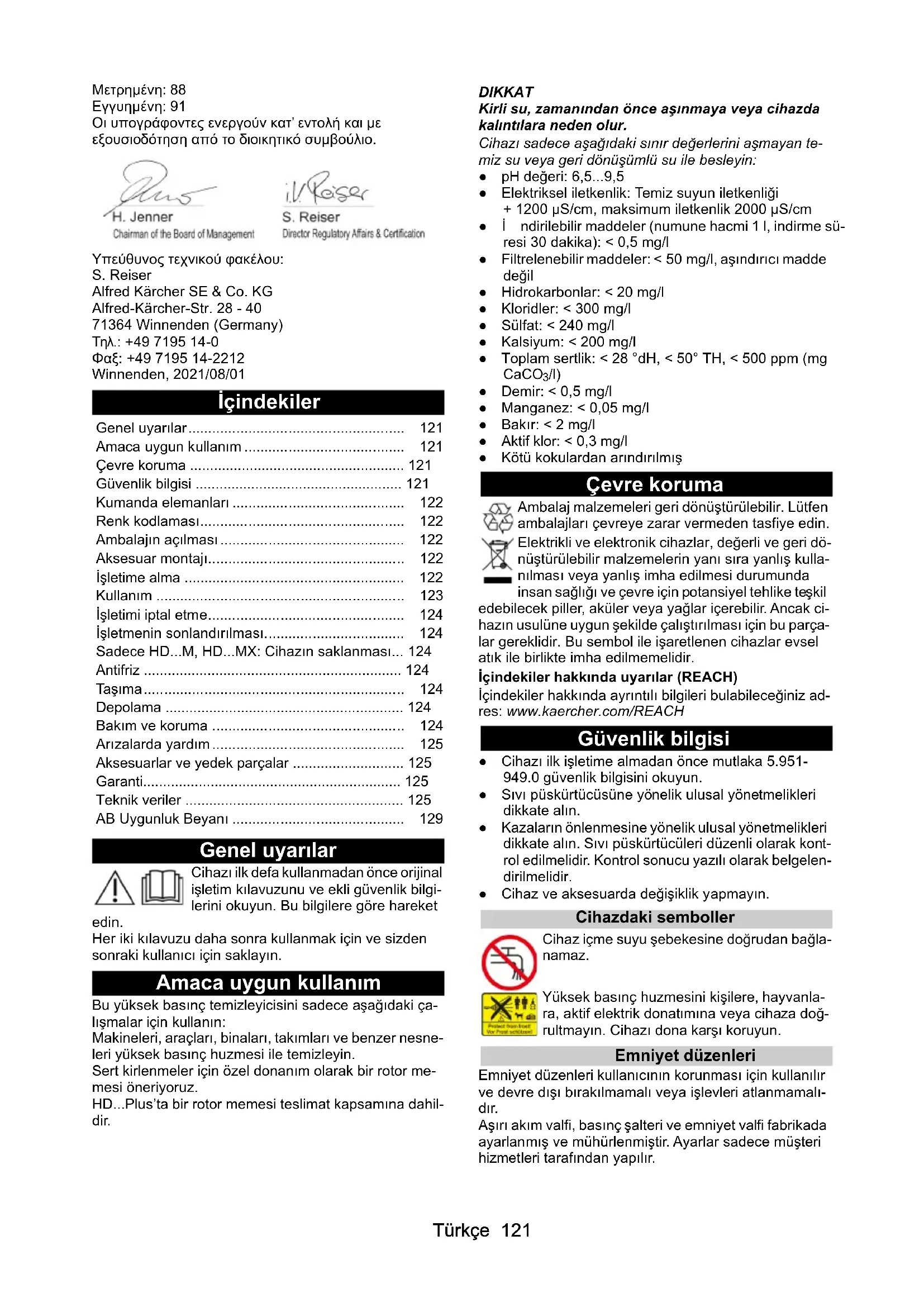 HD 8/18-4 M St HD 8/18-4 M St HD 8/18- 4MTürkçe 121 Μετρημένη: 88 Εγγυημένη: 91 Οι υπογράφοντες ενεργούν κατ’ εντολή και με εξουσιοδότηση από το διοικητικό συμβούλιο. Υπεύθυνος τεχνικού φακέλου: S. Reiser Alfred Kärcher SE & Co. KG Alfred-Kärcher-Str. 28 - 40 71364 Winnenden (Germany) Τηλ.: +49 7195 14-0 Φαξ: +49 7195 14-2212 Winnenden, 2021/08/01 İçindekiler Genel uyarılar Cihazı ilk defa kullanmadan önce orijinal işletim kılavuzunu ve ekli güvenlik bilgi- lerini okuyun. Bu bilgilere göre hareket edin. Her iki kılavuzu daha sonra kullanmak için ve sizden sonraki kullanıcı için saklayın. Amaca uygun kullanım Bu yüksek basınç temizleyicisini sadece aşağıdaki ça- lışmalar için kullanın: Makineleri, araçları, binaları, takımları ve benzer nesne- leri yüksek basınç huzmesi ile temizleyin. Sert kirlenmeler için özel donanım olarak bir rotor me- mesi öneriyoruz. HD...Plus’ta bir rotor memesi teslimat kapsamına dahil- dir. DIKKAT Kirli su, zamanından önce aşınmaya veya cihazda kalıntılara neden olur. Cihazı sadece aşağıdaki sınır değerlerini aşmayan te- miz su veya geri dönüşümlü su ile besleyin: ● pH değeri: 6,5...9,5 ● Elektriksel iletkenlik: Temiz suyun iletkenliği + 1200 µS/cm, maksimum iletkenlik 2000 µS/cm ●İndirilebilir maddeler (numune hacmi 1 l, indirme sü- resi 30 dakika): < 0,5 mg/l ● Filtrelenebilir maddeler: < 50 mg/l, aşındırıcı madde değil ● Hidrokarbonlar: < 20 mg/l ● Kloridler: < 300 mg/l ● Sülfat: < 240 mg/l ● Kalsiyum: < 200 mg/l ● Toplam sertlik: < 28 °dH, < 50° TH, < 500 ppm (mg CaCO