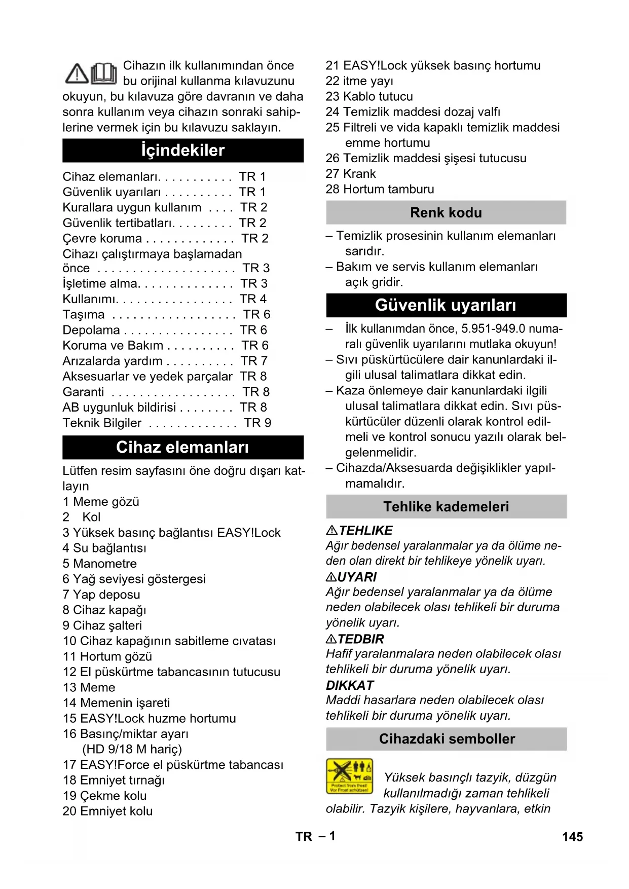 dB (A) 91 88 Υλικά λειτουργίας Ποσότητα λαδιού l 0,5 0,75 Τύπος λαδιού SAE 90 Hypoid Διαστάσεις και βάρη Μήκος mm 554 Πλάτος mm 509 Ύψος mm 1000 Βάρος χωρίς εξαρτήματα (MX) kg 48,6 42,1 (49) 47 (55) 48 (50) 144 EL– 1 Cihazın ilk kullanımından önce bu orijinal kullanma kılavuzunu okuyun, bu kılavuza göre davranın ve daha sonra kullanım veya cihazın sonraki sahip- lerine vermek için bu kılavuzu saklayın. Lütfen resim sayfasını öne doğru dışarı kat- layın 1 Meme gözü 2Kol 3 Yüksek basınç bağlantısı EASY!Lock 4 Su bağlantısı 5 Manometre 6 Yağ seviyesi göstergesi 7 Yap deposu 8 Cihaz kapağı 9 Cihaz şalteri 10 Cihaz kapağının sabitleme cıvatası 11 Hortum gözü 12 El püskürtme tabancasının tutucusu 13 Meme 14 Memenin işareti 15 EASY!Lock huzme hortumu 16 Basınç/miktar ayarı (HD 9/18 M hariç) 17 EASY!Force el püskürtme tabancası 18 Emniyet tırnağı 19 Çekme kolu 20 Emniyet kolu 21 EASY!Lock yüksek basınç hortumu 22 itme yayı 23 Kablo tutucu 24 Temizlik maddesi dozaj valfı 25 Filtreli ve vida kapaklı temizlik maddesi emme hortumu 26 Temizlik maddesi şişesi tutucusu 27 Krank 28 Hortum tamburu – Temizlik prosesinin kullanım elemanları sarıdır. – Bakım ve servis kullanım elemanları açık gridir.