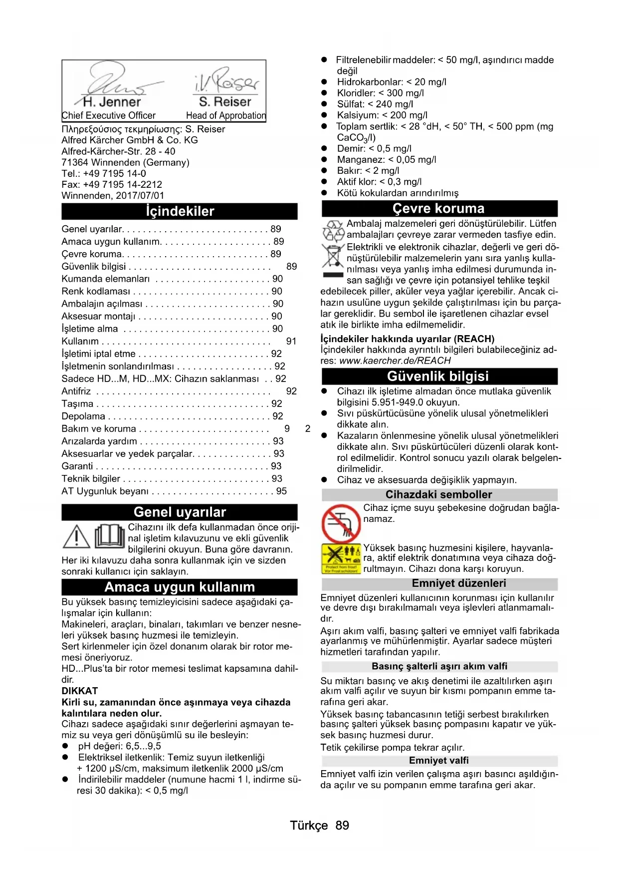 HD 8/18-4 M PU μετρούμενη εγγυημένη HD 6/15 M 87 90 HD 6/15 MX 87 90 HD 6/15 M PU 90 92 HD 7/17 M 92 95 HD 7/17 MX 91 94 HD 7/17 M PU 92 95 HD 7/14-4 M 81 84 HD 7/14-4 MX 82 85 HD 7/16-4 M 83 86 HD 7/16-4 MX 86 88 HD 8/18-4 M 88 91 HD 8/18-4 MX 87 89 HD 8/18-4 M PU 90 92Türkçe 89 Πληρεξούσιος τεκμηρίωσης: S. Reiser Alfred Kärcher GmbH & Co. KG Alfred-Kärcher-Str. 28 - 40 71364 Winnenden (Germany) Tel.: +49 7195 14-0 Fax: +49 7195 14-2212 Winnenden, 2017/07/01 İçindekiler Genel uyarılar Cihazını ilk defa kullanmadan önce oriji- nal işletim kılavuzunu ve ekli güvenlik bilgilerini okuyun. Buna göre davranın. Her iki kılavuzu daha sonra kullanmak için ve sizden sonraki kullanıcı için saklayın. Amaca uygun kullanım Bu yüksek basınç temizleyicisini sadece aşağıdaki ça- lışmalar için kullanın: Makineleri, araçları, binaları, takımları ve benzer nesne- leri yüksek basınç huzmesi ile temizleyin. Sert kirlenmeler için özel donanım olarak bir rotor me- mesi öneriyoruz. HD...Plus’ta bir rotor memesi teslimat kapsamına dahil- dir. DIKKAT Kirli su, zamanından önce aşınmaya veya cihazda kalıntılara neden olur. Cihazı sadece aşağıdaki sınır değerlerini aşmayan te- miz su veya geri dönüşümlü su ile besleyin: pH değeri: 6,5...9,5 Elektriksel iletkenlik: Temiz suyun iletkenliği + 1200 µS/cm, maksimum iletkenlik 2000 µS/cm İndirilebilir maddeler (numune hacmi 1 l, indirme sü- resi 30 dakika): < 0,5 mg/l Filtrelenebilir maddeler: < 50 mg/l, aşındırıcı madde değil Hidrokarbonlar: < 20 mg/l Kloridler: < 300 mg/l Sülfat: < 240 mg/l Kalsiyum: < 200 mg/l Toplam sertlik: < 28 °dH, < 50° TH, < 500 ppm (mg CaCO
