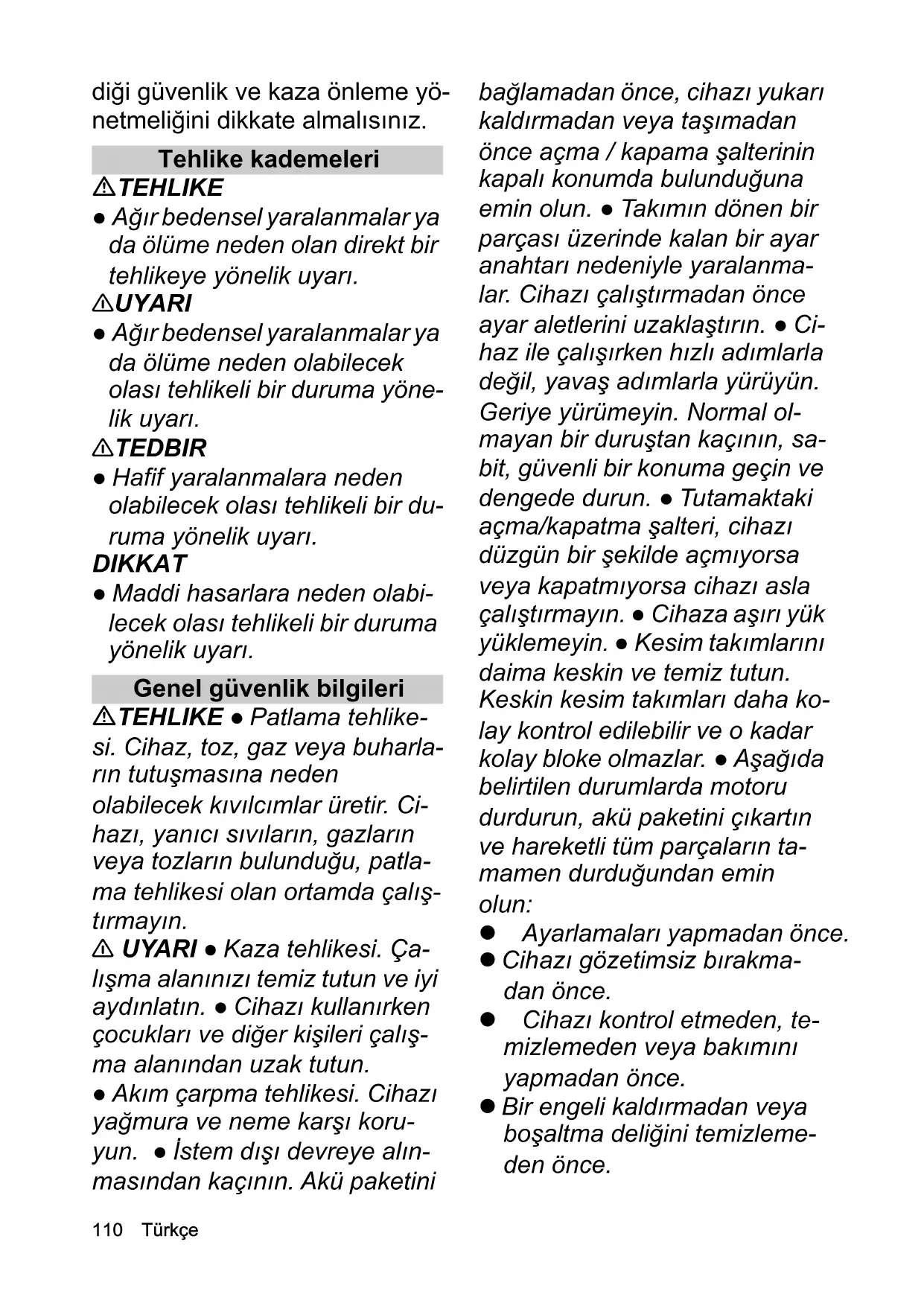 şma alanınızı temiz tutun ve iyi aydınlatın. ● Cihazı kullanırken çocukları ve diğer kişileri çalış- ma alanından uzak tutun. ● Akım çarpma tehlikesi. Cihazı yağmura ve neme karşı koru- yun. ● İstem dışı devreye alın- masından kaçının. Akü paketini bağlamadan önce, cihazı yukarı kaldırmadan veya taşımadan önce açma / kapama şalterinin kapalı konumda bulunduğuna emin olun. ● Takımın dönen bir parçası üzerinde kalan bir ayar anahtarı nedeniyle yaralanma- lar. Cihazı çalıştırmadan önce ayar aletlerini uzaklaştırın. ● Ci- haz ile çalışırken hızlı adımlarla değil, yavaş adımlarla yürüyün. Geriye yürümeyin. Normal ol- mayan bir duruştan kaçının, sa- bit, güvenli bir konuma geçin ve dengede durun. ● Tutamaktaki açma/kapatma şalteri, cihazı düzgün bir şekilde açmıyorsa veya kapatmıyorsa cihazı asla çalıştırmayın. ● Cihaza aşırı yük yüklemeyin. ● Kesim takımlarını daima keskin ve temiz tutun. Keskin kesim takımları daha ko- lay kontrol edilebilir ve o kadar kolay bloke olmazlar. ● Aşağıda belirtilen durumlarda motoru durdurun, akü paketini çıkartın ve hareketli tüm parçaların ta- mamen durduğundan emin olun: Ayarlamaları yapmadan önce. Cihazı gözetimsiz bırakma- dan önce. Cihazı kontrol etmeden, te- mizlemeden veya bakımını yapmadan önce. Bir engeli kaldırmadan veya boşaltma deliğini temizleme- den önce.Türkçe 111 Aksesuarları değiştirmeden önce. Bir yabancı cisim ile temas ol- duktan sonra. Yeniden başlat- madan önce cihazı hasara karşı kontrol edin ve hasarları giderin. Cihazda sıra dışı titreşim oldu- ğunda. Yeniden başlatmadan önce cihazı hasar olup olma- dığına dair kontrol edin ve ha- sarları onarın. 몇 TEDBIR ● Tepki kabiliyetinizi etkileyen ilaç veya uyuşturucu etkisi altında cihazı çalıştırma- nız izinli değildir. Cihazı sadece dinlenmiş ve sağlıklı durumday- ken çalıştırın. ● Cihaz ile çalış- ma esnas ında uygun koruyucu donanım takın. Toz maskesi, kaymaz ayakkabı, kask veya ko- ruyucu kulaklık gibi koruyucu donanım yaralanma tehlikesini azaltır. ● Tam kapatan koruyucu gözlük ve koruyucu kulaklık ta- kın. ● Koruyucu kulaklık, uyarı seslerini durma kabiliyetinizi kı- sıtlayabilir, bu nedenle çalışma alanında ve çalışma alanının ya- kınlarında olası tehlikelere dik- kat edin. ● Yukarıdan cisimlerin düşme tehlikesinin olduğu alan- larda çalışırken kask takın.UYA- RI ● Cihaz ile çalışırken uzun, ağır pantolon, uzun kollu giysiler ve kaymaz çizmeler giyin. Çıp- lak ayak çalışmayın. Sandalet veya kısa pantolon giymeyin. Sı- kı oturmayan giysiler veya ipleri ve bantları olan giysiler giymek- ten kaçının.TEDBIR ● Sıkı otur- mayan giysiler, saçlar veya takılar, cihazın hareketli parçala- rı tarafından kapıldığında yara- lanma tehlikesi söz konusudur. Giysi ve takıları, makinenin ha- reketli parçalarından uzak tutun. Uzun saçları toplayın. ● Tehlikeli durumlardan kaçınmak için, ci- hazı ve aksesuarını sadece bu talimatlara uygun olarak kulla- nın, çalışma şartlarını ve ger- çekleştirilecek işi dikkate alın. Güvenli işletme TEHLIKE ● Bıçak tarafından cisimlerin savrulması veya kes- me takımına telin veya ipin do- lanması sonucu ağı