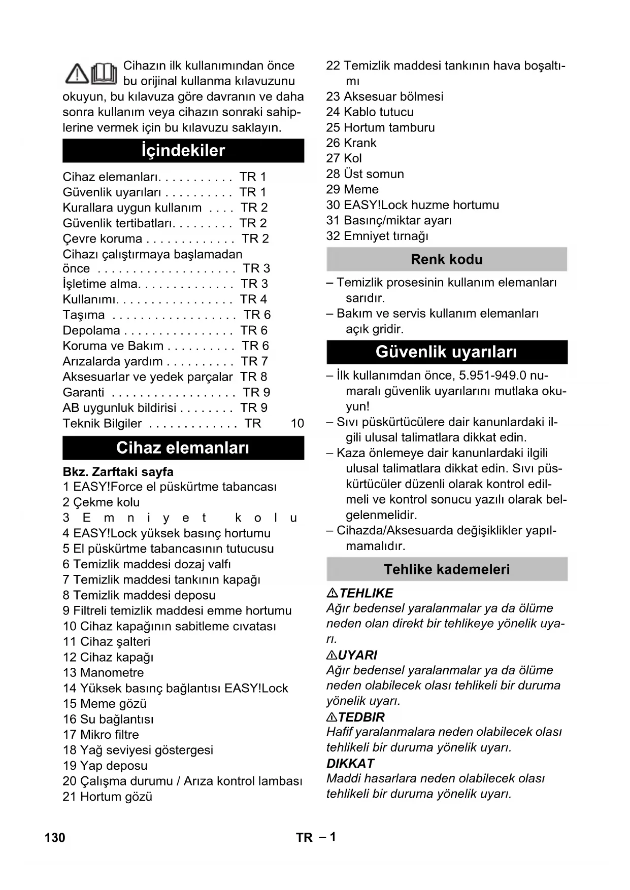 - 1.286-902.0: 75,5 kg; 1.286-903.0: 75,7 kg; 1.286-913.0: 69,1 kg; 1.286-927: 82,5 kg ** 1.286-914.0: 77,5 kg; 1.286-928.0: 86 kg 129EL– 1 Cihazın ilk kullanımından önce bu orijinal kullanma kılavuzunu okuyun, bu kılavuza göre davranın ve daha sonra kullanım veya cihazın sonraki sahip- lerine vermek için bu kılavuzu saklayın. Bkz. Zarftaki sayfa 1 EASY!Force el püskürtme tabancası 2 Çekme kolu 3Emniyet kolu 4 EASY!Lock yüksek basınç hortumu 5 El püskürtme tabancasının tutucusu 6 Temizlik maddesi dozaj valfı 7 Temizlik maddesi tankının kapağı 8 Temizlik maddesi deposu 9 Filtreli temizlik maddesi emme hortumu 10 Cihaz kapağının sabitleme cıvatası 11 Cihaz şalteri 12 Cihaz kapağı 13 Manometre 14 Yüksek basınç bağlantısı EASY!Lock 15 Meme gözü 16 Su bağlantısı 17 Mikro filtre 18 Yağ seviyesi göstergesi 19 Yap deposu 20 Çalışma durumu / Arıza kontrol lambası 21 Hortum gözü 22 Temizlik maddesi tankının hava boşaltı-