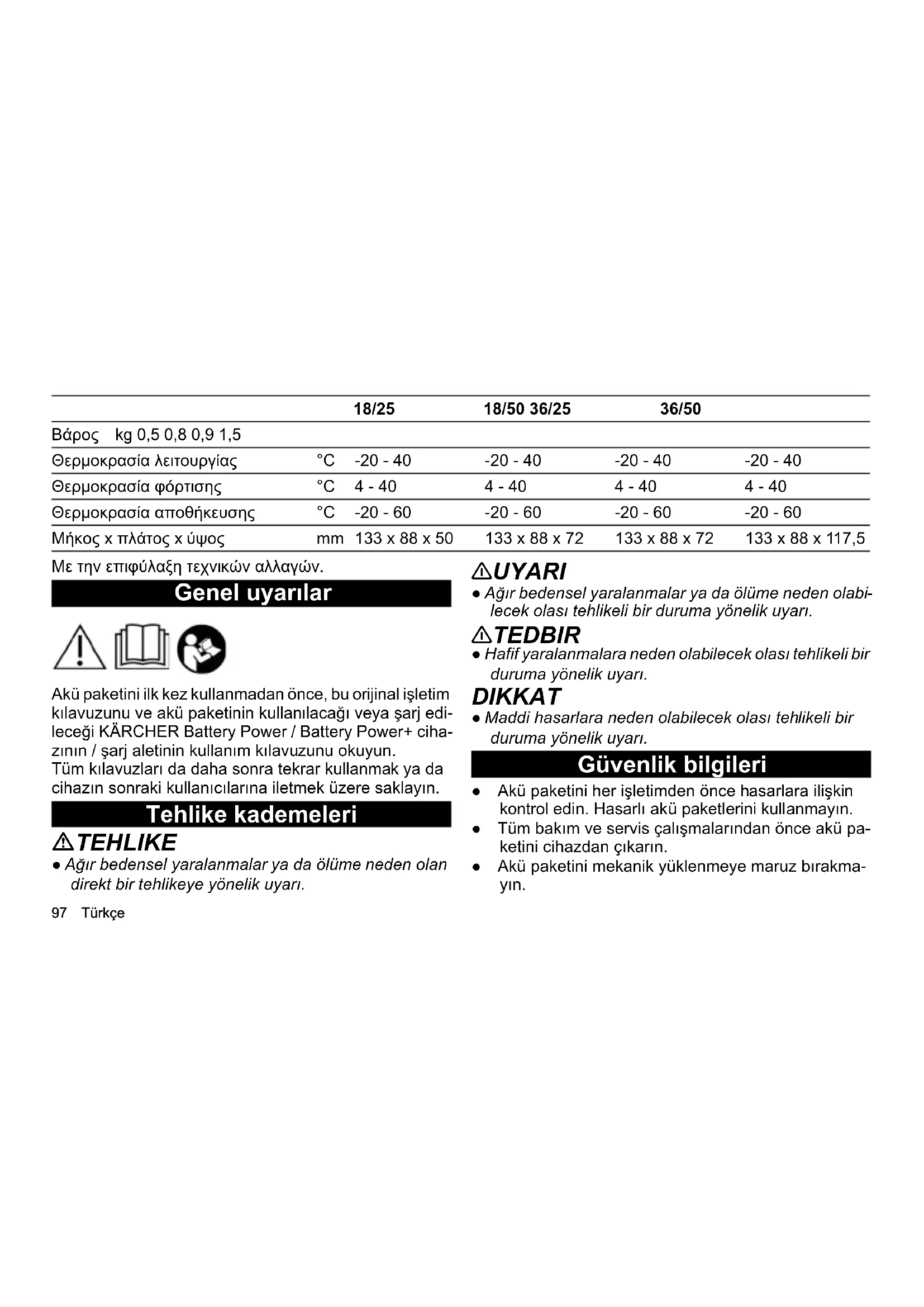V18183636 Πλατφόρμα μπαταριών Battery Power Battery Power Battery Power Battery Power Συμβατό με πλατφόρμα μπαταρίας Battery Power + Battery Power + Battery Power + Battery Power + Τύπος συστοιχίας μπαταριών Li-ION Li-ION Li-ION Li-ION Ονομαστική χωρητικότητα (κατά IEC/EN 61960) Ah 2,5 5,0 2,5 5,0 Ονομαστική ενέργεια Wh 45 90 90 180 Μέγιστο ρεύμα φόρτισης A 3,5 7,5 3,5 7,5 Διαστάσεις και βάρη97 Türkçe Με την επιφύλαξη τεχνικών αλλαγών. Genel uyarılar Akü paketini ilk kez kullanmadan önce, bu orijinal işletim kılavuzunu ve akü paketinin kullanılacağı veya şarj edi- leceği KÄRCHER Battery Power / Battery Power+ ciha- zının / şarj aletinin kullanım kılavuzunu okuyun. Tüm kılavuzları da daha sonra tekrar kullanmak ya da cihazın sonraki kullanıcılarına iletmek üzere saklayın. Tehlike kademeleri TEHLIKE ● Ağır bedensel yaralanmalar ya da ölüme neden olan direkt bir tehlikeye yönelik uyarı. 몇 UYARI ● Ağır bedensel yaralanmalar ya da ölüme neden olabi- lecek olası tehlikeli bir duruma yönelik uyarı. 몇 TEDBIR ● Hafif yaralanmalara neden olabilecek olası tehlikeli bir duruma yönelik uyarı. DIKKAT ● Maddi hasarlara neden olabilecek olası tehlikeli bir duruma yönelik uyarı. Güvenlik bilgileri ● Akü paketini her işletimden önce hasarlara ilişkin kontrol edin. Hasarlı akü paketlerini kullanmayın. ● Tüm bakım ve servis çalışmalarından önce akü pa- ketini cihazdan çıkarın. ● Akü paketini mekanik yüklenmeye maruz bırakma- yın. Βάρος kg 0,5 0,8 0,9 1,5 Θερμοκρασία λειτουργίας °C -20 - 40 -20 - 40 -20 - 40 -20 - 40 Θερμοκρασία φόρτισης °C 4 - 40 4 - 40 4 - 40 4 - 40 Θερμοκρασία αποθήκευσης °C -20 - 60 -20 - 60 -20 - 60 -20 - 60 Μήκος x πλάτος x ύψος mm 133 x 88 x 50 133 x 88 x 72 133 x 88 x 72 133 x 88 x 117,5 18/25 18/50 36/25 36/50Türkçe 98 ● Akü paketini düşürmeyin. ● Akü paketini suya batırmayın ve su huzmesi altında tutmayın. ● Akü paketini ıslak veya kirli durumda kullanmayın, şarj etmeyin ya da depolamayın. ● Akü paketi ıslanırsa hemen kurulayın. Temas nokta- larında nem kalmamasına dikkat edin. ● Akü paketini nemli veya ıslak bir ortamda depolama- yın veya şarj etmeyin. ● Akü paketini sadece onaylı şarj aletleri ile kullanın. ● Akü paketini gözetimsiz bırakmayın. Şarj işlemi sıra- sında akü paketinin ve şarj aletinin durumunu dü- zenli olarak kontrol edin. ●Şarj sırasında bir hata, sıra dışı koku veya ısı oluşu- mu tespit ederseniz, şarj aletini elektrik şebekesin- den ve akü paketini şarj aletinden ayır ın. Akü paketini ve şarj aletini hemen tasfiye edin ve taşıma ve tasfiye ile ilgili geçerli yönetmeliklere uyun. ● Akü paketini patlayıcı bir ortamda veya yanıcı cisim- lerin yakınında kullanmayın, şarj etmeyin veya de- polamayın. ● Akü paketlerini ateşe atmayın. ● Akü paketini ısıdan, keskin kenarlardan, yağdan, çözücü maddelerden, temizleme maddelerinden ve hareketli cihaz parçalarından uzak tutun. ● Kısa devre tehlikesi. Akü paketinin temas noktaları- nı metal parçalardan koruyun ve metal parçalarla birlikte muhafaza etmeyin. ● Akü paketini açmayın. Onarım işlemleri sadece yet- kili personel tarafından yapılmalıdır. ● Arızalı akülerden çıkan sıvıyla teması önleyin. Sıvı- ya temas edilmesi durumunda ilgili bölgeyi su ile yı- kayın ve göze temas etmesi durumunda doktorunuza başvurun. ● Kullanım ömrü sonunda akü paketini geçerli yönet- meliklere uygun olarak tasfiye edin. Taşımaya ilişkin güvenlik bilgileri Lityum iyon akü tehlikeli mallar kanununun taleplerine tabidir. Hasarsız ve işlevsel akü paketi kullanıcı tarafından ka- mu trafik alanında daha fazla kısıtlama olmaksızın taşı- nabilir. Üçüncü taraflarca (nakliye şirketleri) gönderimde, am- balaj ve etiketleme için özel taleplere uyun. Akü paketini sadece gövde hasarsız durumda ise kulla- nın. Açık kontakları yapıştırarak kapatın. Akü paketini sıkıca ve güvenli bir şekilde paketleyin. Akü paketi ambalaj içinde hareket etmemelidir.99 Türkçe TEHLIKE ● Arızalı veya çalışmayan bir akü paketi gönderilmemeli ve yerinde tekniğine uygun bir şekilde geçerli yönet- melikler uyarınca tasfiye edilmelidir. Yerel yönetmelikleri dikkate alın. Amaca uygun kullanım 몇 TEDBIR Patlama tehlikesi! Patlayan akü paketi nedeniyle yaralanmalar ve zararlar. Sadece hasarsız ve tam işlevsel akü paketlerini şarj edin, kullanın ve depolayın. Modifikasyonlar ve üretici tarafından izin verilmeyen de- ğişiklikler yasaklanmıştır. Diğer her türlü kullanım yasaktır. İzin verilmeyen kulla- nımdan kaynaklanan tehditlerden kullanıcı sorumludur. Akü paketlerini sadece KÄRCHER 18 V / 36 V pil gücü / pil gücü + sisteminden cihazlarla şarj edin ve kullanın. DIKKAT Akü paketleri sadece aynı gerilim türündeki (18 V veya 36 V) cihazlarla kullanılabilir! Farklı gerilim tipine sahip cihazlarla akü paketlerini kullanmayın veya şarj etme- yin. Kullanmadan önce, pil paketi ve cihazın gerilim tipinin (18 V / 36 V) uyumluluğunu kontrol edin. Gerilim bilgisi cihazda, akü paketinde ve tip levhaların- da bulunabilir. Çevre koruma Paketleme malzemeleri geri dönüştürülebilir. Lüt- fen ambalajı evsel çöpe atmayın ve geri dönüşü- me gönderin. Kullanılmış cihazlar, geri dönüştürülebilir özellikte olan ve değerlendirilmesi gereken değerli malze- meler içerir. Piller ve akü paketleri, çevreye bıra- kılmaması gereken maddeler içerir. Lütfen eski cihazları, pilleri ve akü paketlerini uygun toplama sis- temlerine götürün. Yasa koyucunun lityum akülerin kullanımıyl