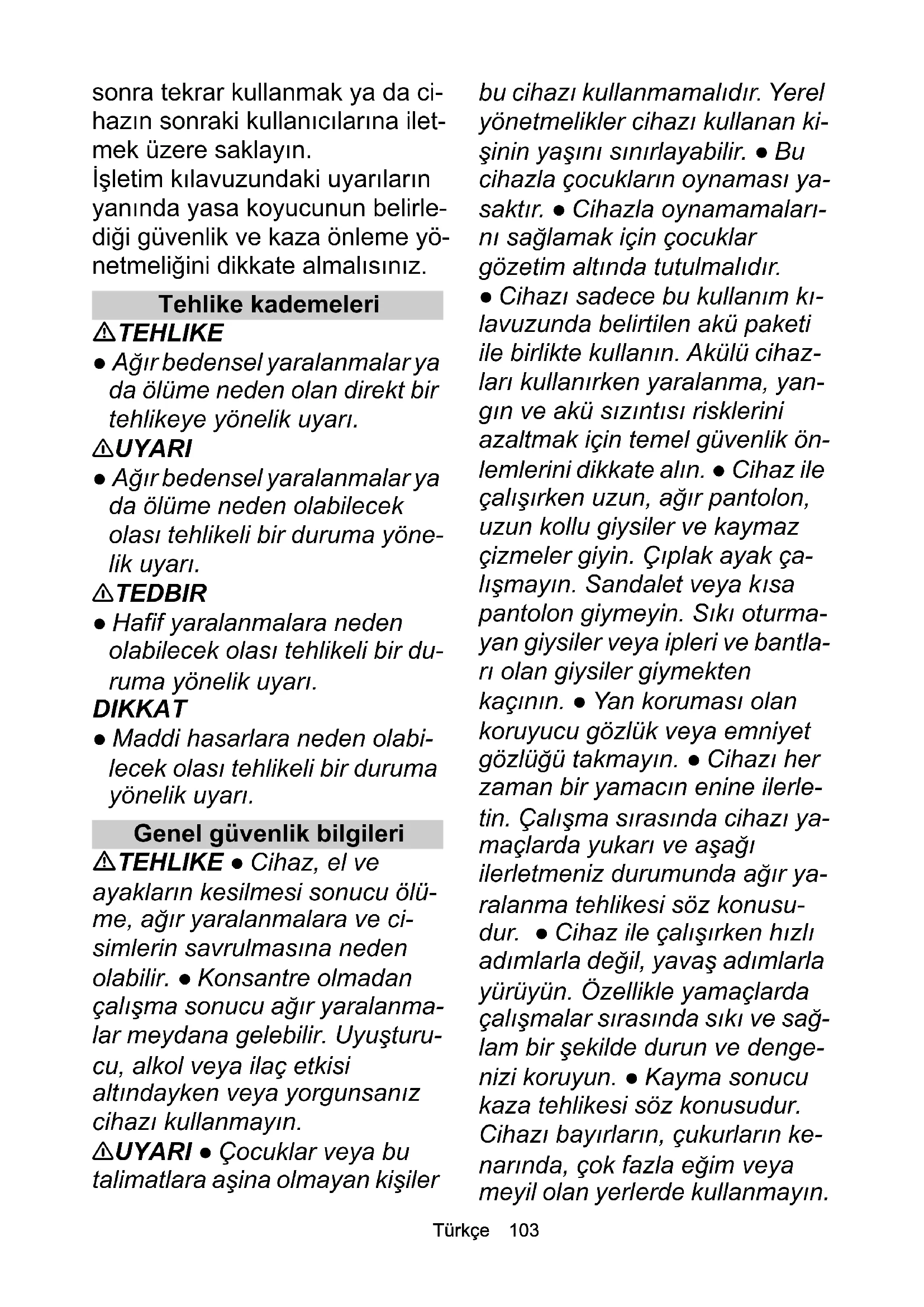 - AB Uygunluk Beyanı Chairman of the Board of ManagementDirector Regulatory Affairs & Certification H. Jenner S. ReiserTürkçe 103 sonra tekrar kullanmak ya da ci- hazın sonraki kullanıcılarına ilet- mek üzere saklayın. İşletim kılavuzundaki uyarıların yanında yasa koyucunun belirle- diği güvenlik ve kaza önleme yö- netmeliğini dikkate almalısınız. Tehlike kademeleri TEHLIKE ● Ağır bedensel yaralanmalar ya da ölüme neden olan direkt bir tehlikeye yönelik uyarı. 몇 UYARI ● Ağır bedensel yaralanmalar ya da ölüme neden olabilecek olası tehlikeli bir duruma yöne- lik uyarı. 몇 TEDBIR ● Hafif yaralanmalara neden olabilecek olası tehlikeli bir du- ruma yönelik uyarı. DIKKAT ● Maddi hasarlara neden olabi- lecek olası tehlikeli bir duruma yönelik uyarı. Genel güvenlik bilgileri TEHLIKE ● Cihaz, el ve ayakların kesilmesi sonucu ölü- me, ağır yaralanmalara ve ci- simlerin savrulmasına neden olabilir. ● Konsantre olmadan çalışma sonucu ağır yaralanma- lar meydana gelebilir. Uyuşturu- cu, alkol veya ilaç etkisi altındayken veya yorgunsanız cihazı kullanmayın. 몇 UYARI ● Çocuklar veya bu talimatlara aşina olmayan kişiler bu cihazı kullanmamalıdır. Yerel yönetmelikler cihazı kullanan ki- şinin yaşını sınırlayabilir. ● Bu cihazla çocukların oynaması ya- saktır. ● Cihazla oynamamaları- nı sağlamak için çocuklar gözetim altında tutulmalıdır. ● Cihazı sadece bu kullanım kı- lavuzunda belirtilen akü paketi ile birlikte kullanın. Akülü cihaz- ları kullanırken yaralanma, yan- gın ve akü sızıntısı risklerini azaltmak için temel güvenlik ön- lemlerini dikkate alın. ● Cihaz ile çalışırken uzun, ağır pantolon, uzun kollu giysiler ve kaymaz çizmeler giyin. Çıplak ayak ça- lışmayın. Sandalet veya k ısa pantolon giymeyin. Sıkı oturma- yan giysiler veya ipleri ve bantla- rı olan giysiler giymekten kaçının. ● Yan koruması olan koruyucu gözlük veya emniyet gözlüğü takmayın. ● Cihazı her zaman bir yamacın enine ilerle- tin. Çalışma sırasında cihazı ya- maçlarda yukarı ve aşağı ilerletmeniz durumunda ağır ya- ralanma tehlikesi söz konusu- dur. ● Cihaz ile çalışırken hızlı adımlarla değil, yavaş adımlarla yürüyün. Özellikle yamaçlarda çalışmalar sırasında sı kı ve sağ- lam bir şekilde durun ve denge- nizi koruyun. ● Kayma sonucu kaza tehlikesi söz konusudur. Cihazı bayırların, çukurların ke- narında, çok fazla eğim veya meyil olan yerlerde kullanmayın.104 Türkçe 몇 TEDBIR ● Kumanda eleman- ları ve cihazın kurallara uygun kullanımı ile ilgili bilgileri öğre- nin. İşyeri güvenliği TEHLIKE ● Bıçak tarafından cisimlerin savrulması veya kes- me takımına telin veya ipin do- lanması sonucu ağır yaralanmalar söz konusudur. Ci- hazı kullanmadan önce çalışma alanını dikkatlice taş, sopa, me- tal, kemik ve oyuncak gibi cisim- ler olup olmadığına dair kontrol edin ve bu cisimleri uzaklaştırın. ● Cihazın 15 m'lik çevresinde in- sanların, özellikler çocuk veya hayvanların bulunması halinde cihazı asla kullanmayın, çünkü bıçak tarafından cisimlerin sav- rulması tehlikesi söz konusudur. ● Patlama tehlikesi. Cihaz, toz, gaz veya buharların tutuşmas p. 109