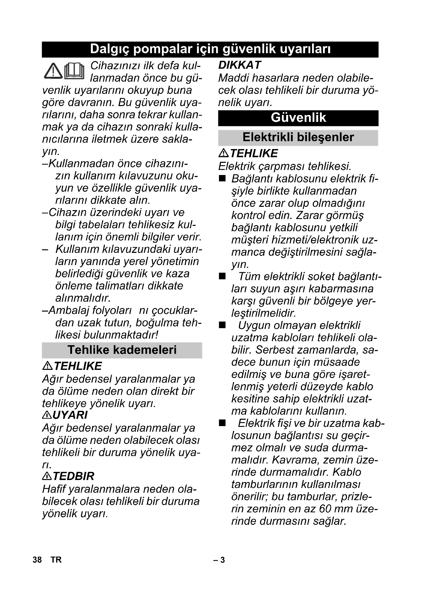 λασπώδη ύδατα, τα οποία έχουν μικρότερη ρευ- στότητα από το καθαρό νερό. Μην αντλείτε νερό με θερμο- κρασία άνω των 35°C. Ασφαλής χρήση Λοιποί κίνδυνοι 37EL– 3 Cihazınızı ilk defa kul- lanmadan önce bu gü- venlik uyarılarını okuyup buna göre davranın. Bu güvenlik uya- rılarını, daha sonra tekrar kullan- mak ya da cihazın sonraki kulla- nıcılarına iletmek üzere sakla- yın. – Kullanmadan önce cihazını- zın kullanım kılavuzunu oku- yun ve özellikle güvenlik uya- rılarını dikkate alın. – Cihazın üzerindeki uyarı ve bilgi tabelaları tehlikesiz kul- lanım için önemli bilgiler verir. – Kullanım kılavuzundaki uyarı- ların yanında yerel yönetimin belirlediği güvenlik ve kaza önleme talimatları dikkate alınmalıdır. – Ambalaj folyoları nı çocuklar- dan uzak tutun, boğulma teh- likesi bulunmaktadır! TEHLIKE Ağır bedensel yaralanmalar ya da ölüme neden olan direkt bir tehlikeye yönelik uyarı. 몇 UYARI Ağır bedensel yaralanmalar ya da ölüme neden olabilecek olası tehlikeli bir duruma yönelik uya- rı. 몇 TEDBIR Hafif yaralanmalara neden ola- bilecek olası tehlikeli bir duruma yönelik uyarı. DIKKAT Maddi hasarlara neden olabile- cek olası tehlikeli bir duruma yö- nelik uyarı. TEHLIKE Elektrik çarpması tehlikesi. Bağlantı kablosunu elektrik fi- şiyle birlikte kullanmadan önce zarar olup olmadığını kontrol edin. Zarar görmüş bağlantı kablosunu yetkili müşteri hizmeti/elektronik uz- manca değiştirilmesini sağla- yın. Tüm elektrikli soket bağlantı- ları suyun aşırı kabarması