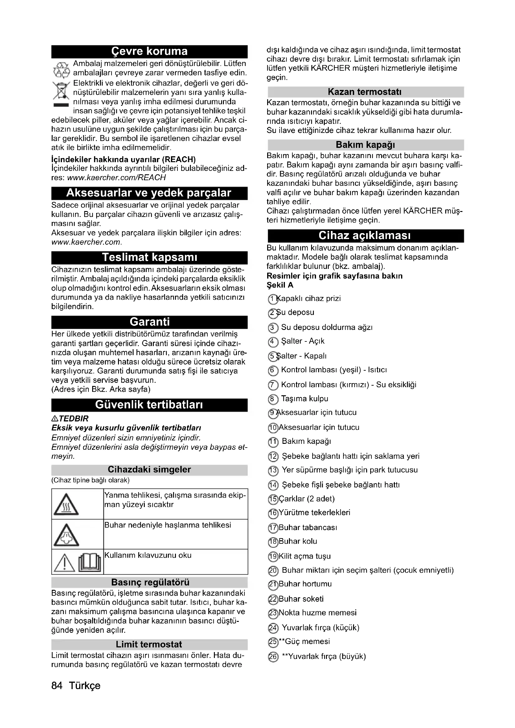 - Teknik bilgiler Türkçe Çevre koruma Ambalaj malzemeleri geri dönüştürülebilir. Lütfen ambalajları çevreye zarar vermeden tasfiye edin. Elektrikli ve elektronik cihazlar, değerli ve geri dö- nüştürülebilir malzemelerin yanı sıra yanlış kulla- nılması veya yanlış imha edilmesi durumunda insan sağlığı ve çevre için potansiyel tehlike teşkil edebilecek piller, aküler veya yağlar içerebilir. Ancak ci- hazın usulüne uygun şekilde çalıştırılması için bu parça- lar gereklidir. Bu sembol ile işaretlenen cihazlar evsel atık ile birlikte imha edilmemelidir. İçindekiler hakkında uyarılar (REACH) İçindekiler hakkında ayrıntılı bilgileri bulabileceğiniz ad- res: www.kaercher.com/REACH Aksesuarlar ve yedek parçalar Sadece orijinal aksesuarlar ve orijinal yedek parçalar kullanın. Bu parçalar cihazın güvenli ve arızasız çalış- masını sağlar. Aksesuar ve yedek parçalara ilişkin bilgiler için adres: www.kaercher.com. Teslimat kapsamı Cihazınızın teslimat kapsamı ambalajı üzerinde göste- rilmiştir. Ambalaj açıldığında içindeki parçalarda eksiklik olup olmadığını kontrol edin. Aksesuarların eksik olması durumunda ya da nakliye hasarlarında yetkili satıcınızı bilgilendirin. Garanti Her ülkede yetkili distribütörümüz tarafından verilmiş garanti şartları geçerlidir. Garanti süresi içinde cihazı- nızda oluşan muhtemel hasarları, arızanın kaynağı üre- tim veya malzeme hatası olduğu sürece ücretsiz olarak karşılıyoruz. Garanti durumunda satış fişi ile satıcıya veya yetkili servise başvurun. (Adres için Bkz. Arka sayfa) Güvenlik tertibatları 몇 TEDBIR Eksik veya kusurlu güvenlik tertibatları Emniyet düzenleri sizin emniyetiniz içindir. Emniyet düzenlerini asla değiştirmeyin veya baypas et- meyin. Cihazdaki simgeler (Cihaz tipine bağlı olarak) Basınç regülatörü Basınç regülatörü, işletme sırasında buhar kazanındaki basıncı mümkün olduğunca sabit tutar. Isıtıcı, buhar ka- zanı maksimum çalışma basıncına ulaşınca kapanır ve buhar boşaltıldığında buhar kazanının basıncı düştü- ğünde yeniden açılır. Limit termostat Limit termostat cihazın aşırı ısınmasını önler. Hata du- rumunda basınç regülatörü ve kazan termostatı devre dışı kaldığında ve cihaz aşırı ısındığında, limit termostat cihazı devre dışı bırakır. Limit termostatı sıfırlamak için lütfen yetkili KÄRCHER müşteri hizmetleriyle iletişime geçin. Kazan termostatı Kazan termostatı, örneğin buhar kazanında su bittiği ve buhar kazanındaki sıcaklık yükseldiği gibi hata durumla- rında ısıtıcıyı kapatır. Su ilave ettiğinizde cihaz tekrar kullanıma hazır olur. Bakım kapağı Bakım kapağı, buhar kazanını mevcut buhara karşı ka- patır. Bakım kapağı aynı zamanda bir aşırı basınç valfi- dir. Basınç regülatörü arızalı olduğunda ve buhar kazanındaki buhar basıncı yükseldiğinde, aşırı basınç valfi açılır ve buhar bakım kapağı üzerinden kazandan tahliye edilir. Cihazı çalıştırmadan önce lütfen yerel KÄRCHER müş- teri hizmetleriyle iletişime geçin. Cihaz açıklaması Bu kullanım kılavuzunda maksimum donanım açıklan- maktadır. Modele bağlı olarak teslimat kapsamında farklılıklar bulunur (bkz. ambalaj). Resimler için grafik sayfasına bakın Şekil A 1 Kapaklı cihaz prizi 2 Su deposu 3 Su deposu doldurma ağzı 4 Şalter - Açık 5 Şalter - Kapalı 6 Kontrol lambası (yeşil) - Isıtıcı 7 Kontrol lambası (kırmızı) - Su eksikliği 8 Taşıma kulpu 9 Aksesuarlar için tutucu 10 Aksesuarlar için tutucu 11 Bakım kapağı 12 Şebeke bağlantı hattı için saklama yeri 13 Yer süpürme başlığı için park tutucusu 14 Şebeke fişli şebeke bağlantı hattı 15 Çarklar (2 adet) 16 Yürütme tekerlekleri 17 Buhar tabancası 18 Buhar kolu 19 Kilit açma tuşu 20 Buhar miktarı için seçim şalteri (çocuk emniyetli) 21 Buhar hortumu 22 Buhar soketi 23 Nokta huzme memesi 24 Yuvarlak fırça (küçük) 25 **Güç memesi 26 **Yuvarlak fırça (büyük) Yanma tehlikesi, çalışma sırasında ekip- man yüzeyi sıcaktır Buhar nedeniyle haşlanma tehlikesi Kullanım kılavuzunu okuTürkçe 85 27 El memesi 28 El memesi için mikrofiber kılıf 29 Uzatma boruları (2 adet) 30 Kilit açma tuşu 31 Yer süpürme başlığı 32 Cırt cırt bağlantısı 33 Mikrofiber yer bezi (1 adet) 34 **Mikrofiber yer bezi (2 adet) 35 **Halı temizleme başlığı 36 Kireç giderici 37 Buhar basınçlı ütü 38 Kontrol lambası (turuncu) - ısıtıcı 39 Buhar şalteri (alt) 40 Buhar soketi ** İsteğe bağlı Montaj Aksesuarların montajı p. 8984