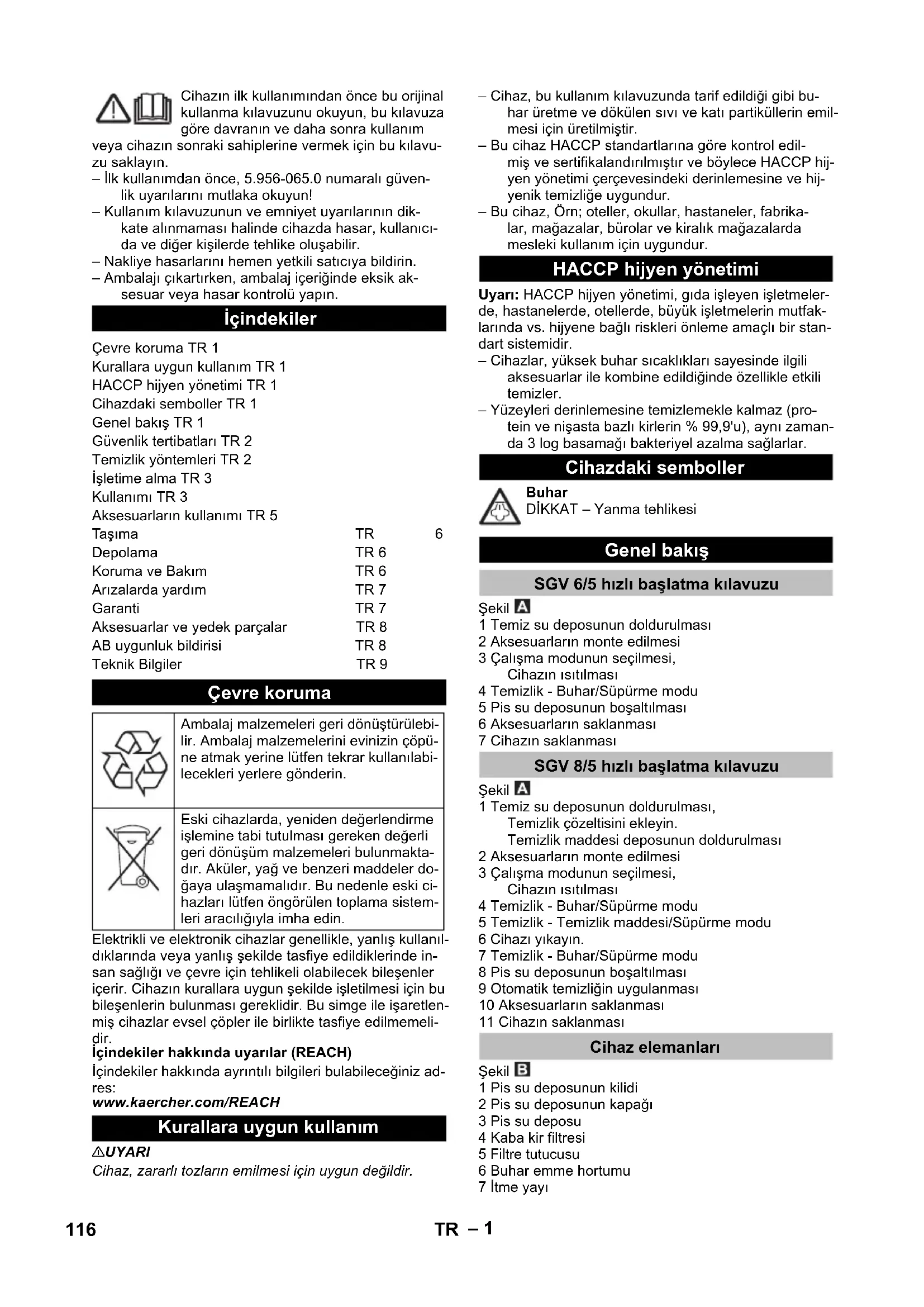 Αριθ. ανταλλ. Μήκος καλωδίου EU 6.648-098.0 7,5 m GB 6.648-102.0 7,5 m CH 6.648-119.0 7,5 m AU 6.650-709.0 7,5 m 115EL– 1 Cihazın ilk kullanımından önce bu orijinal kullanma kılavuzunu okuyun, bu kılavuza göre davranın ve daha sonra kullanım veya cihazın sonraki sahiplerine vermek için bu kılavu- zu saklayın. – İlk kullanımdan önce, 5.956-065.0 numaralı güven- lik uyarılarını mutlaka okuyun! – Kullanım kılavuzunun ve emniyet uyarılarının dik- kate alınmaması halinde cihazda hasar, kullanıcı- da ve diğer kişilerde tehlike oluşabilir. – Nakliye hasarlarını hemen yetkili satıcıya bildirin. – Ambalajı çıkartırken, ambalaj içeriğinde eksik ak- sesuar veya hasar kontrolü yapın. Elektrikli ve elektronik cihazlar genellikle, yanlış kullanıl- dıklarında veya yanlış şekilde tasfiye edildiklerinde in- san sağlığı ve çevre için tehlikeli olabilecek bileşenler içerir. Cihazın kurallara uygun şekilde işletilmesi için bu bileşenlerin bulunması gereklidir. Bu simge ile işaretlen- miş cihazlar evsel çöpler ile birlikte tasfiye edilmemeli- dir. İçindekiler hakkında uyarılar (REACH) İçindekiler hakkında ayrıntılı bilgileri bulabileceğiniz ad- res: www.kaercher.com/REACH 몇 UYARI Cihaz, zararlı tozların emilmesi için uygun değildir. – Cihaz, bu kullanım kılavuzunda tarif edildiği gibi bu- har üretme ve dökülen sıvı ve katı partiküllerin emil- mesi için üretilmiştir. – Bu cihaz HACCP standartlarına göre kontrol edil- miş ve sertifikalandırılmıştır ve böylece HACCP hij- yen yönetimi çerçevesindeki derinlemesine ve hij- yenik temizliğe uygundur. – Bu cihaz, Örn; oteller, okullar, hastaneler, fabrika- lar, mağazalar, bürolar ve kiralık mağazalarda mesleki kullanım için uygundur. Uyarı: HACCP hijyen yönetimi, gıda işleyen işletmeler- de, hastanelerde, otellerde, büyük işletmelerin mutfak- larında vs. hijyene bağlı riskleri önleme amaçlı bir stan- dart sistemidir. – Cihazlar, yüksek buhar sıcaklıkları sayesinde ilgili aksesuarlar ile kombine edildiğinde özellikle etkili temizler. – Yüzeyleri derinlemesine temizlemekle kalmaz (pro- tein ve nişasta bazlı kirlerin % 99,9'u), aynı zaman- da 3 log basamağı bakteriyel azalma sağlarlar. Buhar DİKKAT – Yanma tehlikesi Şekil 1 Temiz su deposunun doldurulması 2 Aksesuarların monte edilmesi 3 Çalışma modunun seçilmesi, Cihazın ısıtılması 4 Temizlik - Buhar/Süpürme modu 5 Pis su deposunun boşaltılması 6 Aksesuarların saklanması 7 Cihazın saklanması Şekil 1 Temiz su deposunun doldurulması, Temizlik çözeltisini ekleyin. Temizlik maddesi deposunun doldurulması 2 Aksesuarların monte edilmesi 3 Çalışma modunun seçilmesi, Cihazın ısıtılması 4 Temizlik - Buhar/Süpürme modu 5 Temizlik - Temizlik maddesi/Süpürme modu 6 Cihazı yıkayın. 7 Temizlik - Buhar/Süpürme modu 8 Pis su deposunun boşaltılması 9 Otomatik temizliğin uygulanması 10 Aksesuarların saklanması 11 Cihazın saklanması Şekil 1 Pis su deposunun kilidi 2 Pis su deposunun kapağı 3 Pis su deposu 4 Kaba kir filtresi 5 Filtre tutucusu 6 Buhar emme hortumu 7 İtme yayı İçindekiler Çevre koruma TR 1 Kurallara uygun kullanım TR 1 HACCP hijyen yönetimi TR 1 Cihazdaki semboller TR 1 Genel bakış TR 1 Güvenlik tertibatları TR 2 Temizlik yöntemleri TR 2 İşletime alma TR 3 Kullanımı TR 3 Aksesuarların kullanımı TR 5 Taşıma TR 6 Depolama TR 6 Koruma ve Bakım TR 6 Arızalarda yardım TR 7 Garanti TR 7 Aksesuarlar ve yedek parçalar TR 8 AB uygunluk bildirisi TR 8 Teknik Bilgiler TR 9 Çevre koruma Ambalaj malzemeleri geri dönüştürülebi- lir. Ambalaj malzemelerini evinizin çöpü- ne atmak yerine lütfen tekrar kullanılabi- lecekleri yerlere gönderin. Eski cihazlarda, yeniden değerlendirme işlemine tabi tutulması gereken değerli geri dönüşüm malzemeleri bulunmakta- dır. Aküler, yağ ve benzeri maddeler do- ğaya ulaşmamalıdır. Bu nedenle eski ci- hazları lütfen öngörülen toplama sistem- leri aracılığıyla imha edin. Kurallara uygun kullanım HACCP hijyen yönetimi Cihazdaki semboller Genel bakış SGV 6/5 hızlı başlatma kılavuzu SGV 8/5 hızlı başlatma kılavuzu Cihaz elemanları 116 TR– 2 8 Hortum desteği 9 Aksesuar adaptörü (Homebase) 10 Buharlı süpürme borusu tutucusu (park pozisyonu) 11 Buharlı süpürme borusunun yuvası (otomatik te- mizlik) (sadece SGV 8/5) 12 Taban memesinin tutucusu (park pozisyonu) 13 El freniyle birlikte direksiyon makarası 14 Temizlik maddesi deposu (SGV 8/5) Temizlik maddesi püskürtme şişesinin deposu (SGV 6/5) 15 Tutamak çukuru 16 Temiz su deposu 17 Aksesuar prizi 18 Aksesuar soketinin kilidi 19 Taban memesinin sızdırmazlık dudağı soketi 20 Taban memesi 21 Taban memesi soketlerinin kilidi 22 Üçgen meme 23 Aksesuar soketi 24 Aksesuar prizinin kapağı 25 Kumanda alanı 26 Aksesuar bölmesinin kapağı 27 Aksesuar bölmesi 28 Aksesuar kilidi 29 Temizlik maddesi deposunun döner kapağı (SGV 8/5) 30 Temiz su deposunun döner kapağı 31 Temiz su deposunun taşıma kolu, katlanır 32 Temizlik maddesi püskürtme şişesi (SGV 6/5) 33 Buharlı süpürme borusu 34 Yuvarlak fırça 35 Tutamak 36 Nokta püskürtme memesi/derz memesi adaptörü 37 Nokta püskürtme memesi uzatması 38 El memesinin kauçuk dudağı 39 Hassas temizleme ucu 40 El memesinin fırça çarkı 41 Oluk memesi 42 Taban memesinin meme şeridi soketi 43 Basamak yuvası 44 Taban memesi gözü 45 Kablo kancası, döner 46 Hava çıkışı, çalışma havası 47 Buharlı süpürme borusu tutucusu 48 Elektrik kablosu 49 Üçgen meme tutucusu 50 Hızlı başlatma kılavuzu 51 Pis su deposunun kapağı 52 Pis su deposunun kilidi 53 Tip levhası Şekil 10/OFF 2 Çalışma modu: Soğuk su/süpürme modu 3 Çalışma modu: Buhar/sıcak su/soğuk su/süpürme modu (eco!efficiency) 4 Çalışma modu: Buhar/sıcak su/soğuk su/süpürme