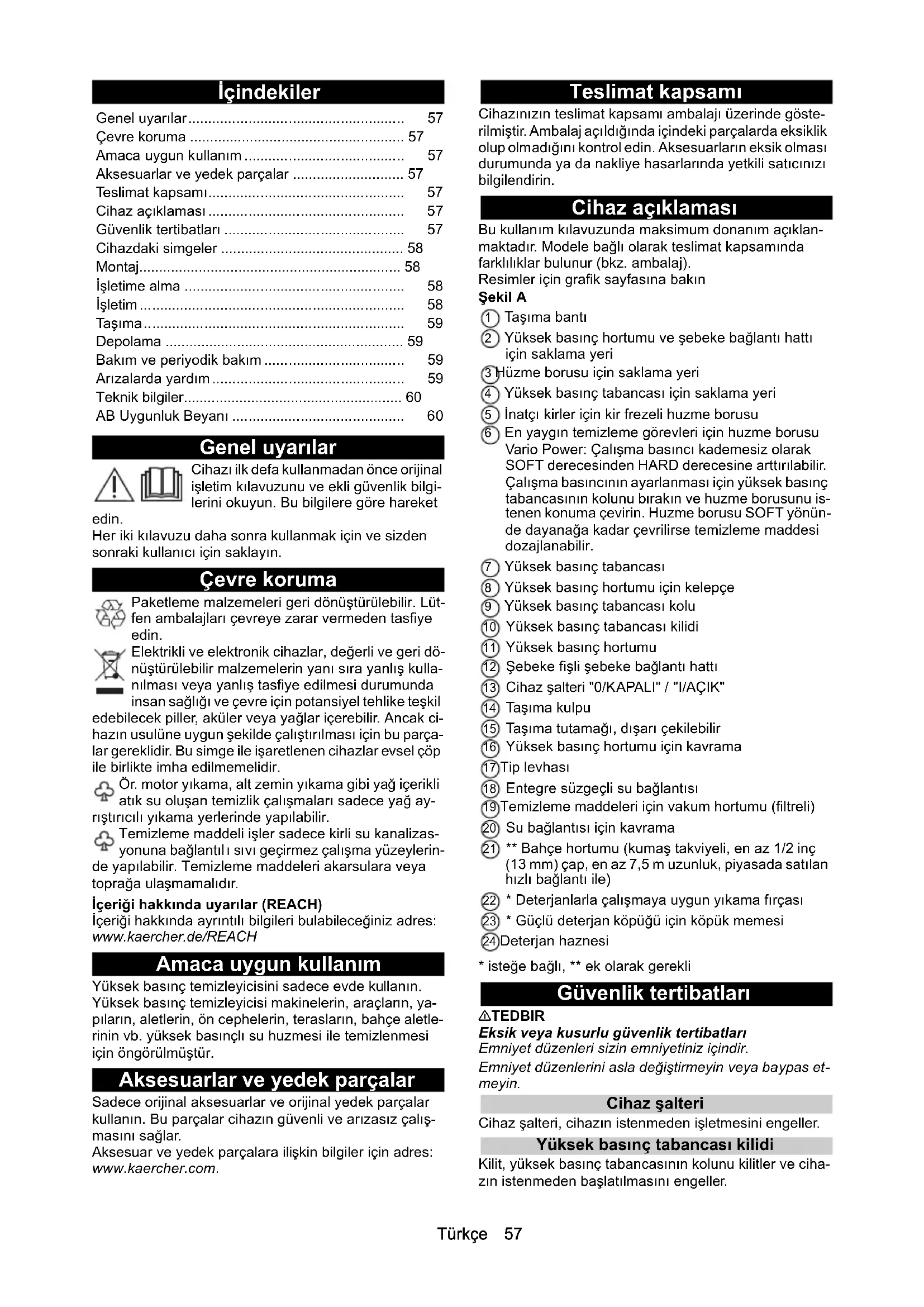 - isteğe bağlı, ** ek olarak gerekli Güvenlik tertibatları 몇 TEDBIR Eksik veya kusurlu güvenlik tertibatları Emniyet düzenleri sizin emniyetiniz içindir. Emniyet düzenlerini asla değiştirmeyin veya baypas et- meyin. Cihaz şalteri Cihaz şalteri, cihazın istenmeden işletmesini engeller. Yüksek basınç tabancası kilidi Kilit, yüksek basınç tabancasının kolunu kilitler ve ciha- zın istenmeden başlatılmasını engeller. Genel uyarılar...................................................... 57 Çevre koruma ...................................................... 57 Amaca uygun kullanım ........................................ 57 Aksesuarlar ve yedek parçalar ............................ 57 Teslimat kapsamı................................................. 57 Cihaz açıklaması ................................................. 57 Güvenlik tertibatları ............................................. 57 Cihazdaki simgeler .............................................. 58 Montaj.................................................................. 58 İşletime alma ....................................................... 58 İşletim .................................................................. 58 Taşıma................................................................. 59 Depolama ............................................................ 59 Bakım ve periyodik bakım ................................... 59 Arızalarda yardım ................................................ 59 Teknik bilgiler....................................................... 60 AB Uygunluk Beyanı ........................................... 6058 Türkçe Otomatik durma fonksiyonu Yüksek basınç tabancasının kolu bırakılırsa bir basınç şalteri pompayı kapatır, yüksek basınç huzmesi durdu- rulur. Kola basıldığında pompa tekrar açılır. Cihazdaki simgeler Montaj Resimler için grafik sayfasına bakın. İşletime alma öncesinde ayrı olarak birlikte verilen par- çaları cihaza monte edin. Tekerleklerin montajı