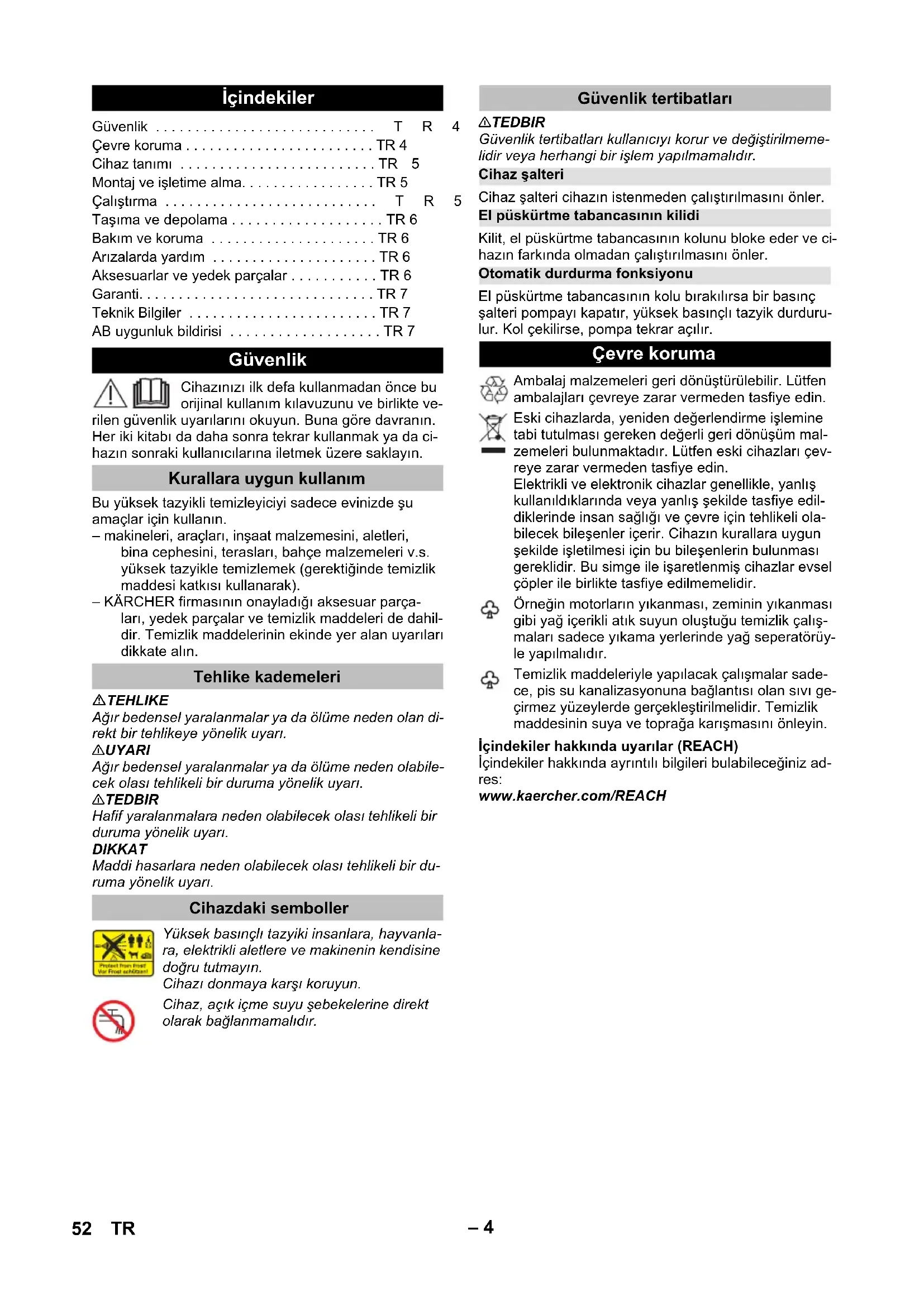 93 dB(A) Με την επιφύλαξη τεχνικών αλλαγών. Δήλωση Συμμόρφωσης των ΕE Προϊόν: Σύστημα καθαρισμού υψηλής πίεσης Τύπος: 1.673-xxx Σχετικές οδηγίες των ΕE 2011/65/EE 2000/14/EΚ 2006/42/EK (+2009/127/EK) 2014/30/EE Εφαρμοσθέντα εναρμονισμένα πρότυπα EN 60335–1 EN 60335–2–79 EN 62233: 2008 EN 55014–1:2017 EN 55014–2: 2015 EN 61000–3–2: 2014 EN 61000–3–3: 2013 EN IEC 63000: 2018 Εφαρμοσθείσα διαδικασία συμμόρφωσης 2000/14/EΚ: Παράρτημα V στάθμη ηχητικής πίεσης dB(A) Μετρημένη: 90 Εγγυημένη: 93 Chairman of the Board of Management Director Regulatory Affairs & Certification 51EL– 4 Cihazınızı ilk defa kullanmadan önce bu orijinal kullanım kılavuzunu ve birlikte ve- rilen güvenlik uyarılarını okuyun. Buna göre davranın. Her iki kitabı da daha sonra tekrar kullanmak ya da ci- hazın sonraki kullanıcılarına iletmek üzere saklayın. Bu yüksek tazyikli temizleyiciyi sadece evinizde şu amaçlar için kullanın. – makineleri, araçları, inşaat malzemesini, aletleri, bina cephesini, terasları, bahçe malzemeleri v.s. yüksek tazyikle temizlemek (gerektiğinde temizlik maddesi katkısı kullanarak). – KÄRCHER firmasının onayladığı aksesuar parça- ları, yedek parçalar ve temizlik maddeleri de dahil- dir. Temizlik maddelerinin ekinde yer alan uyarıları dikkate alın. TEHLIKE Ağır bedensel yaralanmalar ya da ölüme neden olan di- rekt bir tehlikeye yönelik uyarı. 몇 UYARI Ağır bedensel yaralanmalar ya da ölüme neden olabile- cek olası tehlikeli bir duruma yönelik uyarı. 몇 TEDBIR Hafif yaralanmalara neden olabilecek olası tehlikeli bir duruma yönelik uyarı. DIKKAT Maddi hasarlara neden olabilecek olası tehlikeli bir du- ruma yönelik uyarı. 몇 TEDBIR Güvenlik tertibatları kullanıcıyı korur ve değiştirilmeme- lidir veya herhangi bir işlem yapılmamalıdır. Cihaz şalteri cihazın istenmeden çalıştırılmasını önler. Kilit, el püskürtme tabancasının kolunu bloke eder ve ci- hazın farkında olmadan çalıştırılmasını önler. El püskürtme tabancasının kolu bırakılırsa bir basınç şalteri pompayı kapatır, yüksek basınçlı tazyik durduru- lur. Kol çekilirse, pompa tekrar açılır. İçindekiler hakkında uyarılar (REACH) İçindekiler hakkında ayrıntılı bilgileri bulabileceğiniz ad- res: www.kaercher.com/REACH İçindekiler Güvenlik . . . . . . . . . . . . . . . . . . . . . . . . . . . .TR4 Çevre koruma . . . . . . . . . . . . . . . . . . . . . . . . TR 4 Cihaz tanımı . . . . . . . . . . . . . . . . . . . . . . . . . TR5 Montaj ve işletime alma. . . . . . . . . . . . . . . . . TR 5 Çalıştırma . . . . . . . . . . . . . . . . . . . . . . . . . . .TR5 Taşıma ve depolama . . . . . . . . . . . . . . . . . . . TR 6 Bakım ve koruma . . . . . . . . . . . . . . . . . . . . . TR 6 Arızalarda yardım . . . . . . . . . . . . . . . . . . . . . TR 6 Aksesuarlar ve yedek parçalar . . . . . . . . . . . TR 6 Garanti. . . . . . . . . . . . . . . . . . . . . . . . . . . . . . TR 7 Teknik Bilgiler . . . . . . . . . . . . . . . . . . . . . . . . TR 7 AB uygunluk bildirisi . . . . . . . . . . . . . . . . . . . TR 7 Güvenlik Kurallara uygun kullanım Tehlike kademeleri Cihazdaki semboller Yüksek basınçlı tazyiki insanlara, hayvanla- ra, elektrikli aletlere ve makinenin kendisine doğru tutmayın. Cihazı donmaya karşı koruyun. Cihaz, açık içme suyu şebekelerine direkt olarak bağlanmamalıdır. Güvenlik tertibatları Cihaz şalteri El püskürtme tabancasının kilidi Otomatik durdurma fonksiyonu Çevre koruma Ambalaj malzemeleri geri dönüştürülebilir. Lütfen ambalajları çevreye zarar vermeden tasfiye edin. Eski cihazlarda, yeniden değerlendirme işlemine tabi tutulması gereken değerli geri dönüşüm mal- zemeleri bulunmaktadır. Lütfen eski cihazları çev- reye zarar vermeden tasfiye edin. Elektrikli ve elektronik cihazlar genellikle, yanlış kullanıldıklarında veya yanlış şekilde tasfiye edil- diklerinde insan sağlığı ve çevre için tehlikeli ola- bilecek bileşenler içerir. Cihazın kurallara uygun şekilde işletilmesi için bu bileşenlerin bulunması gereklidir. Bu simge ile işaretlenmiş cihazlar evsel çöpler ile birlikte tasfiye edilmemelidir. Örneğin motorların yıkanması, zeminin yıkanması gibi yağ içerikli atık suyun oluştuğu temizlik çalış- maları sadece yıkama yerlerinde yağ seperatörüy- le yapılmalıdır. Temizlik maddeleriyle yapılacak çalışmalar sade- ce, pis su kanalizasyonuna bağlantısı olan sıvı ge- çirmez yüzeylerde gerçekleştirilmelidir. Temizlik maddesinin suya ve toprağa karışmasını önleyin. 52 TR– 5 Cihazınızın teslimat kapsamı (modele bağlı olarak) am- balajı üzerinde gösterilmiştir. Bu kullanım kılavuzu mümkün olan tüm seçenekleri açıklamaktadır. Şekiller için grafik sayfalarına bakın 1 Yüksek basınç bağlantısı 2 Cihaz şalteri „0/OFF“ / „I/ON“ 3 Yüksek basınç hortumunun saklama parçası 4 Taşıma kolu 5 Püskürtme borusunun saklama parçası 6 Entegre süzgeçli su bağlantısı 7 Su bağlantısının bağlantı parçası 8 Elektrik fişiyle birlikte şebeke bağlantı kablosu 9 Tip levhası 10 Yüksek basınç tabancası 11 El püskürtme tabancasının kilidi 12 Yüksek basınç hortumu 13 Yüksek basınç hortumunun mandalı 14 1 kademeli memeli püskürtme borusu Normal temizlik görevleri için. 15 Kir frezeli püskürtme borusu İnatçı kirler için Şekiller için grafik sayfalarına bakın Şekil Cihazla birlikte gelen gevşek parçaları işletime al- madan önce yerine takın. Cihazı düz bir yüzeye koyun. Şekil Mandalı yüksek basınç tabancasından dışarı çekin ve yüksek basınç hortumunu el püskürtme tab
