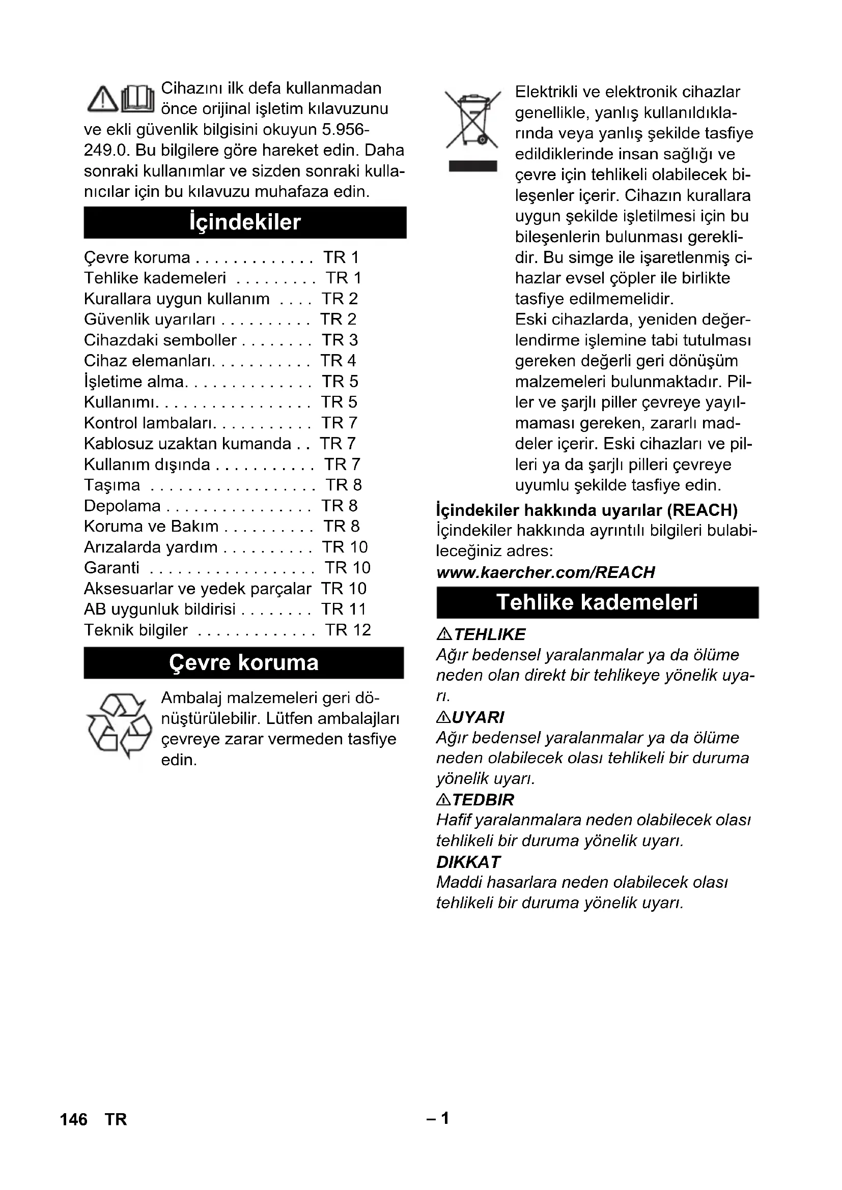 145EL– 1 Cihazını ilk defa kullanmadan önce orijinal işletim kılavuzunu ve ekli güvenlik bilgisini okuyun 5.956- 249.0. Bu bilgilere göre hareket edin. Daha sonraki kullanımlar ve sizden sonraki kulla- nıcılar için bu kılavuzu muhafaza edin. İçindekiler hakkında uyarılar (REACH) İçindekiler hakkında ayrıntılı bilgileri bulabi- leceğiniz adres: www.kaercher.com/REACH TEHLIKE Ağır bedensel yaralanmalar ya da ölüme neden olan direkt bir tehlikeye yönelik uya- rı. 몇 UYARI Ağır bedensel yaralanmalar ya da ölüme neden olabilecek olası tehlikeli bir duruma yönelik uyarı. 몇 TEDBIR Hafif yaralanmalara neden olabilecek olası tehlikeli bir duruma yönelik uyarı. DIKKAT Maddi hasarlara neden olabilecek olası tehlikeli bir duruma yönelik uyarı. İçindekiler Çevre koruma . . . . . . . . . . . . . TR 1 Tehlike kademeleri . . . . . . . . . TR 1 Kurallara uygun kullanım . . . . TR 2 Güvenlik uyarıları . . . . . . . . . . TR 2 Cihazdaki semboller . . . . . . . . TR 3 Cihaz elemanları. . . . . . . . . . . TR 4 İşletime alma. . . . . . . . . . . . . . TR 5 Kullanımı. . . . . . . . . . . . . . . . . TR 5 Kontrol lambaları. . . . . . . . . . . TR 7 Kablosuz uzaktan kumanda . . TR 7 Kullanım dışında . . . . . . . . . . . TR 7 Taşıma . . . . . . . . . . . . . . . . . . TR 8 Depolama . . . . . . . . . . . . . . . . TR 8 Koruma ve Bakım . . . . . . . . . . TR 8 Arızalarda yardım . . . . . . . . . . TR 10 Garanti . . . . . . . . . . . . . . . . . . TR 10 Aksesuarlar ve yedek parçalar TR 10 AB uygunluk bildirisi . . . . . . . . TR 11 Teknik bilgiler . . . . . . . . . . . . . TR 12 Çevre koruma Ambalaj malzemeleri geri dö- nüştürülebilir. Lütfen ambalajları çevreye zarar vermeden tasfiye edin. Elektrikli ve elektronik cihazlar genellikle, yanlış kullanıldıkla- rında veya yanlış şekilde tasfiye edildiklerinde insan sağlığı ve çevre için tehlikeli olabilecek bi- leşenler içerir. Cihazın kurallara uygun şekilde işletilmesi için bu bileşenlerin bulunması gerekli- dir. Bu simge ile işaretlenmiş ci- hazlar evsel çöpler ile birlikte tasfiye edilmemelidir. Eski cihazlarda, yeniden değer- lendirme işlemine tabi tutulması gereken değerli geri dönüşüm malzemeleri bulunmaktadır. Pil- ler ve şarjlı piller çevreye yayıl- maması gereken, zararlı mad- deler içerir. Eski cihazları ve pil- leri ya da şarjlı pilleri çevreye uyumlu şekilde tasfiye edin. Tehlike kademeleri 146 TR– 2 – Bu vakum; zemin ve duvar yüzeylerinin ıslak ve kuru temizlemesi için uygundur. – Bu cihaz, makinelerden yanıcı olma- yan, kuru tozları emmek için uygundur. – Bu cihaz nemli veya sıvı maddeleri em- mek için uygundur. – Bu cihaz, sadece kuru, yanmayan ve sağlığa zararlı tozların (TEN 60 335-2- 69'a göre toz sınıfı M) emilmesi için uy- gundur. Sınırlama: Kanserojen madde- ler, ağaç tozu hariç, bu cihazla süpürül- memelidir. – Bu cihaz sanayi amaçlı kullanım için uy- gundur. – Teslimat kapsamında hiçbir aksesuar bulunmamaktadır. Aksesuarlar, uygula- maya göre ayrı olarak sipariş edilmeli- dir. – Cihazın sorunsuz fonksiyonu sadece DN42, DN52 ve DN 72 vakum hortumu nominal genişlikleriyle sağlanır. IV 100/40 M sadece DN 42 ve DN 52 aksesuarlarıyla birlikte kullanılabilir. – Diğer her türlü kullanımi kurallara uygun olmayan kullanım olarak görülmelidir. İlk kullanımdan önce, sulu/kuru süpürgeler için birlikte verilen güvenlik uyarılarını mut- laka okuyun! TEHLIKE – Eğer artık hava odaya geri iletiliyorsa odada yeterli düzeyde bir hava değiştir- me oranı L mevcut olmalıdır. Sınır de- ğerlerine uyabilmek için; geri verilen hava akımı azami, temiz hava akımının % 50 ‘si olması (oda hacmi V