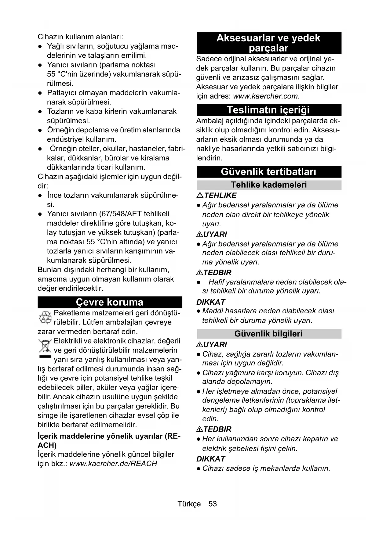 EN 61000-3-3: 2013 + A1: 2019 EN 61000-3-11: 2000 EN 62233: 2008 EN IEC 63000: 2018 De ondergetekenden handelen in opdracht en met volmacht van de directie. Gevolmachtigde voor de documentatie: A. Haag Kärcher Industrial Vacuuming GmbH Robert-Bosch-Straße 4-8 73550 Waldstetten (Germany) Tel.: +49 7171 94888-0 Fax: +49 7171 94888-528 Waldstetten, 2024/04/01 İçindekiler Genel uyarılar Cihazı ilk defa kullanmadan önce orijinal işletim kılavuzunu ve ekli güvenlik bilgilerini okuyun. Bu bilgi- lere göre hareket edin. Her iki kılavuzu daha sonra kullanmak için ve sizden sonraki kullanıcı için saklayın. Amacına uygun kullanım 몇 UYARI Sağlığa zararlı tozların solunması Sağlığa zararlı Cihazı sağlığa zararlı tozların vakumlan- ması için kesinlikle kullanmayın. DIKKAT Havadaki yüksek nem sebebiyle kısa devre Cihazın hasar görmesi Cihazı sadece iç mekanlarda kullanın. Elektriciteitskabel Netkabel H07BQ-F mm