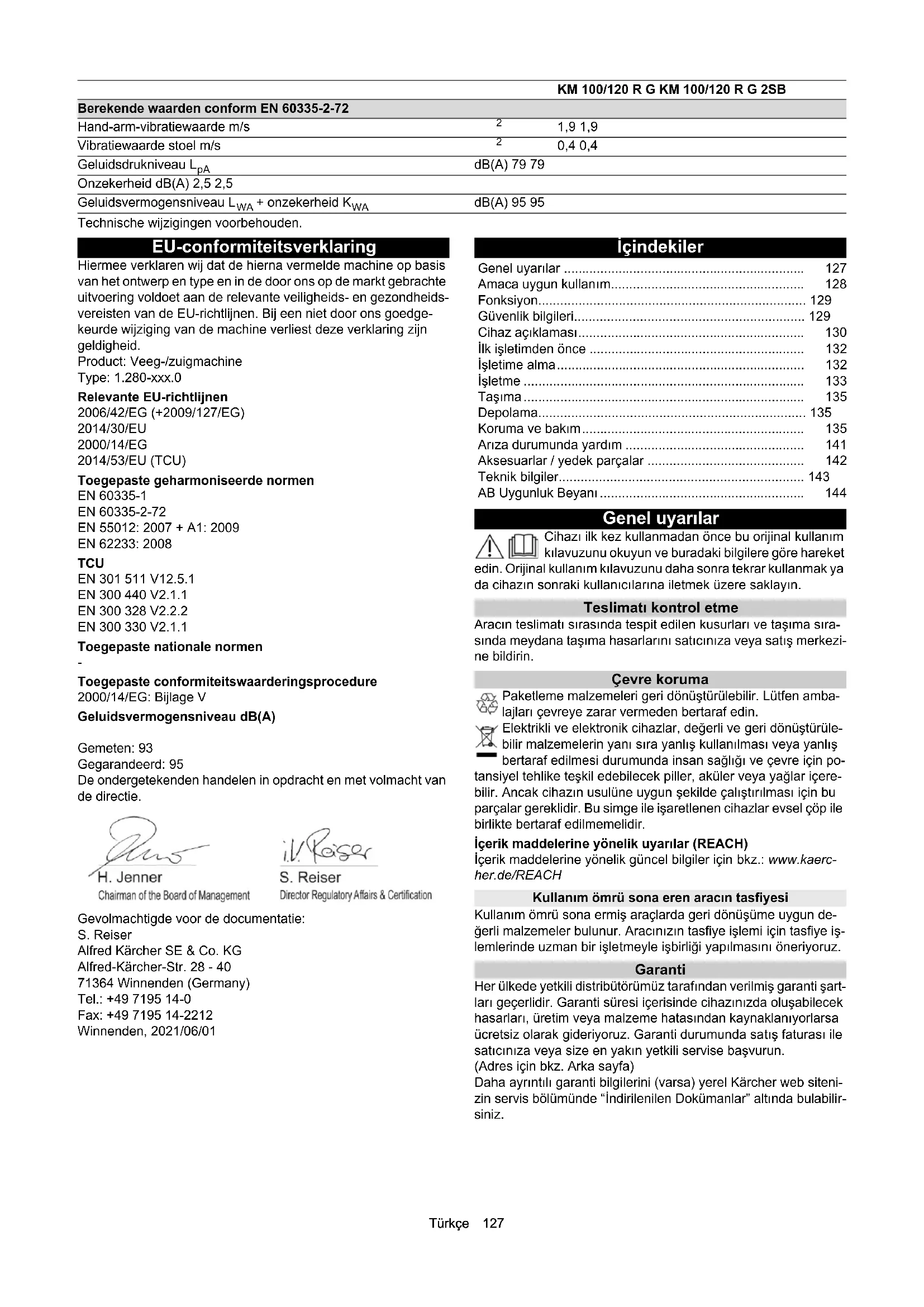 Toegepaste conformiteitswaarderingsprocedure 2000/14/EG: Bijlage V Geluidsvermogensniveau dB(A) Gemeten: 93 Gegarandeerd: 95 De ondergetekenden handelen in opdracht en met volmacht van de directie. Gevolmachtigde voor de documentatie: S. Reiser Alfred Kärcher SE & Co. KG Alfred-Kärcher-Str. 28 - 40 71364 Winnenden (Germany) Tel.: +49 7195 14-0 Fax: +49 7195 14-2212 Winnenden, 2021/06/01 İçindekiler Genel uyarılar Cihazı ilk kez kullanmadan önce bu orijinal kullanım kılavuzunu okuyun ve buradaki bilgilere göre hareket edin. Orijinal kullanım kılavuzunu daha sonra tekrar kullanmak ya da cihazın sonraki kullanı cılarına iletmek üzere saklayın. Teslimatı kontrol etme Aracın teslimatı sırasında tespit edilen kusurları ve taşıma sıra- sında meydana taşıma hasarlarını satıcınıza veya satış merkezi- ne bildirin. Çevre koruma Paketleme malzemeleri geri dönüştürülebilir. Lütfen amba- lajları çevreye zarar vermeden bertaraf edin. Elektrikli ve elektronik cihazlar, değerli ve geri dönüştürüle- bilir malzemelerin yanı sıra yanlış kullanılması veya yanlış bertaraf edilmesi durumunda insan sağlığı ve çevre için po- tansiyel tehlike teşkil edebilecek piller, aküler veya yağlar içere- bilir. Ancak cihazın usulüne uygun şekilde çalıştırılması için bu parçalar gereklidir. Bu simge ile işaretlenen cihazlar evsel çöp ile birlikte bertaraf edilmemelidir. İçerik maddelerine yönelik uyarılar (REACH) İçerik maddelerine yönelik güncel bilgiler için bkz.: www.kaerc- her.de/REACH Kullanım ömrü sona eren aracın tasfiyesi Kullanım ömrü sona ermiş araçlarda geri dönüşüme uygun de- ğerli malzemeler bulunur. Aracınızın tasfiye işlemi için tasfiye iş- lemlerinde uzman bir işletmeyle işbirliği yapılmasını öneriyoruz. Garanti Her ülkede yetkili distribütörümüz tarafından verilmiş garanti şart- ları geçerlidir. Garanti süresi içerisinde cihazınızda oluşabilecek hasarları, üretim veya malzeme hatasından kaynaklanıyorlarsa ücretsiz olarak gideriyoruz. Garanti durumunda satış faturası ile satıcınıza veya size en yakın yetkili servise başvurun. (Adres için bkz. Arka sayfa) Daha ayrıntılı garanti bilgilerini (varsa) yerel Kärcher web siteni- zin servis bölümünde “İndirilenilen Dokümanlar” altında bulabilir- siniz. Berekende waarden conform EN 60335-2-72 Hand-arm-vibratiewaarde m/s