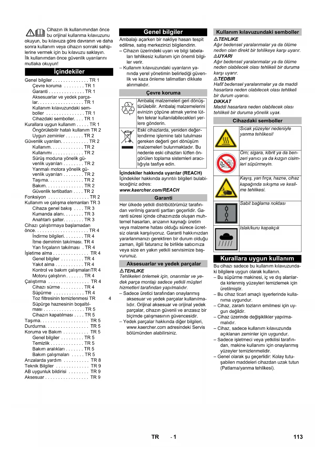 cihazı sadece bu kullanım kılavuzunda- ki bilgilere uygun olarak kullanın. – Bu süpürme makinesi, iç ve dış alanlar- da kirlenmiş yüzeyleri temizlemek için üretilmiştir. – Bu cihaz ticari amaçlı işyerlerinde kulla- nıma uygundur. – Cihaz, zararlı tozların emilmesi için uy- gun değildir. – Cihaz üzerinde değişiklikler yapılma- malıdır. – Cihaz, sadece kullanım kılavuzunda açıklanan zeminler için uygundur. – Sadece işletmeci veya yetkilisi tarafın- dan, makine kullanımı için onaylanmış yüzeyler temizlenmelidir. – Genel olarak şu geçerlidir: Kolay tutu- şabilen maddeleri cihazdan uzak tutun (Patlama/yanma tehlikesi). İçindekiler Genel bilgiler . . . . . . . . . . . . . . TR 1 Çevre koruma . . . . . . . . TR 1 Garanti . . . . . . . . . . . . . . TR 1 Aksesuarlar ve yedek parça- lar. . . . . . . . . . . . . . . . . . TR 1 Kullanım kılavuzundaki sem- boller . . . . . . . . . . . . . . . TR 1 Cihazdaki semboller. . . . TR 1 Kurallara uygun kullanım . . . . . TR 1 Öngörülebilir hatalı kullanım TR 2 Uygun zeminler . . . . . . . TR 2 Güvenlik uyarıları. . . . . . . . . . . TR 2 Kullanım. . . . . . . . . . . . . TR 2 Kullanımı . . . . . . . . . . . . TR 2 Sürüş moduna yönelik gü- venlik uyarıları . . . . . . . . TR 2 Yanmalı motora yönelik gü- venlik uyarıları . . . . . . . . TR 2 Taşıma. . . . . . . . . . . . . . TR 2 Bakım. . . . . . . . . . . . . . . TR 2 Güvenlik tertibatları . . . . TR 2 Fonksiyon . . . . . . . . . . . . . . . . TR 2 Kullanım ve çalışma elemanları TR 3 Cihaza genel bakış . . . . TR 3 Kumanda alanı. . . . . . . . TR 3 Anahtarlı şalter. . . . . . . . TR 3 Cihazı çalıştırmaya başlamadan önce. . . . . . . . . . . . . . . . . . . . . TR 4 İndirme bilgileri. . . . . . . . TR 4 İtme demirinin takılması. TR 4 Yan fırçaların takılması . TR 4 İşletime alma . . . . . . . . . . . . . . TR 4 Genel bilgiler . . . . . . . . . TR 4 Yakıt alma . . . . . . . . . . . TR 4 Kontrol ve bakım çalışmalarıTR 4 Motoru çalıştırın . . . . . . . TR 4 Çalıştırma . . . . . . . . . . . . . . . . TR 4 Cihazı sürme . . . . . . . . . TR 4 Süpürme . . . . . . . . . . . . TR 4 Toz filtresinin temizlenmesi TR 4 Süpürge haznesinin boşaltıl- ması . . . . . . . . . . . . . . . . TR 5 Cihazın kapatılması . . . . TR 5 Taşıma. . . . . . . . . . . . . . . . . . . TR 5 Durdurma. . . . . . . . . . . . . . . . . TR 5 Koruma ve Bakım . . . . . . . . . . TR 5 Genel bilgiler . . . . . . . . . TR 5 Temizlik . . . . . . . . . . . . . TR 5 Bakım aralıkları . . . . . . . TR 5 Bakım çalışmaları . . . . . TR 5 Arızalarda yardım . . . . . . . . . . TR 8 Teknik Bilgiler . . . . . . . . . . . . . TR 9 AB uygunluk bildirisi . . . . . . . . TR 9 Aksesuar . . . . . . . . . . . . . . . . . TR 9 Genel bilgiler Çevre koruma Ambalaj malzemeleri geri dönüş- türülebilir. Ambalaj malzemelerini evinizin çöpüne atmak yerine lüt- fen tekrar kullanılabilecekleri yer- lere gönderin. Eski cihazlarda, yeniden değer- lendirme işlemine tabi tutulması gereken değerli geri dönüşüm malzemeleri bulunmaktadır. Bu nedenle eski cihazları lütfen ön- görülen toplama sistemleri aracı- lığıyla tasfiye edin. Garanti Aksesuarlar ve yedek parçalar Kullanım kılavuzundaki semboller Cihazdaki semboller Sıcak yüzeyler nedeniyle yanma tehlikesi! Örn; sigara, kibrit ya da ben- zeri yanıcı ya da kızgın cisim- leri süpürmeyin. Kayış, yan fırça, hazne, cihaz kapağında sıkışma ve kesil- me tehlikesi. Sabit bağlama noktası Islak/kuru kapakçık Kurallara uygun kullanım 113TR- 2– Asla patlayıcı sıvılar, yanıcı gazlar ve de inceltilmiş asit ve çözücü süpürmeyi-niz/madde temizlemeyiniz! Buna, emi-len havayal girdaba tutulduğu zaman patlayıcı buharlar oluşturabilen benzin, tiner veya motorin de dahil edilir, ayrıca aseton, inceltilmiş asit ve çözücü mad-de de sayılabilir, çünkü bunlar cihazda kullanılmakta olan malzemelere bula-şabilir.– Reaktif metal tozlarını (örn. alüminyum, magnezyum, çinko), kesinlikle süpür-meyin/emdirmeyin, bu tozlar güçlü al-kali ya da asitli temizlik maddeleri ile bağlantılı olarak patlayıcı gazlar oluştu- rur. – Yanan veya kor halindeki maddeleri sü-pürmeyiniz/temizlemeyiniz.– Tehlike bölgesinde bulunmak yasaktır. Patlama tehlikesi olan odalarda cihazın çalıştırılması yasaktır.– Asfalt– Sanayi zeminleri– Çimentolu döşeme– Beton– Kaldırım taşları – Cihaz, çalışma düzenekleriyle birlikte kullanılmadan önce düzgün durum ve çalışma güvenliği kontrollerinden geçi- rilmelidir. Eğer hasar veya eksik var ise kullanılmamalıdır. – Tehlikeli alanlarda (örneğin benzin is- tasyonu) cihazın kullanılması durumun- da gerekli emniyet tedbirlerinin dikkate alınması gerekir. Patlama tehlikesi olan odalarda cihazın çalı ştırılması yasaktır. – Cihaz çocuklar veya eğitimsiz kişiler ta- rafından kullanılmamalıdır. – Cihaz, gözetim altında tutulmaları veya cihazın güvenli kullanılması konusunda eğitilmiş olmaları ve kullanımdan kay- naklanan tehlikeleri anlamaları duru-munda fiziksel, duyusal veya düşünsel yetenekleri az olan veya yeterli deneyi-me ve bilgiye sahip olmayan kişiler tara- fından kullanılabilir. – Kullanıcı personel cihazı talimatlara uy- gun olarak kullanmalıdır. Personel, ye- rel kuralları dikkate almalı ve çalışma sırasında özellikle çocuklar olmak üze- re 3. şahıslara dikkat etmelidir. – Çalışmaya başlamadan önce, kullanım personeli tüm koruma tertibatlarının düzgün şekilde takılmış olduğundan ve çalıştığından emin olmalıdır. – Cihazın kullanım p ersoneli, diğer insan- larla veya mallarıyla oluşan kazalardan sorumludur. – Kullanım personelinin sıkı oturan giysi- ler giymesine dikkat edin. Sağlam ayak- kabılar giyin ve gevşek giysilerden kaçı- n