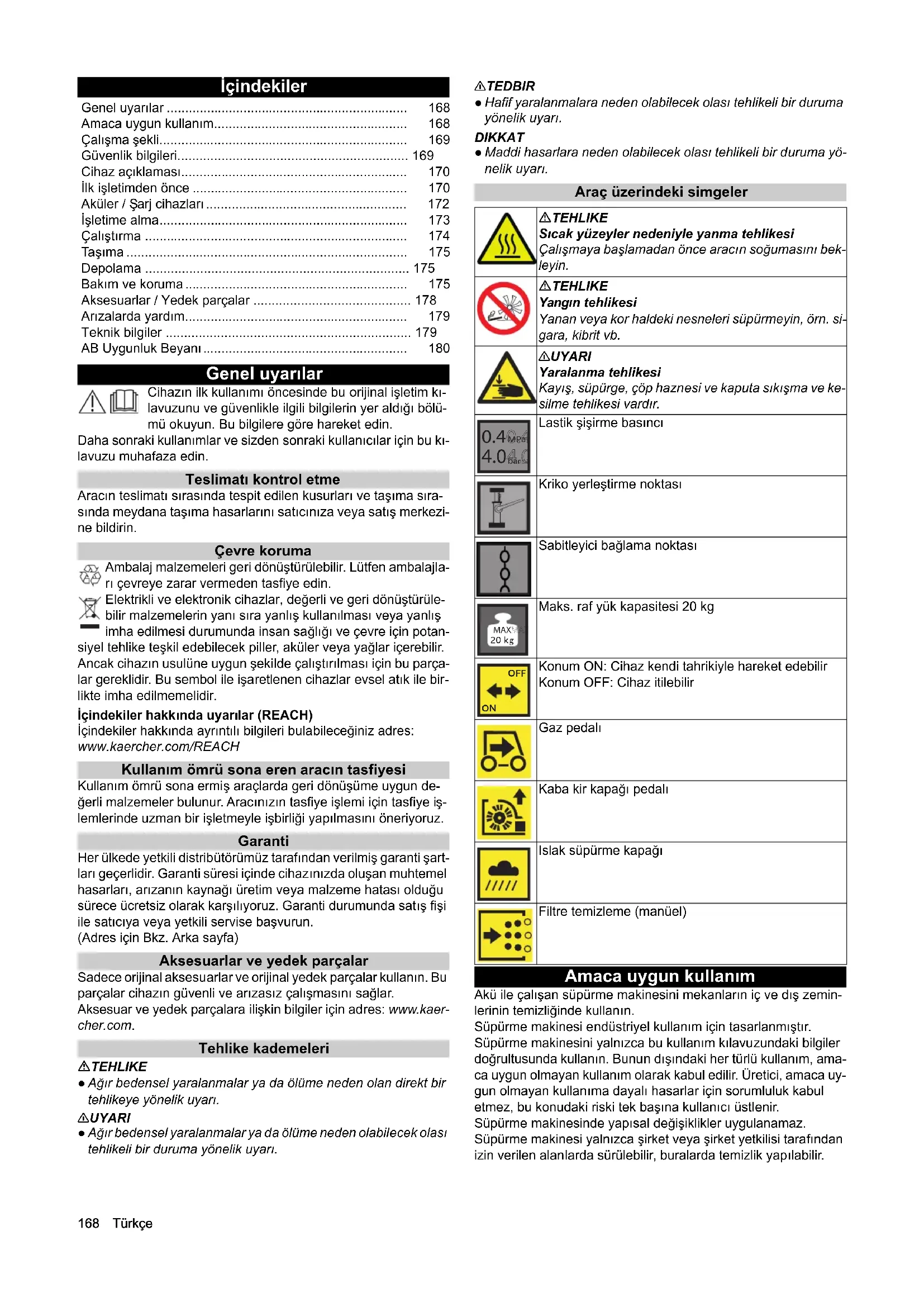 - MHz Ισχύς εκπομπής Watt GSM 824,2-848.8 1510 1850,2-1909.8 870 WLAN 2400-2483 96 Chairman of the Board of Management Director Regulatory Affairs & Certification H. Jenner S. Reiser168 Türkçe İçindekiler Genel uyarılar Cihazın ilk kullanımı öncesinde bu orijinal işletim kı- lavuzunu ve güvenlikle ilgili bilgilerin yer aldığı bölü- mü okuyun. Bu bilgilere göre hareket edin. Daha sonraki kullanımlar ve sizden sonraki kullanıcılar için bu kı- lavuzu muhafaza edin. Teslimatı kontrol etme Aracın teslimatı sırasında tespit edilen kusurları ve taşıma sıra- sında meydana taşıma hasarlarını satıcınıza veya satış merkezi- ne bildirin. Çevre koruma Ambalaj malzemeleri geri dönüştürülebilir. Lütfen ambalajla- rı çevreye zarar vermeden tasfiye edin. Elektrikli ve elektronik cihazlar, değerli ve geri dönüştürüle- bilir malzemelerin yanı sıra yanlış kullanılması veya yanlış imha edilmesi durumunda insan sağlığı ve çevre için potan- siyel tehlike teşkil edebilecek piller, aküler veya yağlar içerebilir. Ancak cihazın usulüne uygun şekilde çalıştırılması için bu parça- lar gereklidir. Bu sembol ile işaretlenen cihazlar evsel atık ile bir- likte imha edilmemelidir. İçindekiler hakkında uyarılar (REACH) İçindekiler hakkında ayrıntılı bilgileri bulabileceğiniz adres: www.kaercher.com/REACH Kullanım ömrü sona eren aracın tasfiyesi Kullanım ömrü sona ermiş araçlarda geri dönüşüme uygun de- ğerli malzemeler bulunur. Aracınızın tasfiye işlemi için tasfiye iş- lemlerinde uzman bir işletmeyle işbirliği yapılmasını öneriyoruz. Garanti Her ülkede yetkili distribütörümüz tarafından verilmiş garanti şart- ları geçerlidir. Garanti süresi içinde cihazınızda oluşan muhtemel hasarları, arızanın kaynağı üretim veya malzeme hatası olduğu sürece ücretsiz olarak karşılıyoruz. Garanti durumunda satış fişi ile satıcıya veya yetkili servise başvurun. (Adres için Bkz. Arka sayfa) Aksesuarlar ve yedek parçalar Sadece orijinal aksesuarlar ve orijinal yedek parçalar kullanın. Bu parçalar cihazın güvenli ve arızasız çalışmasını sağlar. Aksesuar ve yedek parçalara ilişkin bilgiler için adres: www.kaer- cher.com. Tehlike kademeleri TEHLIKE ● Ağır bedensel yaralanmalar ya da ölüme neden olan direkt bir tehlikeye yönelik uyarı. 몇 UYARI ● Ağır bedensel yaralanmalar ya da ölüme neden olabilecek olası tehlikeli bir duruma yönelik uyarı. 몇 TEDBIR ● Hafif yaralanmalara neden olabilecek olası tehlikeli bir duruma yönelik uyarı. DIKKAT ● Maddi hasarlara neden olabilecek olası tehlikeli bir duruma yö- nelik uyarı. Araç üzerindeki simgeler Amaca uygun kullanım Akü ile çalışan süpürme makinesini mekanların iç ve dış zemin- lerinin temizliğinde kullanın. Süpürme makinesi endüstriyel kullanım için tasarlanmıştır. Süpürme makinesini yalnızca bu kullanım kılavuzundaki bilgiler doğrultusunda kullanın. Bunun dışındaki her türlü kullanım, ama- ca uygun olmayan kullanım olarak kabul edilir. Üretici, amaca uy- gun olmayan kullanıma dayalı hasarlar için sorumluluk kabul etmez, bu konudaki riski tek başına kullanıcı üstlenir. Süpürme makinesinde yapısal değişiklikler uygulanamaz. Süpürme makinesi yalnızca şirket veya şirket yetkilisi tarafından izin verilen alanlarda sürülebilir, buralarda temizlik yapılabilir. Genel uyarılar p. 168