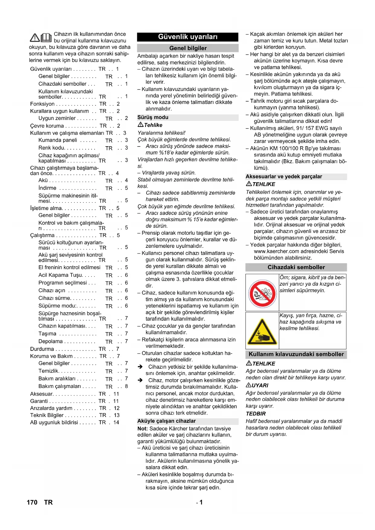 2000/14/EΚ: Παράρτημα V στάθμη ηχητικής πίεσης dB(A) Μετρημένη: 92 Εγγυημένη: 94 Chairman of the Board of Management Director Regulatory Affairs & Certification 169EL- 1 Cihazın ilk kullanımından önce bu orijinal kullanma kılavuzunu okuyun, bu kılavuza göre davranın ve daha sonra kullanım veya cihazın sonraki sahip- lerine vermek için bu kılavuzu saklayın. Ambalajı açarken bir nakliye hasarı tespit edilirse, satış merkezinizi bilgilendirin. – Cihazın üzerindeki uyarı ve bilgi tabela- ları tehlikesiz kullanım için önemli bilgi- ler verir. – Kullanım kılavuzundaki uyarıların ya- nında yerel yönetimin belirlediği güven- lik ve kaza önleme talimatları dikkate alınmalıdır. Tehlike Yaralanma tehlikesi! Çok büyük eğimlerde devrilme tehlikesi. – Aracı sürüş yönünde sadece maksi- mum %18’e kadar eğimlerde sürün. Virajlardan hızlı geçerken devrilme tehlike- si. – Virajlarda yavaş sürün. Stabil olmayan zeminlerde devrilme tehli- kesi. – Cihazı sadece sabitlenmiş zeminlerde hareket ettirin. Çok büyük yan eğimde devrilme tehlikesi. – Aracı sadece sürüş yönünün enine doğru maksimum % 15’e kadar eğimler- de sürün. – Prensip olarak motorlu taşıtlar için ge- çerli koruyucu önlemler, kurallar ve dü- zenlemelere uyulmalıdır. – Kullanıcı personel cihazı talimatlara uy- gun olarak kullanmalıdır. Sürüş şeklin- de yerel kuralları dikkate almalı ve çalışma esnasında özerllikle çocuklar olmak üzere 3. şahıslara dikkat etmeli- dir. – Cihaz, sadece kullanım konusunda eği- tim almış ya da kullanım konusundaki yeteneklerini ispatlamış ve kullanım için açık bir şekilde görevlendirilmiş kişiler tarafından kullanılmalıdır. – Cihaz çocuklar ya da gençler tarafından kullanılmamalıdır. – Refakatçi kişilerin araca alınmasına izin verilmemektedir. – Oturulan cihazlar sadece koltuktan ha- rekete geçirilmelidir. Cihazın yetkisiz bir şekilde kullanılma- sını önlemek için, anahtar çekilmelidir. Cihaz, motor çalışırken kesinlikle göze- timsiz durumda bırakılmamalıdır. Kulla- nıcı personel, ancak motor durduktan, cihaz denetimsiz hareketlere karşı em- niyete alındıktan ve anahtar çekildikten sonra cihazı terk etmelidir. Not: Sadece Kärcher tarafından tavsiye edilen aküler ve şarj cihazlarını kullanın, garanti yükümlülüğü bulunmaktadır. – Akü üreticisi ve şarj cihazı üreticisinin kullanma talimatlarına mutlaka uyulma- lıdır. Akülerin kullanılmasına yönelik ya- salara dikkat edin. – Aküleri kesinlikle boşalmış durumda bı- rakmayın, aksine mümkün olduğunca kısa süre içinde tekrar şarj edin. – Kaçak akımları önlemek için aküleri her zaman temiz ve kuru tutun. Metal tozları gibi kirlerden koruyun. – Her hangi bir alet ya da benzeri cisimleri akünün üzerine koymayın. Kısa devre ve patlama tehlikesi. – Kesinlikle akünün yakınında ya da akü şarj bölümünde açık ateşle çalışmayın, kıvılcım oluşturmayın ya da sigara iç- meyin. Patlama tehlikesi. – Tahrik motoru giri sıcak parçalara do- kunmayın (yanma tehlikesi). – Akü asidiyle çalışırken dikkatli olun. İlgili güvenlik talimatlarına dikkat edin! – Kullanılmış aküleri, 91/ 157 EWG sayılı AB yönetmeliğine uygun olarak çevreye zarar vermeyecek şekilde imha edin. – Akünün KM 100/100 R Bp'ye takılması sırasında akü kutup emniyeti mutlaka takılmalıdır (Bkz. Bakım çalışmaları bö- lümü). TEHLIKE Tehlikeleri önlemek için, onarımlar ve ye- dek parça montajı sadece yetkili müşteri hizmetleri tarafından yapılmalıdır. – Sadece üretici tarafından onaylanmış aksesuar ve yedek parçalar kullanılma- lıdır. Orijinal aksesuar ve orijinal yedek parçalar, cihazın güvenli ve arızasız bir biçimde çalışmasının güvencesidir. – Yedek parçalar hakkında diğer bilgileri, www.kaercher.com adresindeki Servis bölümünden alabilirsiniz. TEHLIKE Ağır bedensel yaralanmalar ya da ölüme neden olan direkt bir tehlikeye karşı uyarır. 몇 UYARI Ağır bedensel yaralanmalar ya da ölüme neden olabilecek olası tehlikeli bir duruma karşı uyarır. TEDBIR Hafif bedensel yaralanmalar ya da maddi hasarlara neden olabilecek olası tehlikeli bir durum uyarısı. Güvenlik uyarıları . . . . . . . . TR . . 1 Genel bilgiler . . . . . . . . .