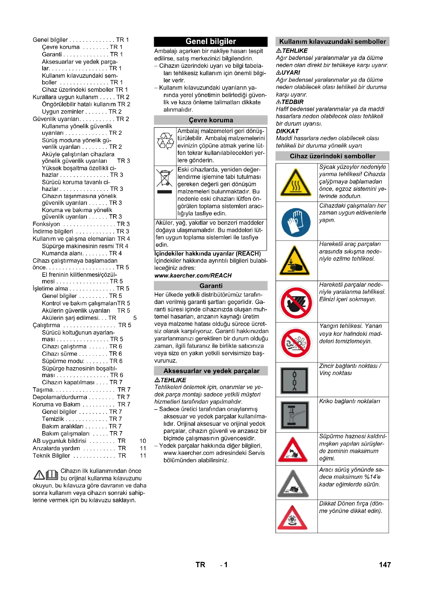 Genel bilgiler . . . . . . . . . . . . . . TR 1 Çevre koruma . . . . . . . . TR 1 Garanti . . . . . . . . . . . . . . TR 1 Aksesuarlar ve yedek parça- lar. . . . . . . . . . . . . . . . . . TR 1 Kullanım kılavuzundaki sem- boller . . . . . . . . . . . . . . . TR 1 Cihaz üzerindeki semboller TR 1 Kurallara uygun kullanım . . . . . TR 2 Öngörülebilir hatalı kullanım TR 2 Uygun zeminler . . . . . . . TR 2 Güvenlik uyarıları. . . . . . . . . . . TR 2 Kullanıma yönelik güvenlik uyarıları . . . . . . . . . . . . . TR 2 Sürüş moduna yönelik gü- venlik uyarıları . . . . . . . . TR 2 Aküyle çalıştırılan cihazlara yönelik güvenlik uyarıları TR 3 Yüksek boşaltma özellikli ci- hazlar . . . . . . . . . . . . . . . TR 3 Sürücü koruma tavanlı ci- hazlar . . . . . . . . . . . . . . . TR 3 Cihazın taşınmasına yönelik güvenlik uyarıları . . . . . . TR 3 Koruma ve bakıma yönelik güvenlik uyarıları . . . . . . TR 3 Fonksiyon . . . . . . . . . . . . . . . . TR 3 İndirme bilgileri . . . . . . . . . . . . TR 3 Kullanım ve çalışma elemanları TR 4 Süpürge makinesinin resmi TR 4 Kumanda alanı. . . . . . . . TR 4 Cihazı çalıştırmaya başlamadan önce. . . . . . . . . . . . . . . . . . . . . TR 5 El freninin kilitlenmesi/çözül- mesi . . . . . . . . . . . . . . . . TR 5 İşletime alma . . . . . . . . . . . . . . TR 5 Genel bilgiler . . . . . . . . . TR 5 Kontrol ve bakım çalışmalarıTR 5 Akülerin güvenlik uyarıları TR 5 Akülerin şarj edilmesi. . . TR 5 Çalıştırma . . . . . . . . . . . . . . . . TR 5 Sürücü koltuğunun ayarlan- ması . . . . . . . . . . . . . . . . TR 5 Cihazı çalıştırma . . . . . . TR 6 Cihazı sürme . . . . . . . . . TR 6 Süpürme modu: . . . . . . . TR 6 Süpürge haznesinin boşaltıl- ması . . . . . . . . . . . . . . . . TR 6 Cihazın kapatılması . . . . TR 7 Taşıma. . . . . . . . . . . . . . . . . . . TR 7 Depolama/durdurma . . . . . . . . TR 7 Koruma ve Bakım . . . . . . . . . . TR 7 Genel bilgiler . . . . . . . . . TR 7 Temizlik . . . . . . . . . . . . . TR 7 Bakım aralıkları . . . . . . . TR 7 Bakım çalışmaları . . . . . TR 7 AB uygunluk bildirisi . . . . . . . . TR 10 Arızalarda yardım . . . . . . . . . . TR 11 Teknik Bilgiler . . . . . . . . . . . . . TR 11 Genel bilgiler Çevre koruma Ambalaj malzemeleri geri dönüş- türülebilir. Ambalaj malzemelerini evinizin çöpüne atmak yerine lüt- fen tekrar kullanılabilecekleri yer- lere gönderin. Eski cihazlarda, yeniden değer- lendirme işlemine tabi tutulması gereken değerli geri dönüşüm malzemeleri bulunmaktadır. Bu nedenle eski cihazları lütfen ön- görülen toplama sistemleri aracı- lığıyla tasfiye edin. Aküler, yağ, yakıtlar ve benzeri maddeler doğaya ulaşmamalıdır. Bu maddeleri lüt- fen uygun toplama sistemleri ile tasfiye edin. Garanti Aksesuarlar ve yedek parçalar Kullanım kılavuzundaki semboller Cihaz üzerindeki semboller Sýcak yüzeyler nedeniyle yanma tehlikesi! Cihazda çalýþmaya baþlamadan önce, egzoz sistemini ye- terinde soðutun. Cihazdaki çalışmaları her zaman uygun eldivenlerle yapın. Hareketli araç parçaları arasında sıkışma nede- niyle ezilme tehlikesi. Hareketli parçalar nede- niyle yaralanma tehlikesi. Elinizi içeri sokmayın. Yangın tehlikesi. Yanan veya kor halindeki mad- deleri temizlemeyin. Zincir bağlantı noktası / Vinç noktası Kriko bağlantı noktaları Süpürme haznesi kaldırıl- mışken yapılan sürüşler- de zeminin maksimum eğimi. Aracı sürüş yönünde sa- dece maksimum %14'e kadar eğimlerde sürün. Dikkat Dönen fırça (dön- me yönüne dikkat edin). 147TR- 2 Süpürge, ticari kullanımdaki taban alanları- nın temizlenmesi ve örn. aşağıdaki kulla- nım alanları için öngörülmüştür: Park yerleri Üretim tesisleri Lojistik alanları Otel Perakende sektörü Depo alanları Yay kaldırımları – Bu süpürme makinesi, iç ve dış alanlar- da kirlenmiş yüzeyleri temizlemek için üretilmiştir. – Cihaz, çalışma düzenekleriyle birlikte kullanılmadan önce düzgün durum ve çalışma güvenliği kontrollerinden geçi- rilmelidir. Eğer hasar veya eksik var ise kullanılmamalıdır. – Bu süpürme makinesini sadece bu kul- lanım kılavuzundaki bilgilere uygun ola- rak kullanın. – Cihaz üzerinde değişiklikler yapılma- malıdır. – Cihaz, sadece kullanım kılavuzunda açıklanan zeminler için uygundur. – Sadece işletmeci veya yetkilisi tarafın- dan, makine kullanımı için onaylanmış yüzeyler temizlenmelidir. – Genel olarak şu geçerlidir: Kolay tutu- şabilen maddeleri cihazdan uzak tutun (Patlama/yanma tehlikesi). Asla patlayıcı sıvılar, yanıcı gazlar ve de inceltilmiş asit ve çözücü süpürmeyi- niz/madde temizlemeyiniz! Buna, emi- len havayal girdaba tutulduğu zaman patlayıcı buharlar oluşturabilen benzin, tiner veya motorin de dahil edilir, ayrıca aseton, inceltilmiş asit ve çözücü mad- de de sayılabilir, çünkü bunlar cihazda kullanılmakta olan malzemelere bula- şabilir. Reaktif metal tozlarını (örn. alüminyum, magnezyum, çinko), kesinlikle süpür- meyin/emdirmeyin, bu tozlar güçlü al- kali ya da asitli temizlik maddeleri ile bağlantılı olarak patlayıcı gazlar oluştu- rur. Yanan veya kor halindeki maddeleri sü- pürmeyiniz/temizlemeyiniz. Cihaz, sağlığa zararlı maddelerin süpü- rülmesi için uygun değildir. Tehlike bölgesinde bulunmak yasaktır. Patlama tehlikesi olan odalarda cihazın çalıştırılması yasaktır. Refakatçi kişilerin araca alınmasına izin verilmemektedir. Bu cihazla nesnelerin itilmesi/çekilmesi veya taşınmasına izin verilmez. – Asfalt – Sanayi zeminleri – Çimentolu döşeme – Beton – Kaldırım taşları Cihaz, hava ve kara mesafelerine uyu- labilmesi için deniz seviyesinden 2.000 metrenin üzerindeki rakımlarda kullanıl- mamalıdır. (Yalnızca Finlandiya'da geçerli olmak üzere) Cihaz, P