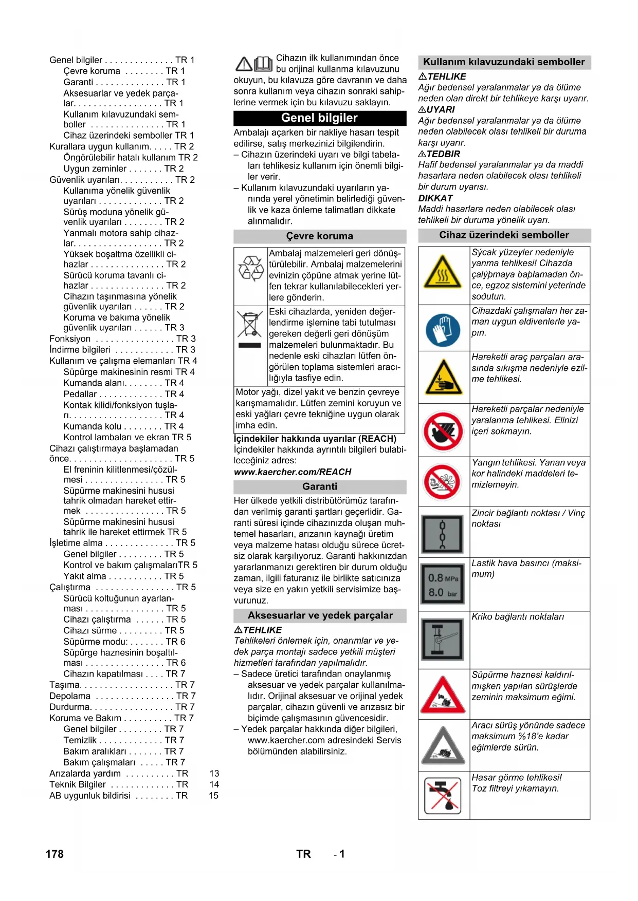2000/14/EΚ: Παράρτημα V στάθμη ηχητικής πίεσης dB(A) Μετρημένη: 99 Εγγυημένη: 102 Chairman of the Board of Management Director Regulatory Affairs & Certification 177EL- 1 Cihazın ilk kullanımından önce bu orijinal kullanma kılavuzunu okuyun, bu kılavuza göre davranın ve daha sonra kullanım veya cihazın sonraki sahip- lerine vermek için bu kılavuzu saklayın. Ambalajı açarken bir nakliye hasarı tespit edilirse, satış merkezinizi bilgilendirin. – Cihazın üzerindeki uyarı ve bilgi tabela- ları tehlikesiz kullanım için önemli bilgi- ler verir. – Kullanım kılavuzundaki uyarıların ya- nında yerel yönetimin belirlediği güven- lik ve kaza önleme talimatları dikkate alınmalıdır. İçindekiler hakkında uyarılar (REACH) İçindekiler hakkında ayrıntılı bilgileri bulabi- leceğiniz adres: www.kaercher.com/REACH Her ülkede yetkili distribütörümüz tarafın- dan verilmiş garanti şartları geçerlidir. Ga- ranti süresi içinde cihazınızda oluşan muh- temel hasarları, arızanın kaynağı üretim veya malzeme hatası olduğu sürece ücret- siz olarak karşılıyoruz. Garanti hakkınızdan yararlanmanızı gerektiren bir durum olduğu zaman, ilgili faturanız ile birlikte satıcınıza veya size en yakın yetkili servisimize baş- vurunuz. TEHLIKE Tehlikeleri önlemek için, onarımlar ve ye- dek parça montajı sadece yetkili müşteri hizmetleri tarafından yapılmalıdır. – Sadece üretici tarafından onaylanmış aksesuar ve yedek parçalar kullanılma- lıdır. Orijinal aksesuar ve orijinal yedek parçalar, cihazın güvenli ve arızasız bir biçimde çalışmasının güvencesidir. – Yedek parçalar hakkında diğer bilgileri, www.kaercher.com adresindeki Servis bölümünden alabilirsiniz. TEHLIKE Ağır bedensel yaralanmalar ya da ölüme neden olan direkt bir tehlikeye karşı uyarır. 몇 UYARI Ağır bedensel yaralanmalar ya da ölüme neden olabilecek olası tehlikeli bir duruma karşı uyarır. 몇 TEDBIR Hafif bedensel yaralanmalar ya da maddi hasarlara neden olabilecek olası tehlikeli bir durum uyarısı. DIKKAT Maddi hasarlara neden olabilecek olası tehlikeli bir duruma yönelik uyarı. Genel bilgiler . . . . . . . . . . . . . . TR 1 Çevre koruma . . . . . . . . TR 1 Garanti . . . . . . . . . . . . . . TR 1 Aksesuarlar ve yedek parça- lar. . . . . . . . . . . . . . . . . . TR 1 Kullanım kılavuzundaki sem- boller . . . . . . . . . . . . . . . TR 1 Cihaz üzerindeki semboller TR 1 Kurallara uygun kullanım. . . . . TR 2 Öngörülebilir hatalı kullanım TR 2 Uygun zeminler . . . . . . . TR 2 Güvenlik uyarıları. . . . . . . . . . . TR 2 Kullanıma yönelik güvenlik uyarıları . . . . . . . . . . . . . TR 2 Sürüş moduna yönelik gü- venlik uyarıları . . . . . . . . TR 2 Yanmalı motora sahip cihaz- lar. . . . . . . . . . . . . . . . . . TR 2 Yüksek boşaltma özellikli ci- hazlar . . . . . . . . . . . . . . . TR 2 Sürücü koruma tavanlı ci- hazlar . . . . . . . . . . . . . . . TR 2 Cihazın taşınmasına yönelik güvenlik uyarıları . . . . . . TR 2 Koruma ve bakıma yönelik güvenlik uyarıları . . . . . . TR 3 Fonksiyon . . . . . . . . . . . . . . . . TR 3 İndirme bilgileri . . . . . . . . . . . . TR 3 Kullanım ve çalışma elemanları TR 4 Süpürge makinesinin resmi TR 4 Kumanda alanı. . . . . . . . TR 4 Pedallar . . . . . . . . . . . . . TR 4 Kontak kilidi/fonksiyon tuşla- rı. . . . . . . . . . . . . . . . . . . TR 4 Kumanda kolu . . . . . . . . TR 4 Kontrol lambaları ve ekran TR 5 Cihazı çalıştırmaya başlamadan önce. . . . . . . . . . . . . . . . . . . . . TR 5 El freninin kilitlenmesi/çözül- mesi . . . . . . . . . . . . . . . . TR 5 Süpürme makinesini hususi tahrik olmadan hareket ettir- mek . . . . . . . . . . . . . . . . TR 5 Süpürme makinesini hususi tahrik ile hareket ettirmek TR 5 İşletime alma . . . . . . . . . . . . . . TR 5 Genel bilgiler . . . . . . . . . TR 5 Kontrol ve bakım çalışmalarıTR 5 Yakıt alma . . . . . . . . . . . TR 5 Çalıştırma . . . . . . . . . . . . . . . . TR 5 Sürücü koltuğunun ayarlan- ması . . . . . . . . . . . . . . . . TR 5 Cihazı çalıştırma . . . . . . TR 5 Cihazı sürme . . . . . . . . . TR 5 Süpürme modu: . . . . . . . TR 6 Süpürge haznesinin boşaltıl- ması . . . . . . . . . . . . . . . . TR 6 Cihazın kapatılması . . . . TR 7 Taşıma. . . . . . . . . . . . . . . . . . . TR 7 Depolama . . . . . . . . . . . . . . . . TR 7 Durdurma. . . . . . . . . . . . . . . . . TR 7 Koruma ve Bakım . . . . . . . . . . TR 7 Genel bilgiler . . . . . . . . . TR 7 Temizlik . . . . . . . . . . . . . TR 7 Bakım aralıkları . . . . . . . TR 7 Bakım çalışmaları . . . . . TR 7 Arızalarda yardım . . . . . . . . . . TR 13 Teknik Bilgiler . . . . . . . . . . . . . TR 14 AB uygunluk bildirisi . . . . . . . . TR 15 Genel bilgiler Çevre koruma Ambalaj malzemeleri geri dönüş- türülebilir. Ambalaj malzemelerini evinizin çöpüne atmak yerine lüt- fen tekrar kullanılabilecekleri yer- lere gönderin. Eski cihazlarda, yeniden değer- lendirme işlemine tabi tutulması gereken değerli geri dönüşüm malzemeleri bulunmaktadır. Bu nedenle eski cihazları lütfen ön- görülen toplama sistemleri aracı- lığıyla tasfiye edin. Motor yağı, dizel yakıt ve benzin çevreye karışmamalıdır. Lütfen zemini koruyun ve eski yağları çevre tekniğine uygun olarak imha edin. Garanti Aksesuarlar ve yedek parçalar Kullanım kılavuzundaki semboller Cihaz üzerindeki semboller Sýcak yüzeyler nedeniyle yanma tehlikesi! Cihazda çalýþmaya baþlamadan ön- ce, egzoz sistemini yeterinde soðutun. Cihazdaki çalışmaları her za- man uygun eldivenlerle ya- pın. Hareketli araç parçaları ara- sında sıkışma nedeniyle ezil- me tehlikesi. Hareketli parçalar nedeniyle yaralanma tehlikesi. Elinizi içeri sokmayın. Yangın tehlikesi. Yanan veya kor halindeki maddeleri te- mizleme