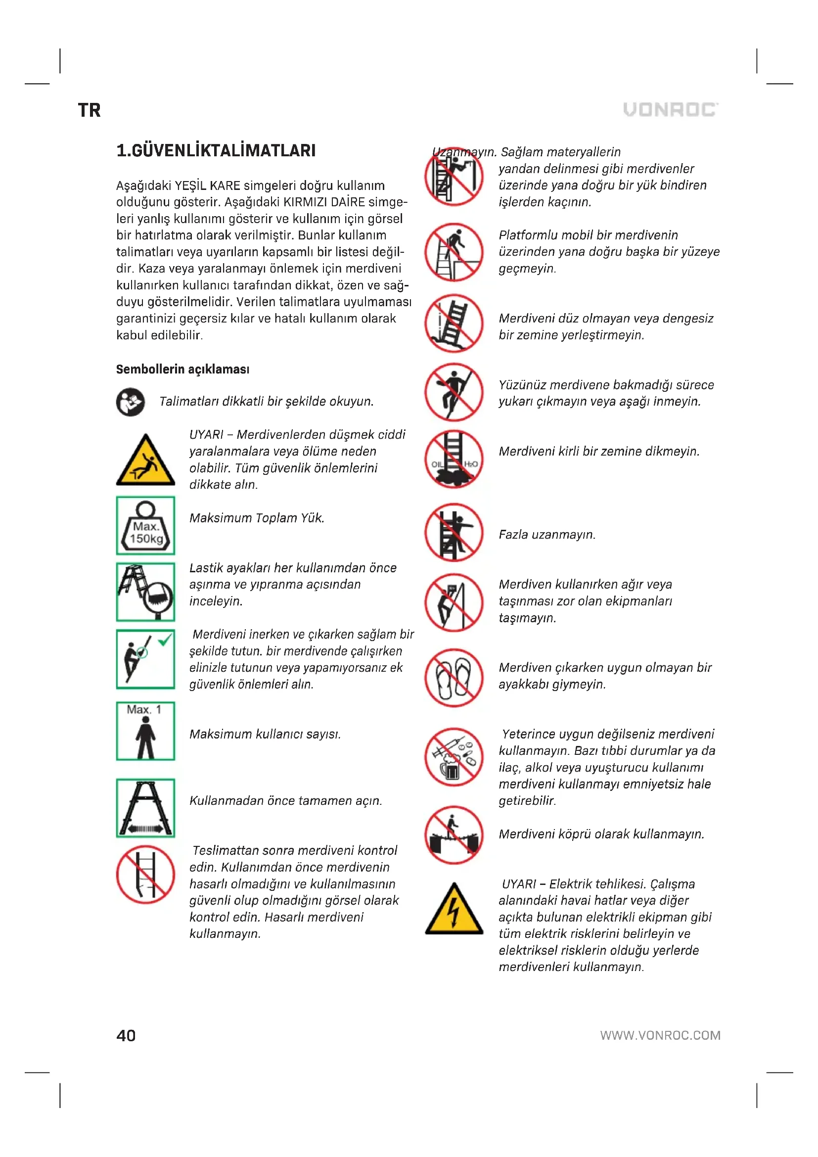 Aşağıdaki YEŞİL KARE simgeleri doğru kullanım olduğunu gösterir. Aşağıdaki KIRMIZI DAİRE simge- leri yanlış kullanımı gösterir ve kullanım için görsel bir hatırlatma olarak verilmiştir. Bunlar kullanım talimatları veya uyarıların kapsamlı bir listesi değil- dir. Kaza veya yaralanmayı önlemek için merdiveni kullanırken kullanıcı tarafından dikkat, özen ve sağ- duyu gösterilmelidir. Verilen talimatlara uyulmaması garantinizi geçersiz kılar ve hatalı kullanım olarak kabul edilebilir. Sembollerin açıklaması Talimatları dikkatli bir şekilde okuyun. UYARI – Merdivenlerden düşmek ciddi yaralanmalara veya ölüme neden olabilir. Tüm güvenlik önlemlerini dikkate alın. Maksimum Toplam Yük. Lastik ayakları her kullanımdan önce aşınma ve yıpranma açısından inceleyin. Merdiveni inerken ve çıkarken sağlam bir şekilde tutun. bir merdivende çalışırken elinizle tutunun veya yapamıyorsanız ek güvenlik önlemleri alın. Maksimum kullanıcı sayısı. Kullanmadan önce tamamen açın. Teslimattan sonra merdiveni kontrol edin. Kullanımdan önce merdivenin hasarlı olmadığını ve kullanılmasının güvenli olup olmadığını görsel olarak kontrol edin. Hasarlı merdiveni kullanmayın. Uzanmayın. Sağlam materyallerin yandan delinmesi gibi merdivenler üzerinde yana doğru bir yük bindiren işlerden kaçının. Platformlu mobil bir merdivenin üzerinden yana doğru başka bir yüzeye geçmeyin. Merdiveni düz olmayan veya dengesiz bir zemine yerleştirmeyin. Yüzünüz merdivene bakmadığı sürece yukarı çıkmayın veya aşağı inmeyin. Merdiveni kirli bir zemine dikmeyin. Fazla uzanmayın. Merdiven kullanırken ağır veya taşınması zor olan ekipmanları taşımayın. Merdiven çıkarken uygun olmayan bir ayakkabı giymeyin. Yeterince uygun değilseniz merdiveni kullanmayın. Bazı tıbbi durumlar ya da ilaç, alkol veya uyuşturucu kullanımı merdiveni kullanmayı emniyetsiz hale getirebilir. Merdiveni köprü olarak kullanmayın. UYARI – Elektrik tehlikesi. Çalışma alanındaki havai hatlar veya diğer açıkta bulunan elektrikli ekipman gibi tüm elektrik risklerini belirleyin ve elektriksel risklerin olduğu yerlerde merdivenleri kullanmayın.TR