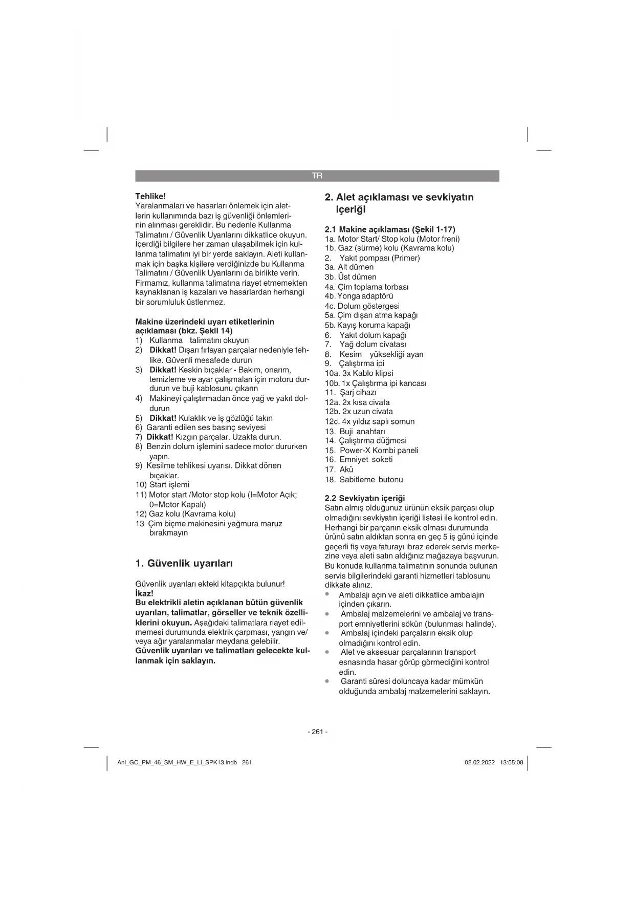 Onarım veya bakım çalışmalarından sonra tüm iş güvenliği parçalarının takılmış olup olmadığını ve bunların mükemmel durumda olup olmadıklarını kontrol edin. Yaralanmaya sebep olacak parçaları üçüncü şahıslar ve çocukların erişemeyeceği yer- de saklayın. Uyarı! Ürün sorumluluğu kanununa göre tali- matlara aykırı yapılan onarım çalışmaları veya orijinal parça kullanılmaması veya fi rmamız tarafından kullanımına izin verilmemiş parçaların kullanılmasından kaynaklanan hasarlardan fi rmamız herhangi bir sorumluluk üstlenmez. Aynı şekilde uygun şekilde yapılmayan onarım çalışmaları sonucunda meydana gelen hasarlar- dan da fi rmamız herhangi bir sorumluluk üstlen- mez. Bu çalışmalar için yetkili servis veya uzman bir eleman görevlendirin. Bu durum aynı zamanda aksesuar parçaları için de geçerlidir. Anl_GC_PM_46_SM_HW_E_Li_SPK13.indb 267Anl_GC_PM_46_SM_HW_E_Li_SPK13.indb 267 02.02.2022 13:55:0902.02.2022 13:55:09TR