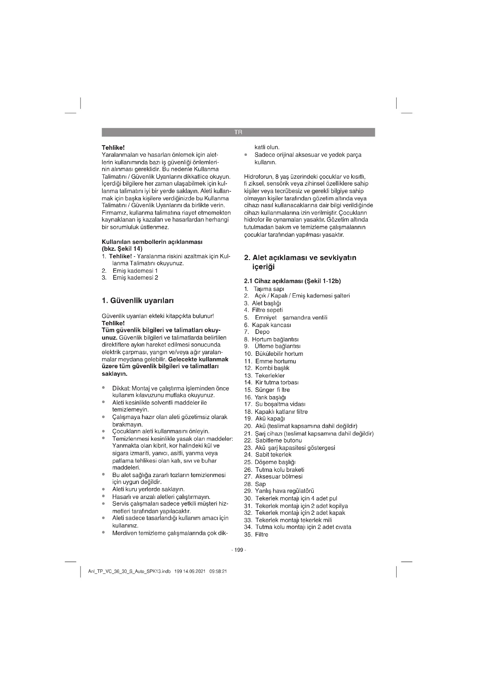 ve aküyü lütfen müşteri hizmetleri bölümümüze gönderin. Talimatlara uygun şekilde yapılacak bir tesli- mat için müşteri hizmetleri departmanımıza veya aleti aldığınız satış noktasına başvurun. Akülerin veya akülü aletlerin teslimatı veya bertaraf edilmesinde, kısa devre yaparak yangına yol açmaması için bu ürünlerin Anl_TP_VC_36_30_S_Auto_SPK13.indb 201 14.09.2021 09:58:21TR